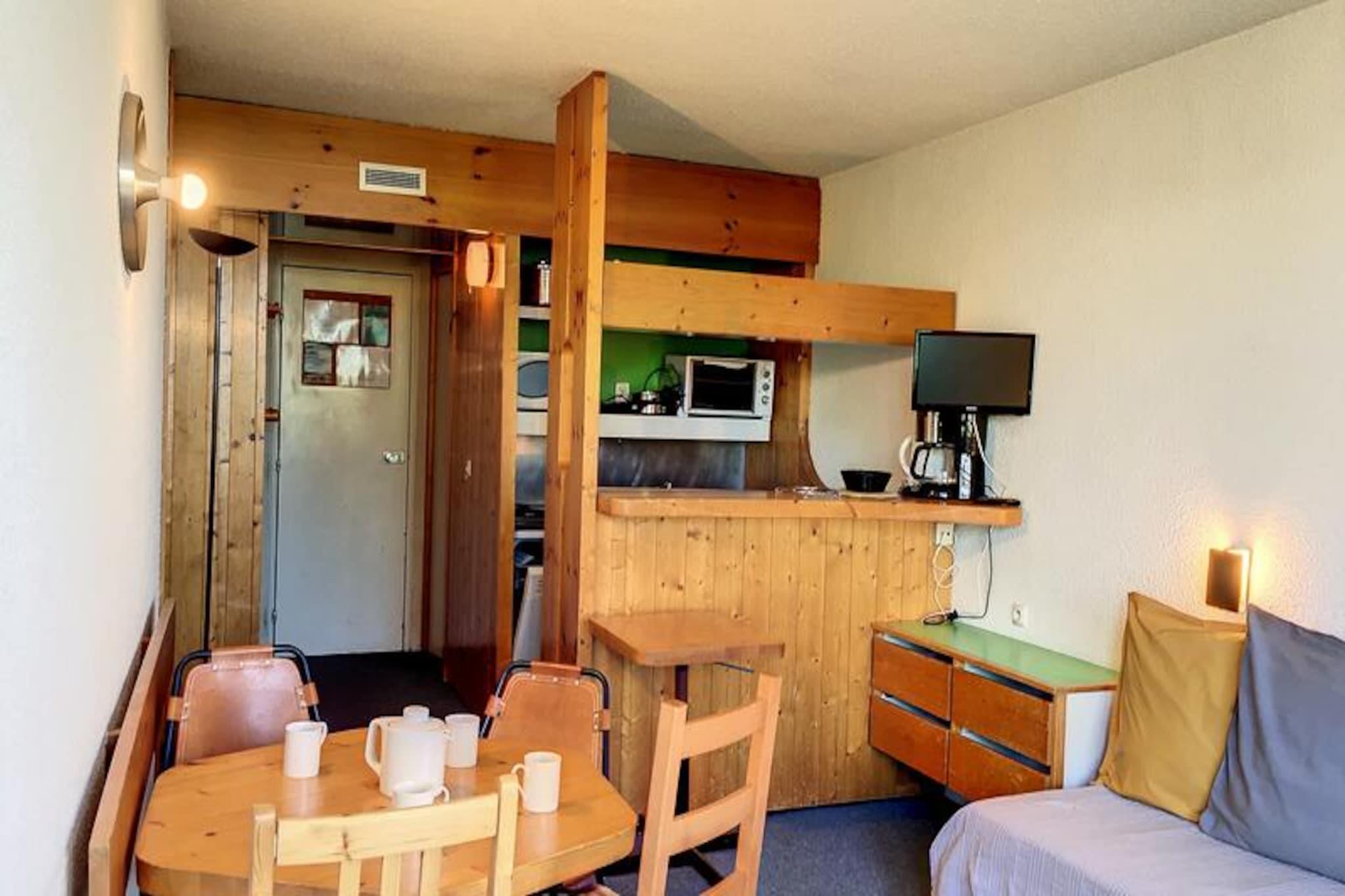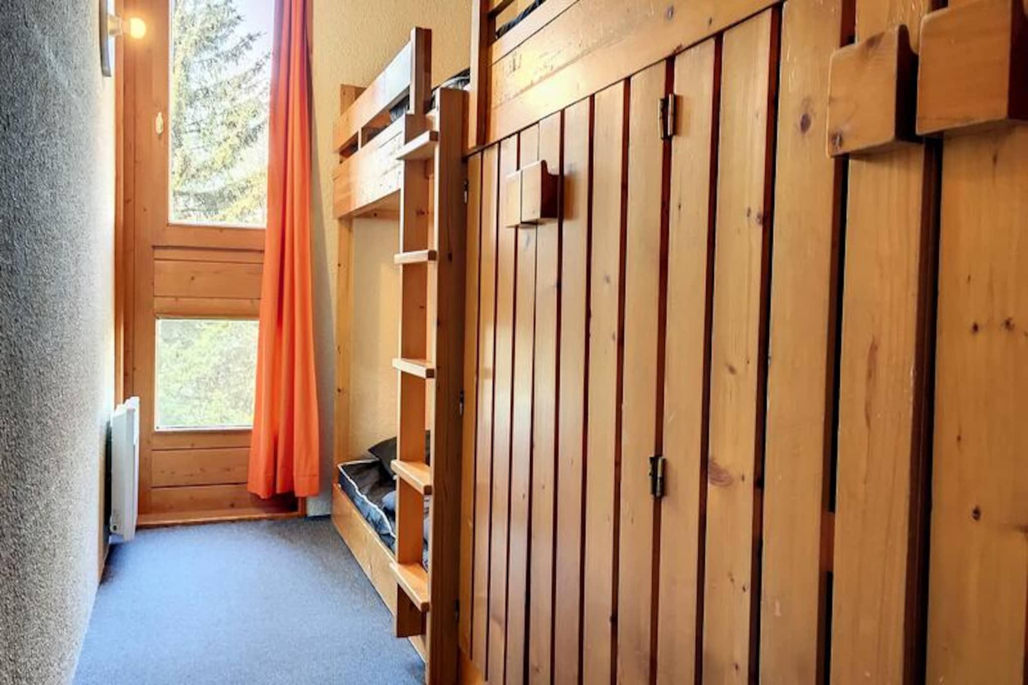 Denne dejlige lejlighed, badet i sollys og beliggende over den charmerende nedre plads i Village des Villards, tilbyder et roligt tilflugtssted i hjertet af Les Arcs 1800. Fra den sydvestvendte balkon kan du nyde panoramaudsigten over dalen, mens du nyder varmen fra den alpine sol. Uanset om du søger en hyggelig vinterferie eller et sommereventyr, inviterer denne bolig dig til at opleve magien i de franske alper i komfort og stil. \n\nTræd indenfor i denne gennemtænkte lejlighed på 33 m², perfekt til op til fem gæster. Rummet har en indbydende entré, et separat toilet og et fuldt udstyret tekøkken med moderne apparater, herunder ovn, mikrobølgeovn, køleskab og opvaskemaskine. Stuen har to enkeltsenge og et fladskærms-tv, hvilket skaber et hyggeligt sted at slappe af efter en dag med udforskning. Soveværelset i SNCF-stil har tre enkeltsenge, herunder to køjesenge, hvilket gør det ideelt til familier eller små grupper. Et badeværelse med badekar fuldender planløsningen og sikrer bekvemmelighed og afslapning. \n\nBeliggende i det rolige Villards-område er boligen let tilgængelig med elevatorer og nærliggende parkeringsmuligheder, herunder Villards overdækkede parkering og Chante Mouche udendørs parkering. Shuttle-holdepladsen mellem stationerne ved Villards togstation sikrer problemfri forbindelse til de omkringliggende attraktioner. \n\nMed miljøvenligt sengelinned og valgfri slutrengøring kombinerer denne lejlighed bæredygtighed med komfort. Uanset om du er her for at stå på ski på de legendariske pister i Les Arcs eller udforske de frodige stier om sommeren, tilbyder denne bolig en perfekt base for uforglemmelige alpine minder.