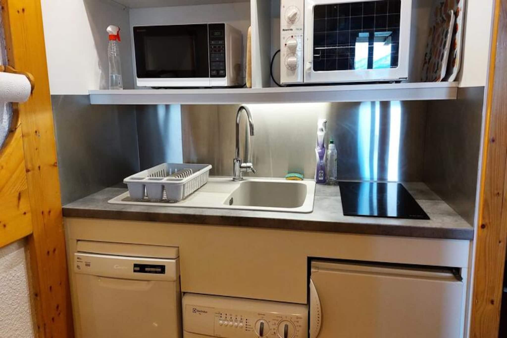 Højt over Tarentaise-dalen, hvor den alpine luft er frisk, og udsigten uendelig, tilbyder Nova Residence en rolig tilflugtssted for dine bjergeventyr. Beliggende ved krydset mellem Villards og Charvet, er denne residens perfekt placeret for både vintersportsentusiaster og sommerudforskere. Forestil dig at vågne op til det betagende panorama af snedækkede tinder eller frodige grønne dale fra din sydvestvendte balkon, et landskab der sætter tonen for en uforglemmelig dag i Alperne. Denne hyggelige lejlighed på 40 m², beliggende på 11. sal, har komfortabel plads til op til fem gæster. Opholdsstuen har to enkeltsenge, mens soveværelset har to enkeltsenge og en enkelt køjeseng, ideelt til familier eller små grupper. Det fuldt udstyrede køkken med miniovn, køleskab, opvaskemaskine og mere giver dig mulighed for at tilberede solide måltider efter en dag med eventyr. Moderne bekvemmeligheder såsom Wi-Fi, fjernsyn og vaskemaskine sikrer et behageligt og problemfrit ophold. Træd udenfor, og du vil finde dig selv ved foden af ??pisterne, med Vagère-stoleliften og Villards-gondolen kun få øjeblikke væk, der tilbyder problemfri adgang til det vidtstrakte Paradiski-skiområde. ESF-skiskolen ligger kun 20 meter fra boligen, hvilket gør den til et perfekt valg for familier med spirende skiløbere. Om sommeren forbinder den gratis shuttlebus, der stopper kun 200 meter væk, dig med vandrestier, mountainbikeruter og de pulserende lokale landsbyer. Supermarkeder, barer, restauranter og endda en lægeklinik ligger alle inden for kort gåafstand, hvilket sikrer, at alle bekvemmeligheder er lige ved hånden. Uanset om du er her for at grave dig gennem uberørt sne eller udforske de alpine enge, er Nova Residence den ideelle base for at skabe dyrebare minder i hjertet af Les Arcs 1800.