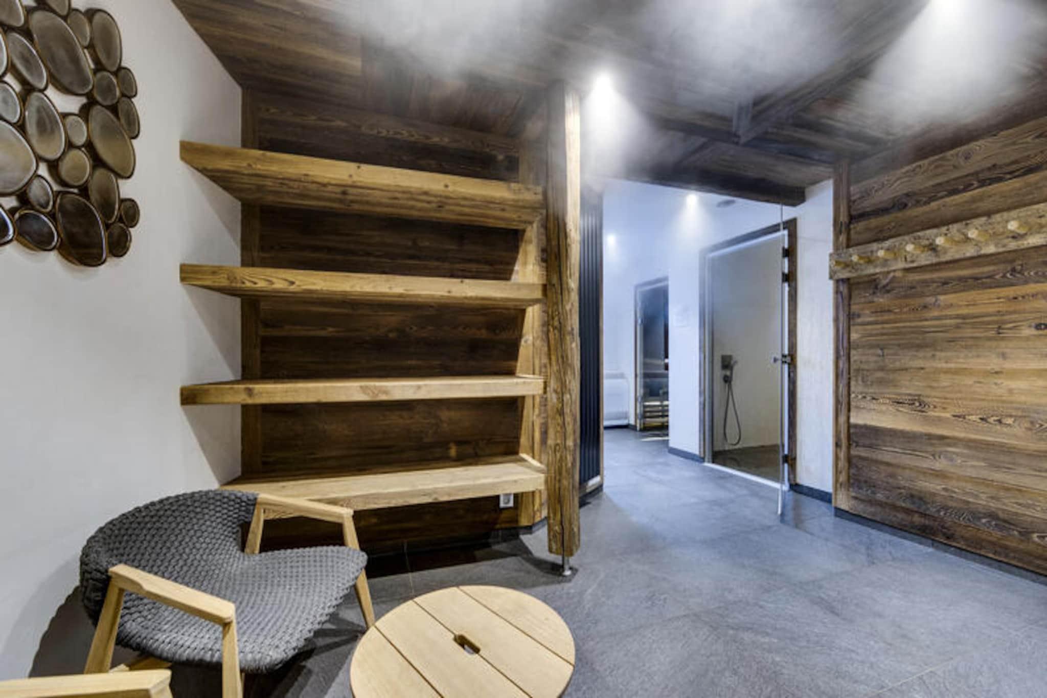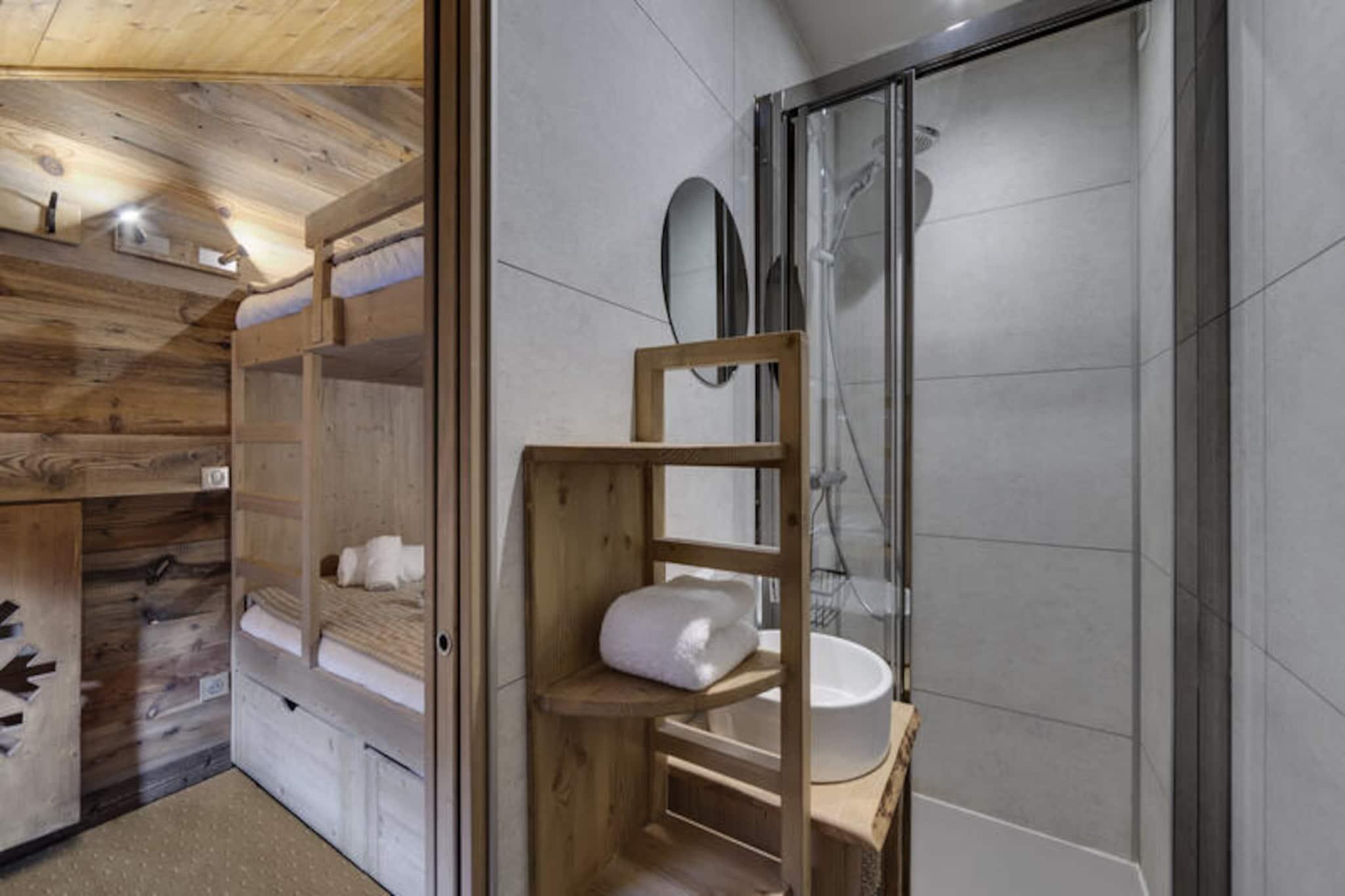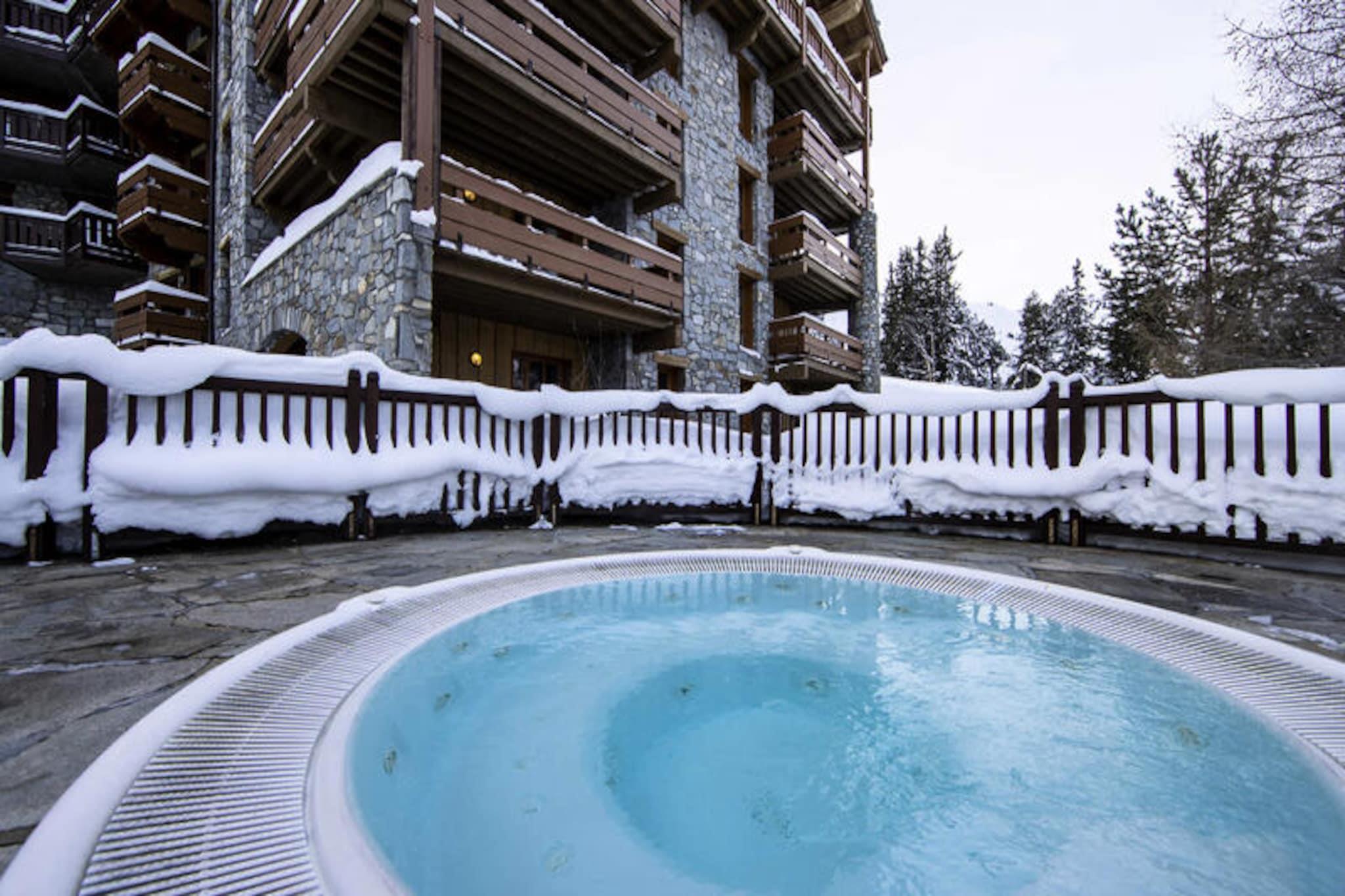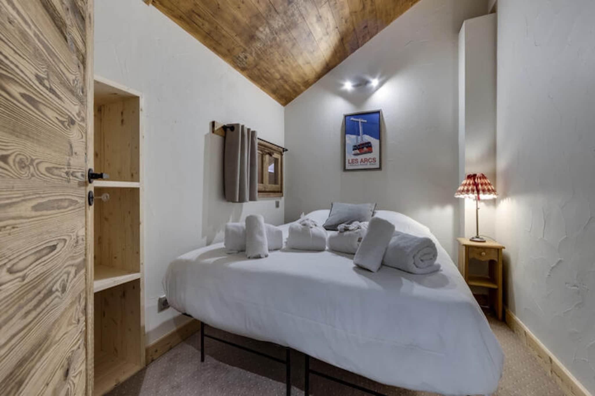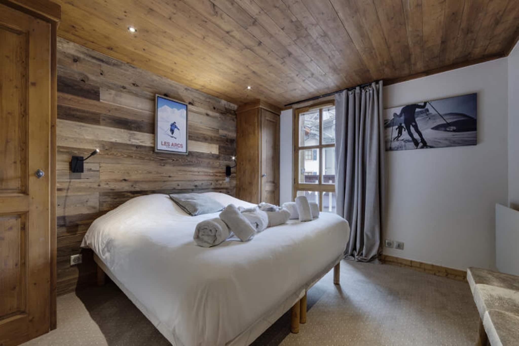 I den fortryllende gågadelandsby Arc 1950, hvor alpin charme møder moderne luksus, tilbyder denne førsteklasses 5-stjernede residens et uforglemmeligt bjergparadis. Omgivet af den betagende udsigt over Paradiski-skiområdet, med 425 km uberørte pister lige uden for døren, er denne ski-in/ski-out-ejendom et paradis for både vintersportsentusiaster og naturelskere. Refuge du Montagnard Residence kombinerer den hyggelige atmosfære i en traditionel alpelandsby med faciliteter i verdensklasse for at sikre et virkelig mindeværdigt ophold. \n\nLejligheden er på 117 m² og har komfortabel plads til op til 10 gæster fordelt på fire smukt indrettede soveværelser, en mezzanin med køjesenge og tre elegante badeværelser. Den åbne opholdsstue med fuldt udstyret køkken og spiseplads inviterer dig til at slappe af og dele måltider med dine kære efter en dag på pisterne. Gå ud på balkonen for at nyde den friske bjergluft og den fantastiske udsigt. Gæsterne vil også sætte pris på betænksomme detaljer såsom redte senge ved ankomst, luksuriøst sengetøj og gratis toiletartikler. \n\nResidensen kan prale af et exceptionelt wellness-område med udendørs swimmingpool, jacuzzi, sauna og dampbad, perfekt til afslapning efter en aktiv dag. Ud over residensen tilbyder Arc 1950 en pulserende atmosfære med charmerende gågader, dejlige restauranter og butikker. Om sommeren forvandles området til et paradis for vandrere og cyklister med stier, der snor sig gennem frodige alpine enge og tilbyder panoramaudsigt over de omkringliggende tinder. \n\nUanset om du søger spændende skieventyr eller rolige bjergflugter, tilbyder denne residens den perfekte blanding af komfort, bekvemmelighed og luksus. Skab varige minder i hjertet af de franske alper, hvor hvert øjeblik er indrammet af bjergenes majestætiske skønhed.