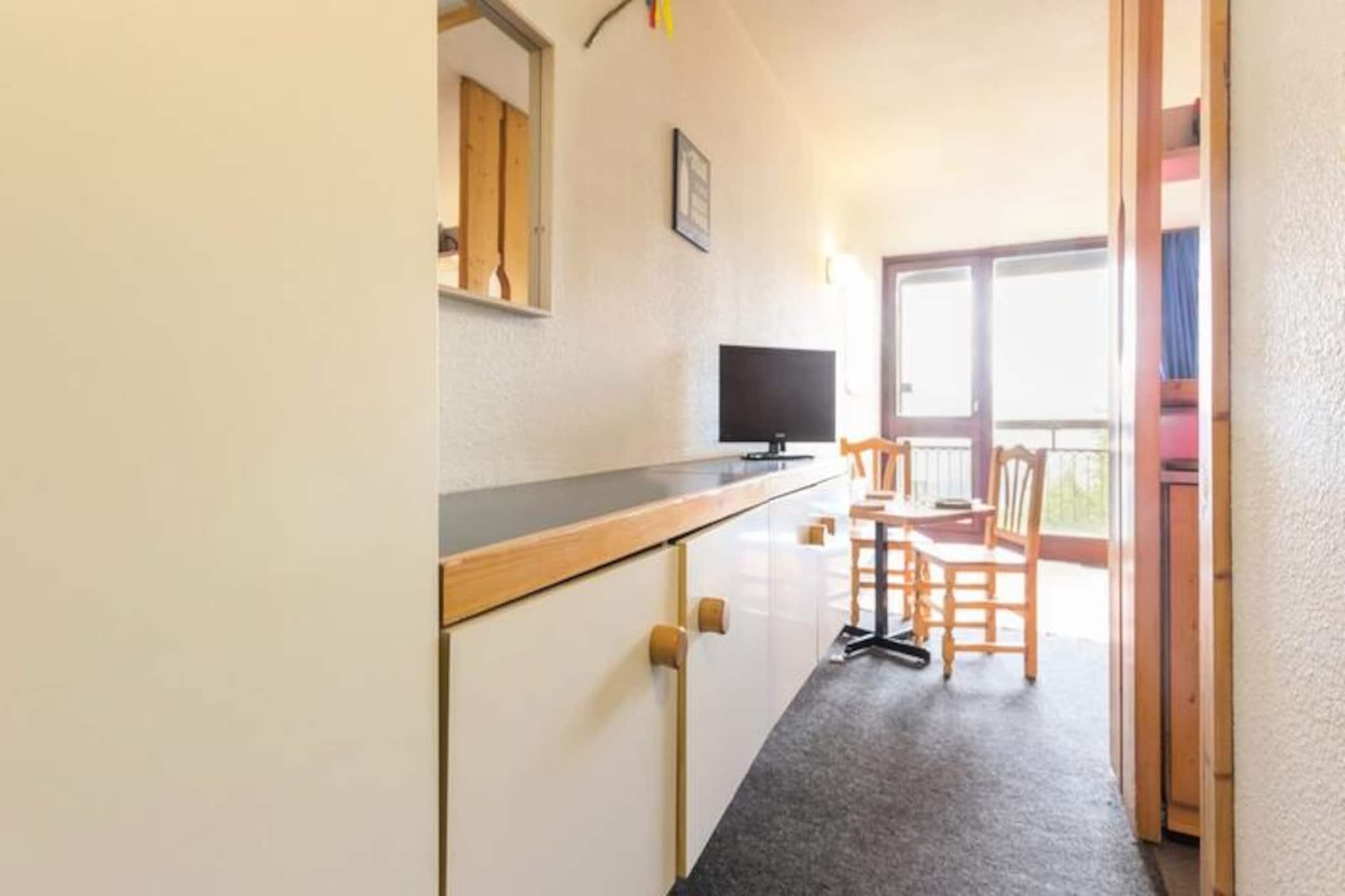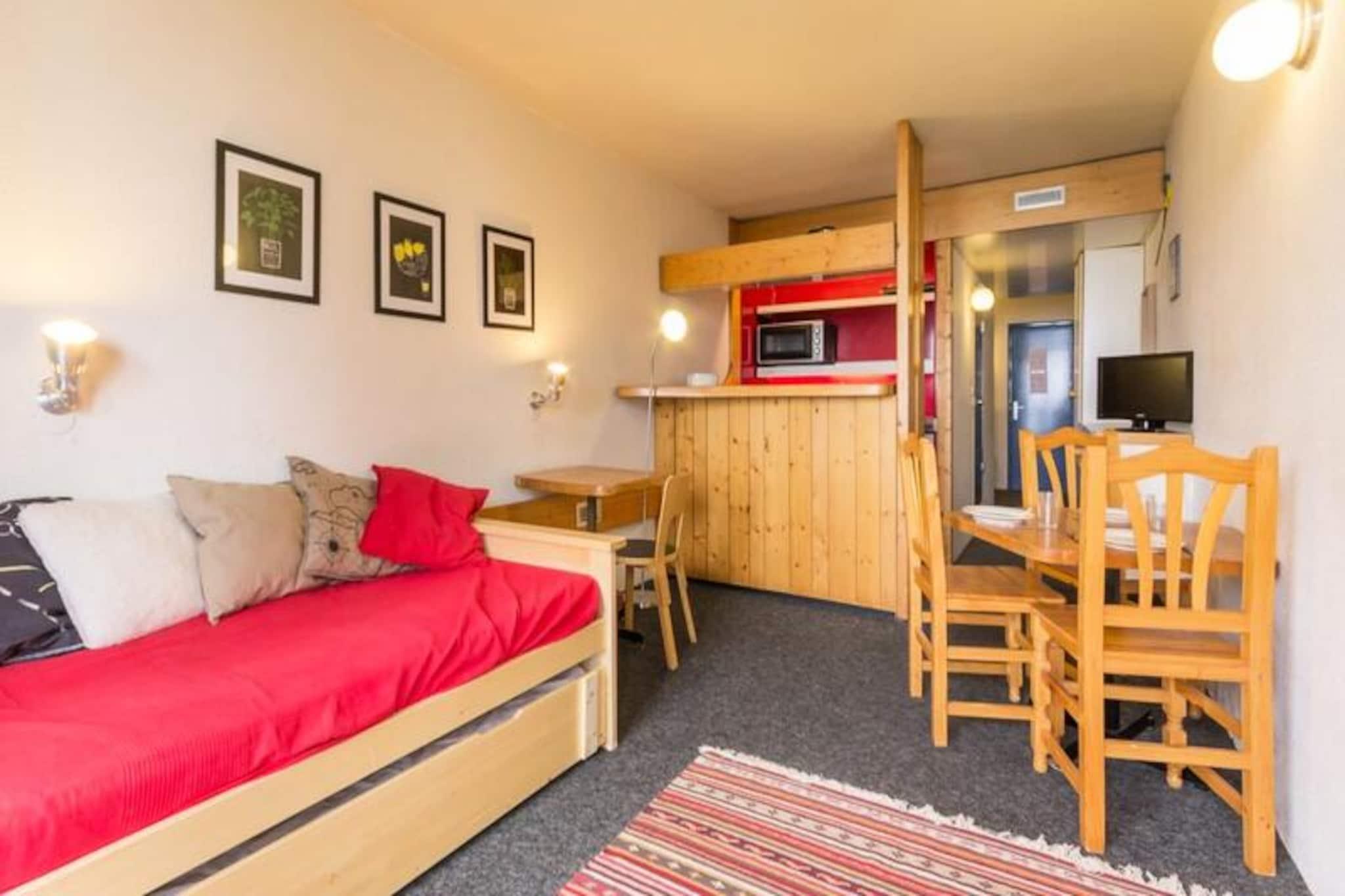 Højt over den charmerende Arc 2000 tilbyder denne hyggelige studiolejlighed en betagende udsigt over Mont Blanc og den omkringliggende dal. Forestil dig at nippe til din morgenkaffe på den nordvendte balkon, mens solen står op over de majestætiske tinder og sætter den perfekte tone for en dag med alpint eventyr. Uanset om du er her for at grave dig gennem uberørte skråninger eller blot nyde den fredfyldte bjergatmosfære, placerer denne bolig dig i hjertet af det hele. \n\nDet 29 m² store studio er designet til op til fem gæster og maksimerer komfort og funktionalitet. Entréen har to køjesenge og en udtræksseng, mens opholdsstuen tilbyder en sovesofa og en ekstra udtræksseng. Et fladskærms-tv og et fuldt udstyret køkken med miniovn, køleskab, opvaskemaskine og kaffemaskine sikrer et afslappende og bekvemt ophold. Badeværelset er omhyggeligt designet, og miljøvenligt sengetøj og rengøringsservice er tilgængelig for et ekstra strejf af bæredygtighed. \n\nTræd udenfor, og du er kun få øjeblikke fra pisterne, med ski-in-adgang mulig afhængigt af sneforholdene. Boligen er også bekvemt placeret i nærheden af ??shuttle-stoppestedet mellem feriestederne, hvilket gør det nemt at udforske det bredere Paradiski-område. Om vinteren gør den overdækkede Mont Blanc-parkering og den udendørs P3-parkering for foden af ??boligen ankomsten problemfri. \n\nUanset om du er en familie, en gruppe venner eller et par, der søger en romantisk ferie, tilbyder denne studiolejlighed en uovertruffen kombination af komfort, bekvemmelighed og fantastisk naturlig skønhed. Lad magien ved Mont Blanc og den pulserende energi fra Arc 2000 skabe minder, du vil værdsætte for evigt.
