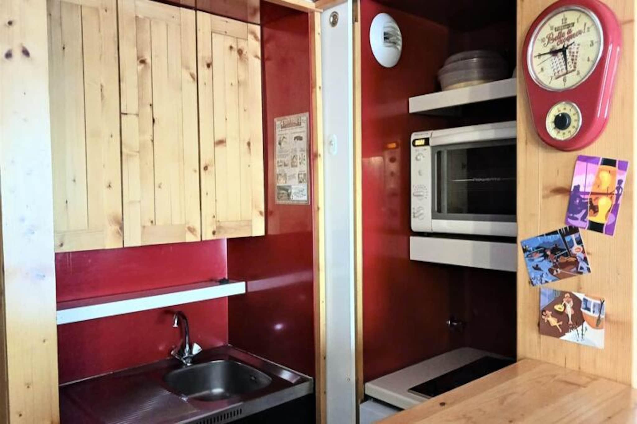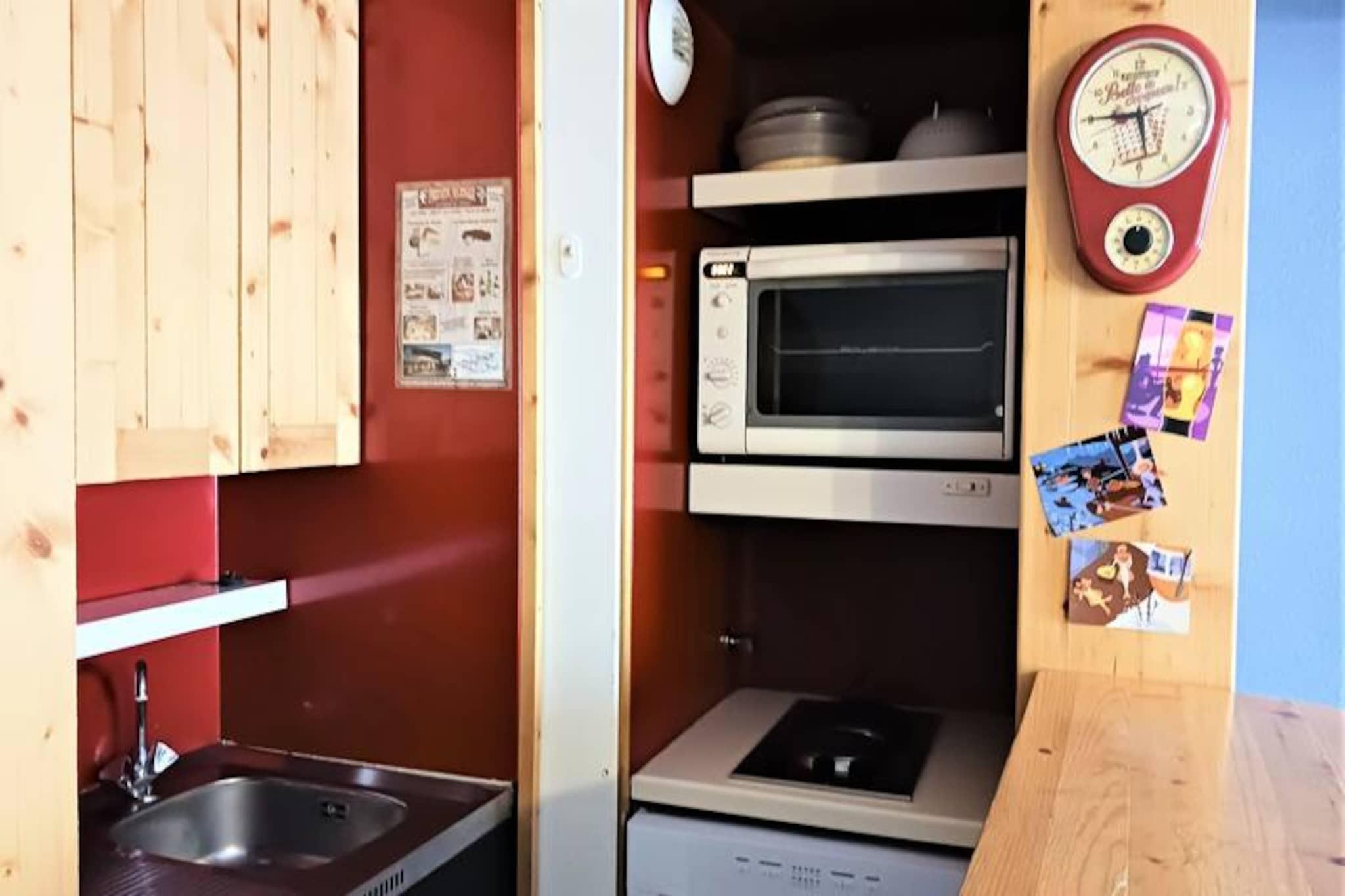 Højt over Tarentaise-dalen tilbyder dette charmerende studie i Arc 2000 et uforglemmeligt alpint tilflugtssted. Med sin førsteklasses beliggenhed på snefronten ved Place Olympique er du kun få skridt fra pisterne, hvilket gør det til et perfekt valg for skientusiaster. Forestil dig at nippe til din morgenkaffe på den sydvendte balkon, mens du nyder panoramaudsigten over de majestætiske bjerge og snedækkede pister, mens de første solstråler oplyser feriestedet. Uanset om du er her for vintersport eller sommervandreture, placerer dette hyggelige tilflugtssted dig i hjertet af begivenhederne. Dette veludstyrede studie på 28 m² er designet til komfortabelt at rumme op til fire gæster. Stuen har to enkeltsenge, mens entréen tilbyder en praktisk udtræksseng, der sikrer afslappende nætter efter dage fyldt med eventyr. Tekøkkenet, der er udstyret med elektrisk komfur, ovn, mikrobølgeovn, køleskab og opvaskemaskine, giver dig mulighed for nemt at tilberede solide måltider. Et lyst badeværelse med badekar og toilet bidrager til komforten, mens fjernsynet sørger for underholdning til hyggelige aftener indendørs. Studiolejligheden ligger på 4. sal i en bolig med elevator og tilbyder nem adgang til nærliggende butikker og faciliteter. Der er overdækket og udendørs parkering ved den nærliggende Lac des Combes, og kæledyr er velkomne mod et ekstra gebyr. Om sommeren lokker de frodige alpine enge og vandrestier, mens vinteren forvandler området til et skiløberparadis. Uanset om du søger spændende nedkørsler på pisterne eller rolige øjeblikke omgivet af naturen, lover denne bolig i Arc 2000 et mindeværdigt ophold. Lad de franske alpers skønhed inspirere dit næste eventyr.