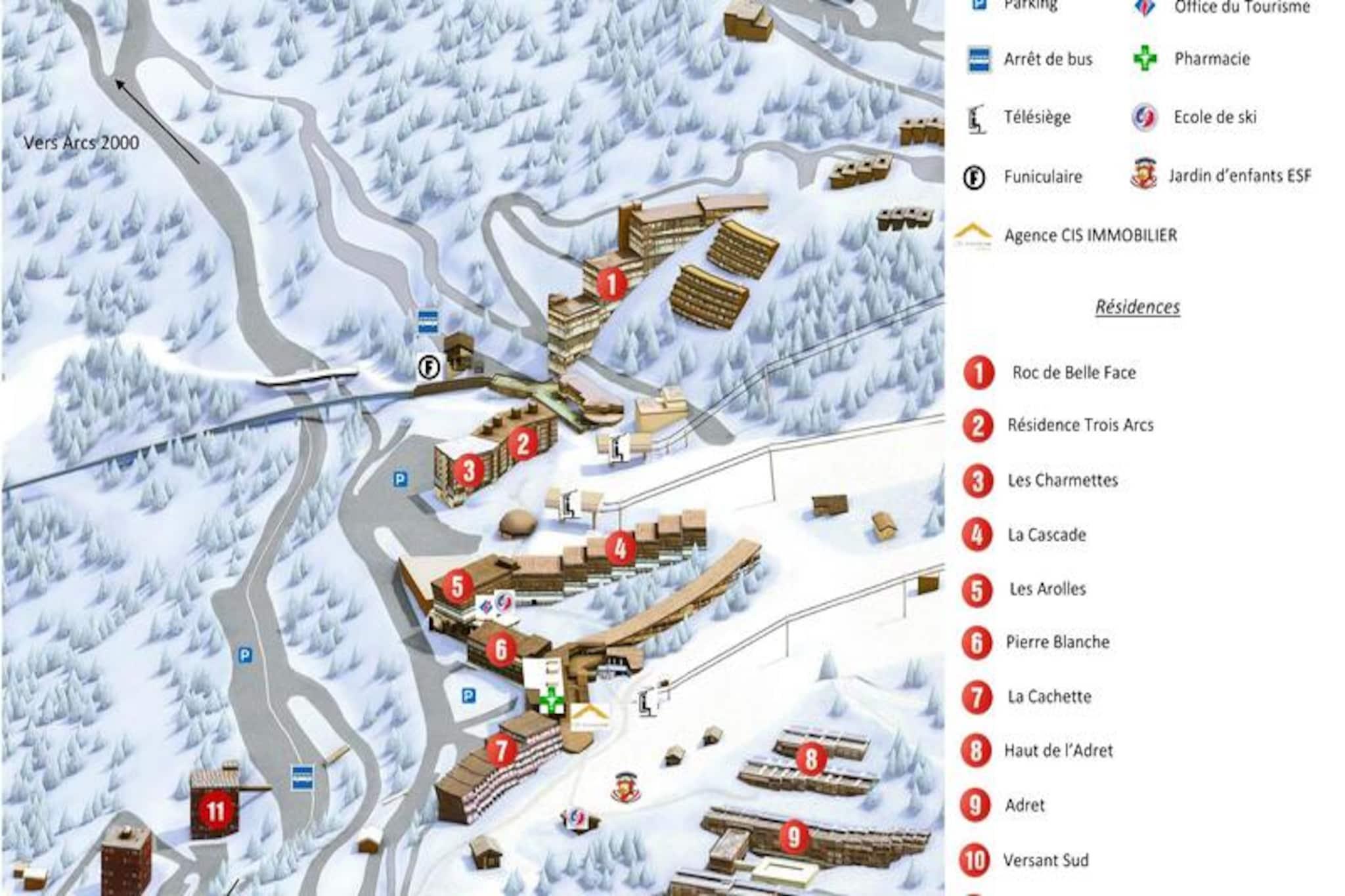 Højt over Tarentaise-dalen tilbyder dette charmerende studie et hyggeligt tilflugtssted med en betagende udsigt over Mont Blanc. Uanset om du søger spændende skieventyr eller rolige sommerferier, placerer denne ejendom dig i hjertet af Arc 1600-resortet, omgivet af alpin skønhed og pulserende landsbyliv. Residensens førsteklasses beliggenhed sikrer nem adgang til skilifte, pister og lokale butikker, hvilket gør det til en perfekt base for at udforske det fantastiske Paradiski-område eller nyde den fredfyldte bjergatmosfære året rundt. \n\nStudioet er designet til op til tre gæster og har en praktisk indretning med en sovesofa til to og en enkeltseng i opholdsstuen. Tekøkkenet er udstyret med moderne apparater, herunder induktionskogeplade, ovn, mikrobølgeovn og køleskab, så du nemt kan tilberede måltider efter en dag med udendørs eventyr. Den nordvendte udsigt fylder rummet med blødt naturligt lys, mens udsigtspunktet på femte sal tilbyder uforstyrret udsigt over Mont Blanc. Yderligere faciliteter såsom et tv med en dvd-afspiller og et skiskab sikrer komfort og bekvemmelighed under hele dit ophold. \n\nTræd udenfor og oplev det pulserende Arc 1600 resort, hvor alt hvad du behøver er inden for gåafstand. Fra skiskoler og udlejningsbutikker til hyggelige restauranter og afterski-steder summer landsbyen af ??aktivitet om vinteren. Om sommeren forvandles regionen til et paradis for vandrere og cyklister med stier, der fører til ærefrygtindgydende udsigter og skjulte alpine skatte. \n\nUanset om du er tiltrukket af spændingen på pisterne eller roen på bjergstierne, lover dette studie en uforglemmelig ferie i hjertet af de franske alper. Lad den majestætiske Mont Blanc være din baggrund, mens du skaber varige minder i dette idylliske alpine tilflugtssted.