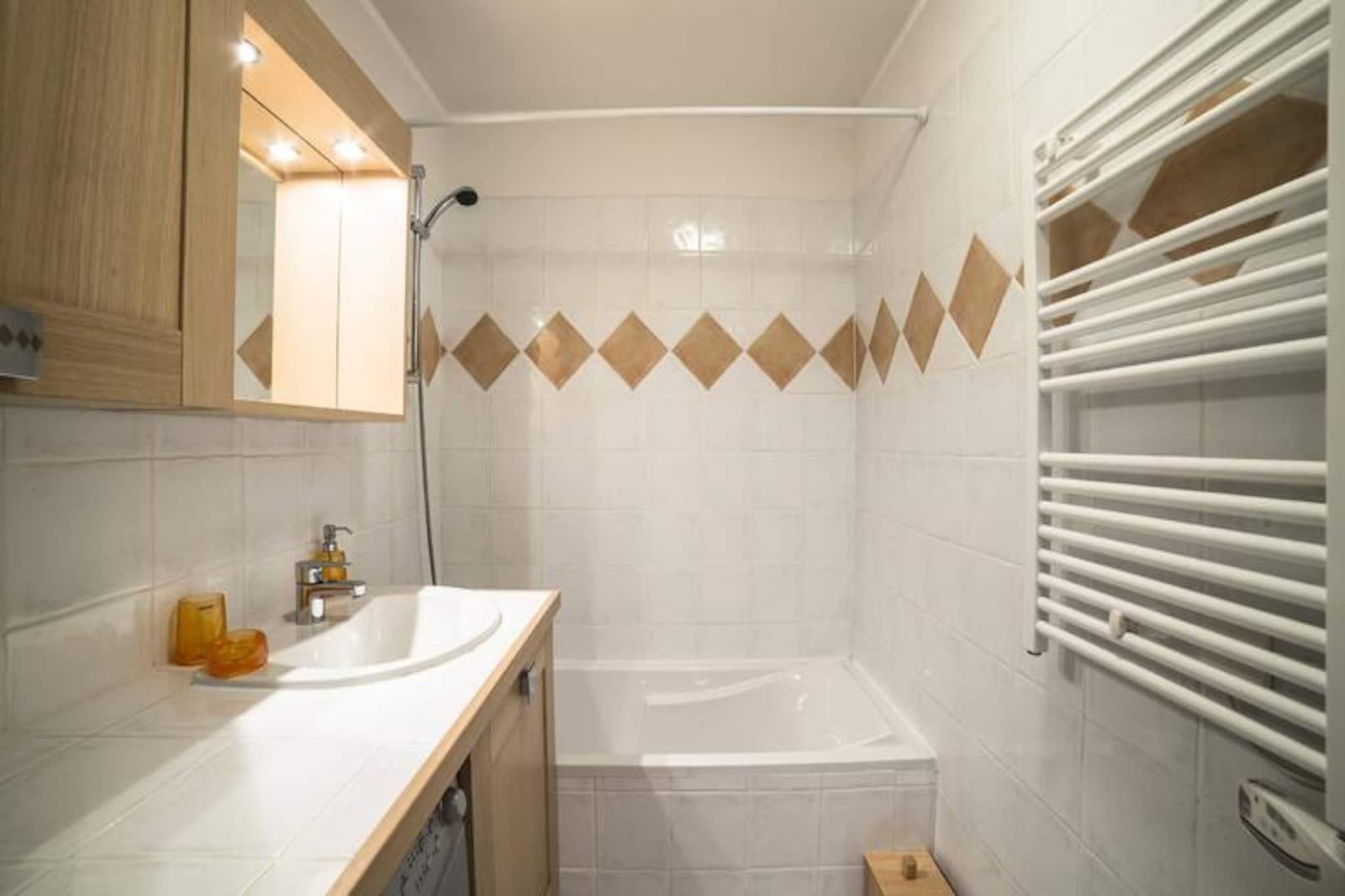 På de fredfyldte skråninger af Arc 1800 tilbyder denne elegante lejlighed i den prestigefyldte L'Iseran-residens et roligt alpint tilflugtssted med en betagende udsigt over Mont Blanc. Ejendommen er perfekt placeret med direkte adgang til skiløb og kombinerer moderne luksus med charmen ved bjerglivet. Uanset om du søger spændende vintereventyr eller fredelige sommervandreture, er denne residens din port til det bedste af de franske alper. Den opvarmede indendørs pool og solarium giver en afslappende tilflugt efter en dag med udforskning, mens den overdækkede parkeringsplads sikrer bekvemmelighed under hele dit ophold. \n\nDenne 55 m² store lejlighed har komfortabel plads til op til seks gæster. Den gennemtænkte planløsning omfatter en hyggelig stue med sovesofa, et soveværelse med dobbeltseng og eget brusebad samt et andet soveværelse med to enkeltsenge. Det fuldt udstyrede køkken har keramisk kogeplade, opvaskemaskine, ovn og specialapparater som raclette- og fondue-sæt, perfekt til at dele solide måltider. Yderligere faciliteter såsom Wi-Fi, Wii-konsol, vaskemaskine og skiboks forbedrer dit ophold og sikrer komfort og praktisk anvendelighed for både familier og grupper. \n\nBeliggende i det fredelige Le Chantel-kvarter, er denne ejendom kun få minutter fra feriestedets centrum via Dahu-svævebanen eller gratis shuttle-service. I nærheden finder du gourmetmad på restauranten Voga Goga og et praktisk købmandsforretning. Les Arcs tilbyder aktiviteter året rundt, lige fra skiløb i det store Paradiski-område til sommereventyr i Vanoise Nationalpark. Med sin blanding af naturlig skønhed og pulserende landsbyliv er denne ejendom et ideelt valg til uforglemmelige bjergture.