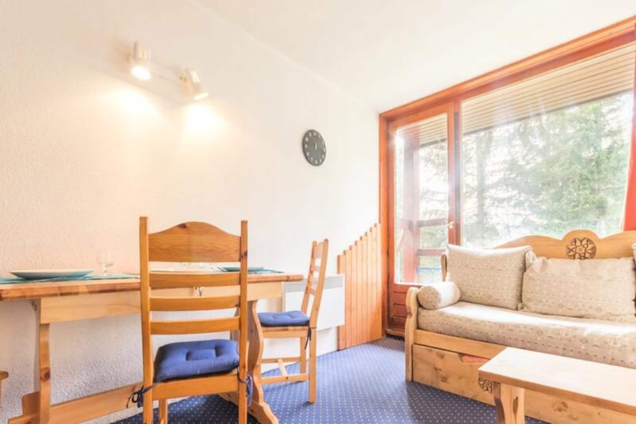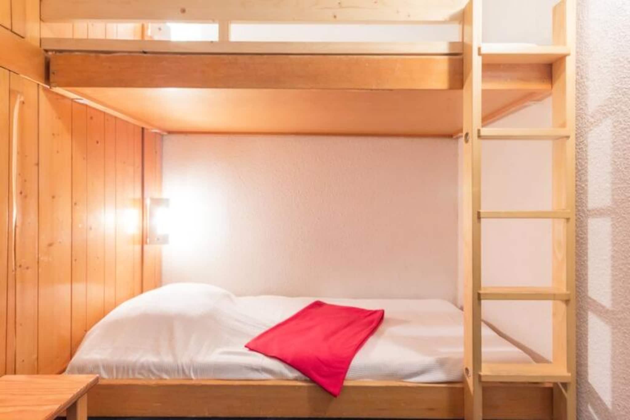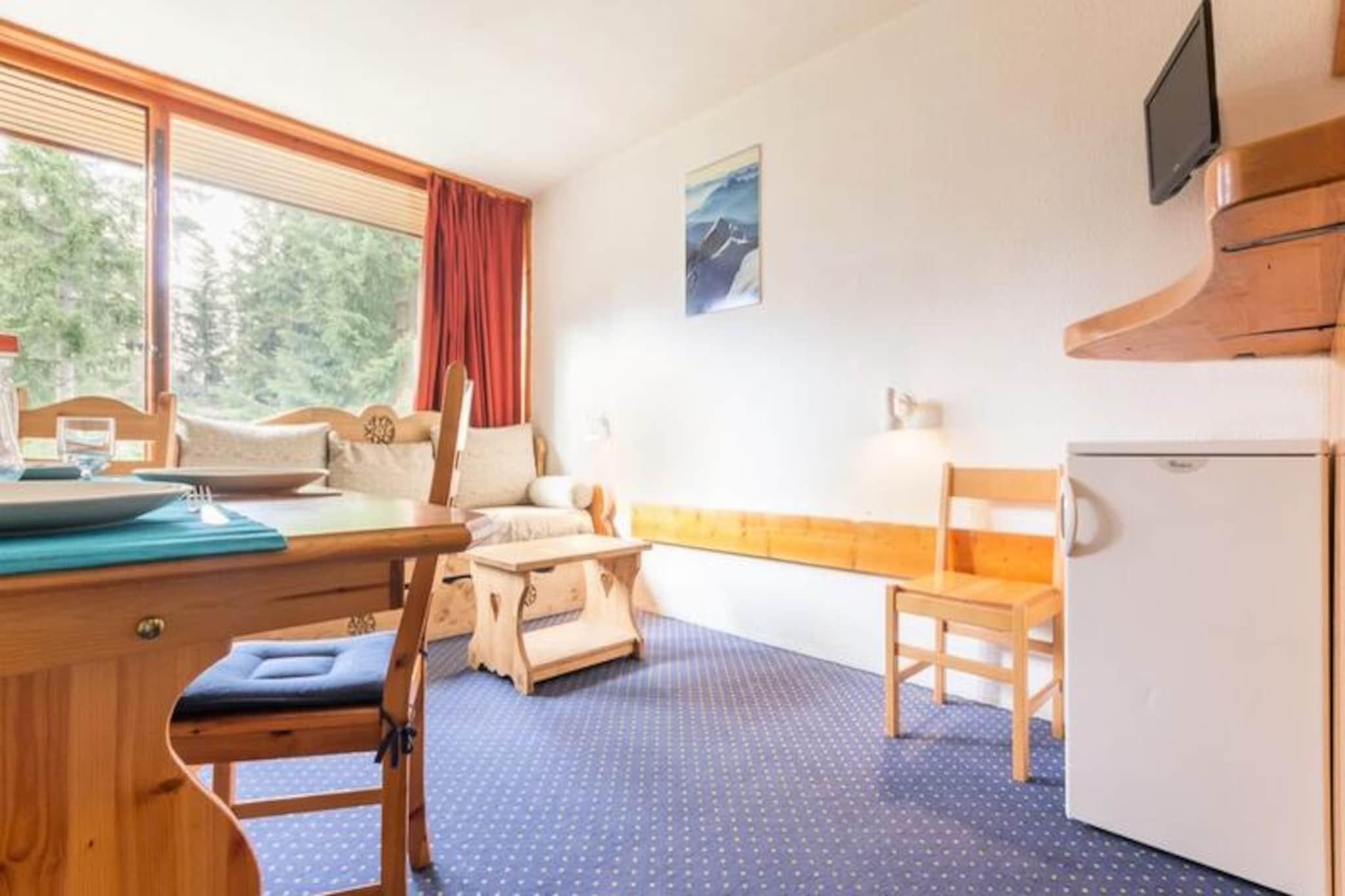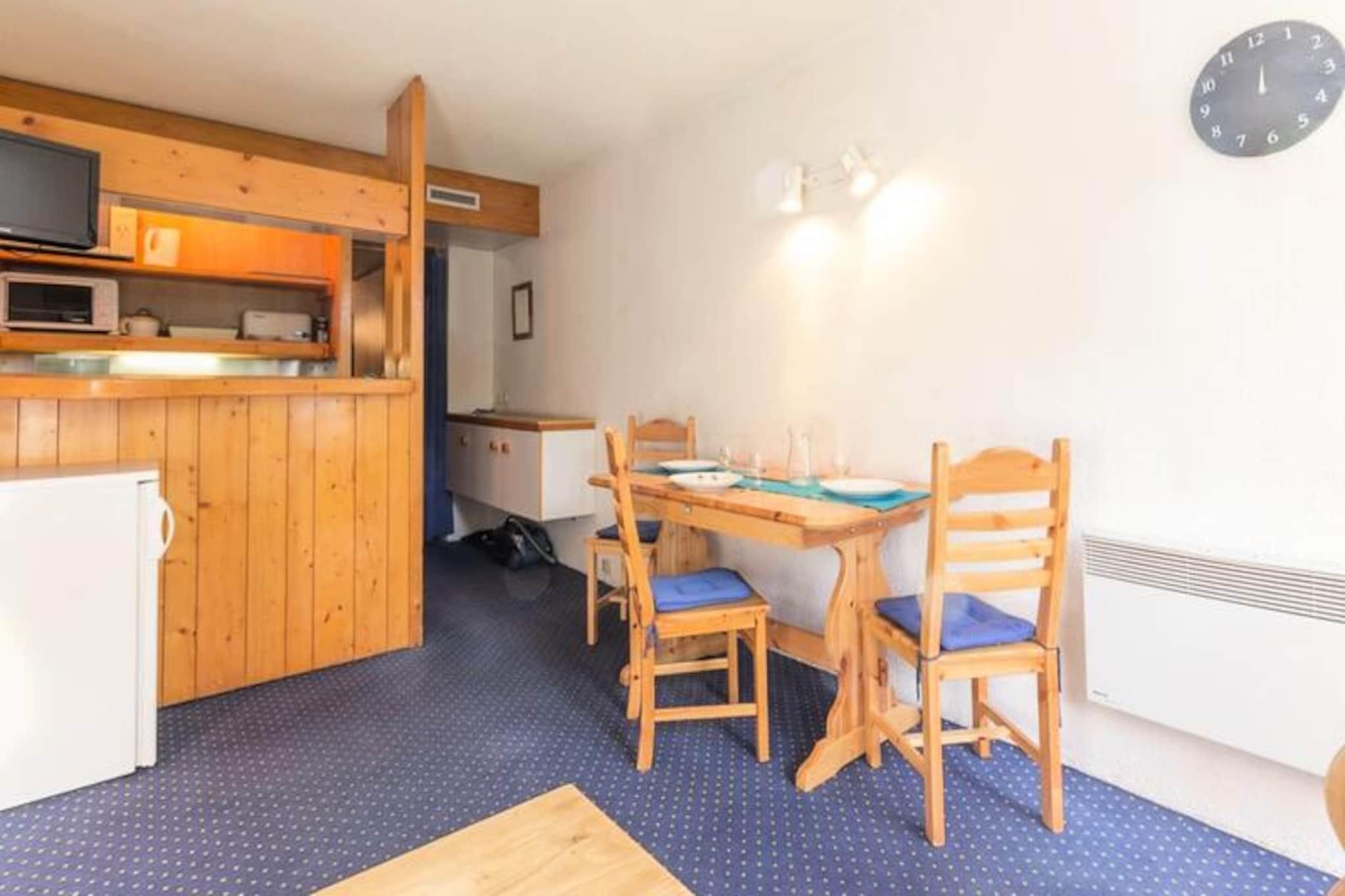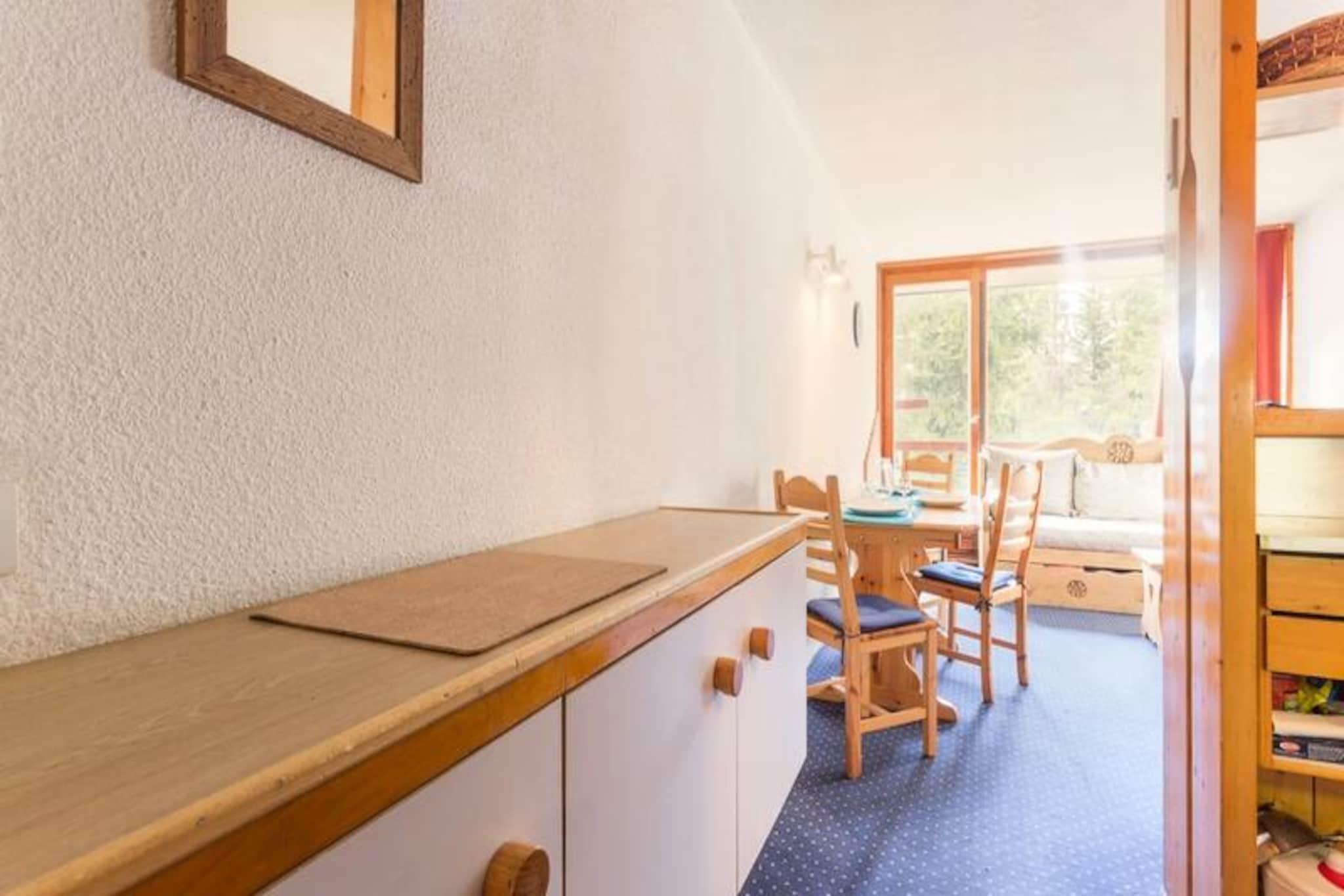 Højt over det travle Charvet-indkøbscenter tilbyder denne hyggelige studiohytte et perfekt alpint tilflugtssted med ski-in/ski-out-adgang. Forestil dig at vågne op til en betagende udsigt over Mont Blanc og de omkringliggende grantræer fra din nordøstvendte balkon eller at træde direkte ud på pisterne for en dag med eventyr. Uanset om du er her for at stå på ski, vandre eller blot nyde den fredfyldte bjergatmosfære, placerer denne bolig dig i hjertet af det hele. Den nærliggende shuttlebus mellem resorterne sikrer problemfri adgang til det bredere Les Arcs-område, hvilket gør det til en ideel base for at udforske Paradiski-området. \n\nDet 28 m² store studio er designet til komfort og bekvemmelighed og har plads til 4 til 5 gæster og har en smart planløsning. Entréhallen har to køjesenge og en udtræksseng, mens stuen tilbyder en sovesofa og en udtræksseng, der kan laves om til en rummelig dobbeltseng. Et fuldt udstyret tekøkken med moderne apparater - elektrisk komfur, mikrobølgeovn, køleskab, opvaskemaskine og mere - giver dig mulighed for at tilberede solide måltider efter en dag på pisterne. Badeværelset med toilet er omhyggeligt designet, og gratis Wi-Fi holder dig forbundet under hele dit ophold. \n\nKun få skridt fra din dør finder du ESF Skimômes børneklub, perfekt til familier. Der er overdækket og udendørs parkering i nærheden, og det pulserende Charvet-indkøbscenter tilbyder et udvalg af butikker og spisesteder. Om vinteren er pisterne din legeplads, mens sommeren forvandler området til et paradis for vandrere og naturelskere. \n\nMed miljøvenligt sengetøj og slutrengøring kombinerer denne bolig bæredygtighed med komfort. Uanset om du er tiltrukket af spændingen ved skiløb eller roen i bjergene, lover denne studiohytte en uforglemmelig alpin flugt.