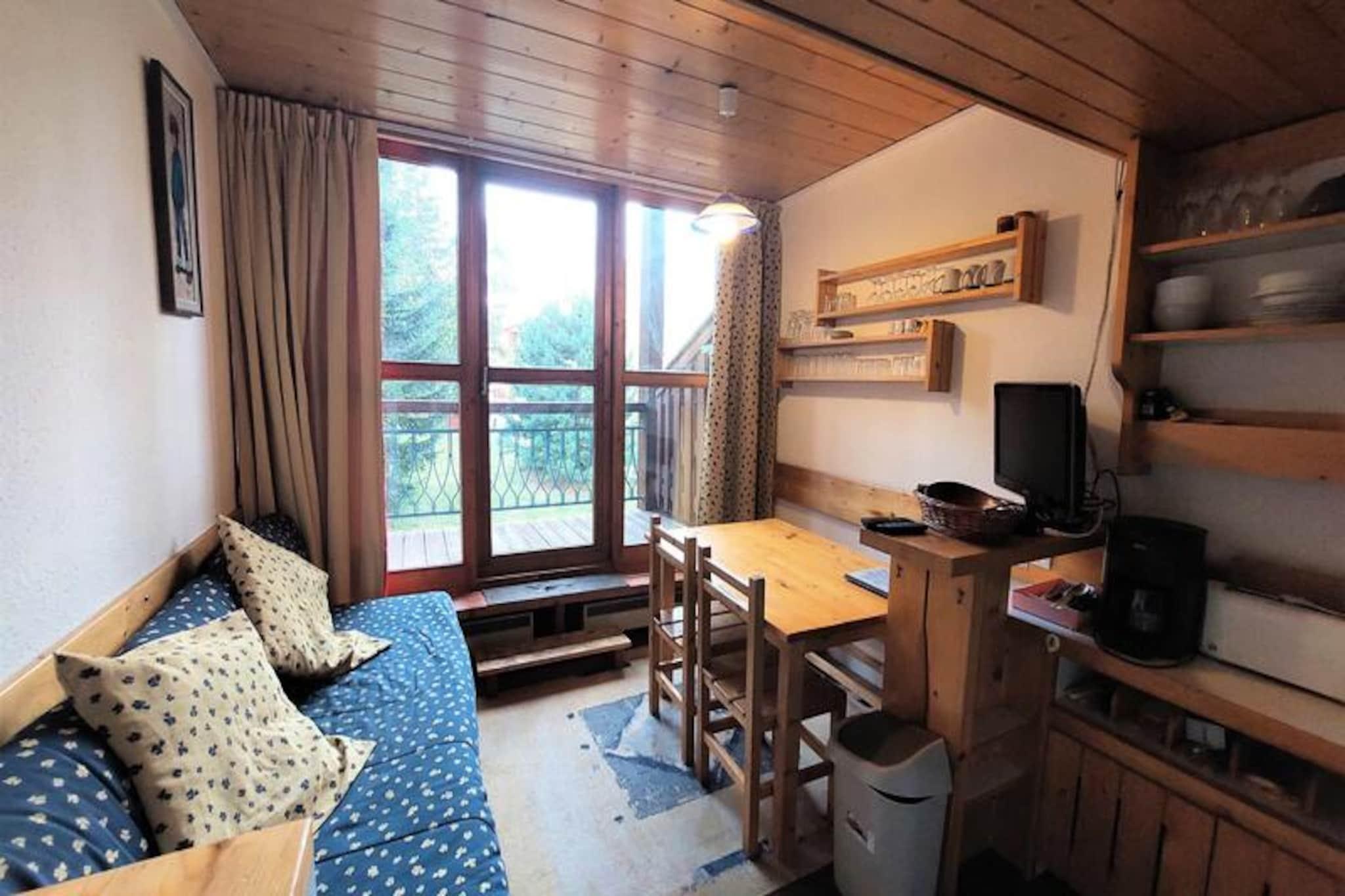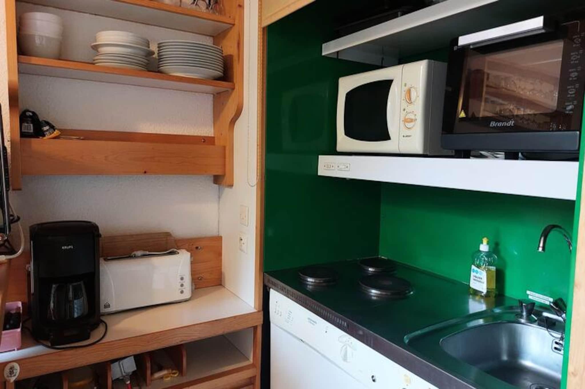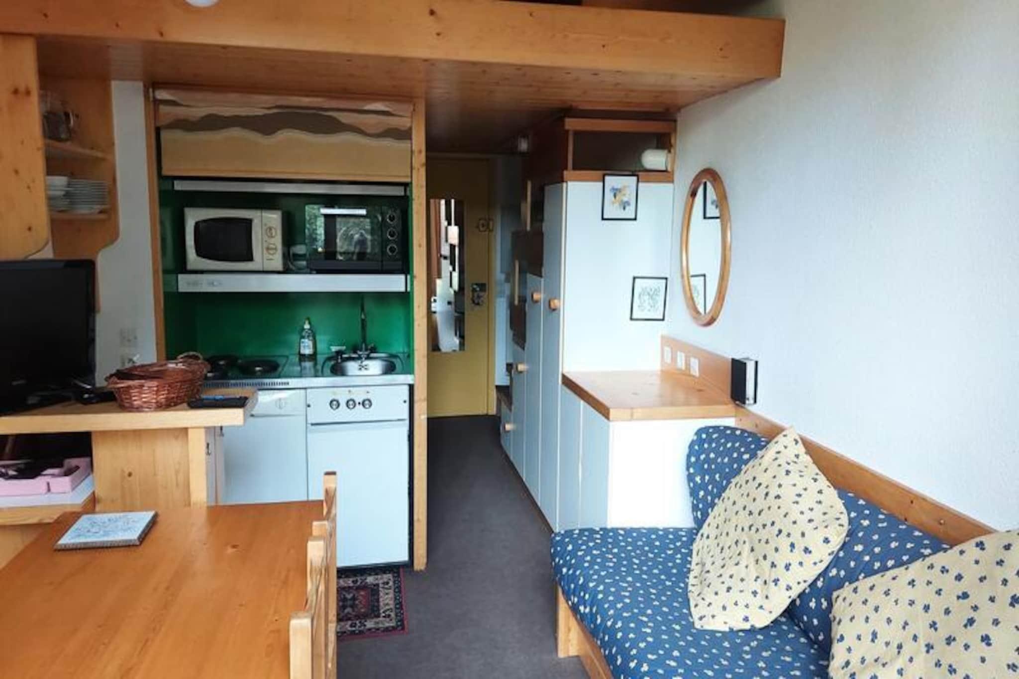 Omgivet af den fredfyldte alpine charme i landsbyen Charmettoger tilbyder denne hyggelige duplexlejlighed i Mirantin 3-residensen en idyllisk tilflugtssted for din skiløb eller sommereventyr i Les Arcs 1800. Forestil dig at vågne op til skovens blide raslen, træde ud på din sydvestvendte balkon for at nyde den rolige udsigt og mærke den friske bjergluft forfriske dine sanser. Med den blå Charmettoger-piste kun 20 meter væk og Transarc-svævebanen kun 50 meter fra din dør, er pisterne praktisk talt lige ved hånden. Denne gennemtænkte lejlighed på 30 m² har komfortabel plads til op til fire gæster. Mezzaninen har en dobbeltseng og en sovesofa, adskilt af et forhæng for ekstra privatliv. Det åbne køkken er fuldt udstyret med moderne apparater, herunder komfur, ovn, mikrobølgeovn, opvaskemaskine og mere, hvilket gør det nemt at tilberede solide måltider efter en dag med alpin udforskning. Slap af i den hyggelige opholdsstue, eller nyd en filmaften med fjernsynet og dvd-afspilleren ovenpå. Et badeværelse med badekar og toilet sikrer din komfort, mens sikker skiopbevaring gør dit ophold endnu mere behageligt. Boligen er perfekt beliggende med nem adgang til lokale faciliteter. Der ligger et supermarked kun 200 meter væk, mens ESF-skiskolen og den pulserende landsby Villards ligger inden for en kort gåtur på 300 meter. Gratis shuttlebusser kører regelmæssigt og forbinder dig med turistkontoret, lægefaciliteter og andre vigtige steder. Om sommeren forvandles området til et paradis for vandrere og naturentusiaster med stier, der snor sig gennem betagende alpine landskaber. Uanset om du snor dig gennem uberørte skråninger om vinteren eller udforsker frodige bjergstier om sommeren, tilbyder denne lejlighed den perfekte blanding af komfort, bekvemmelighed og naturlig skønhed. Skab uforglemmelige minder i hjertet af de franske alper.