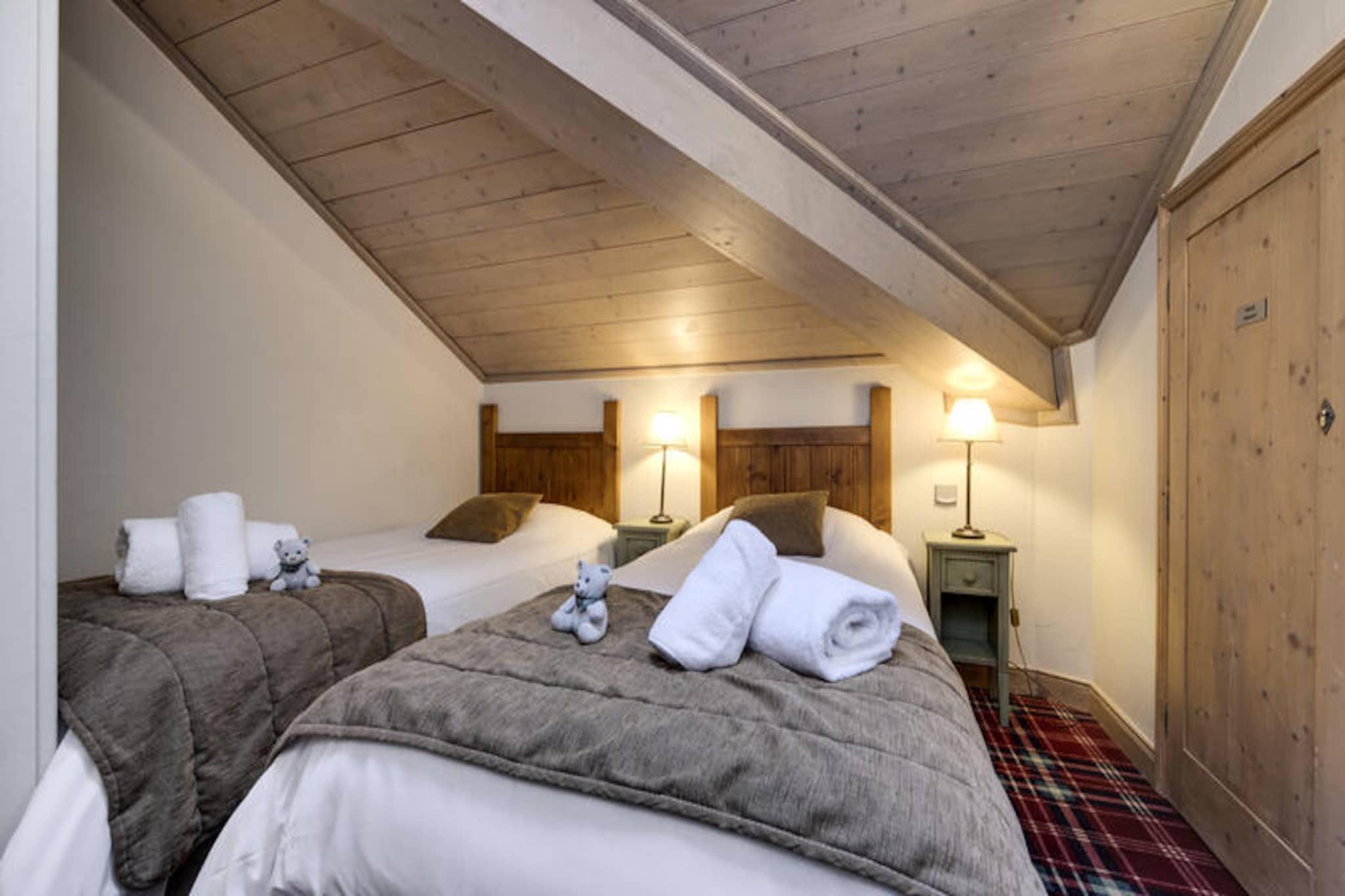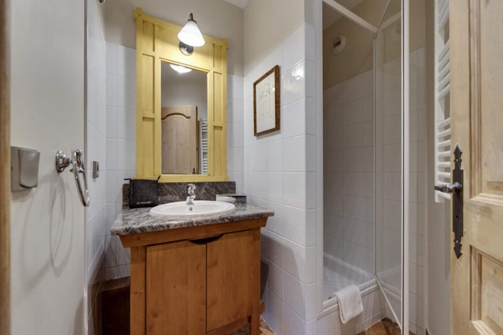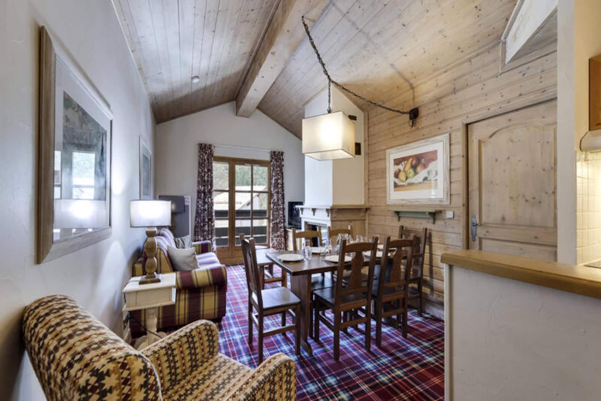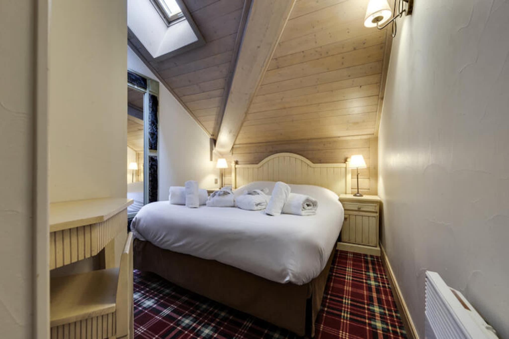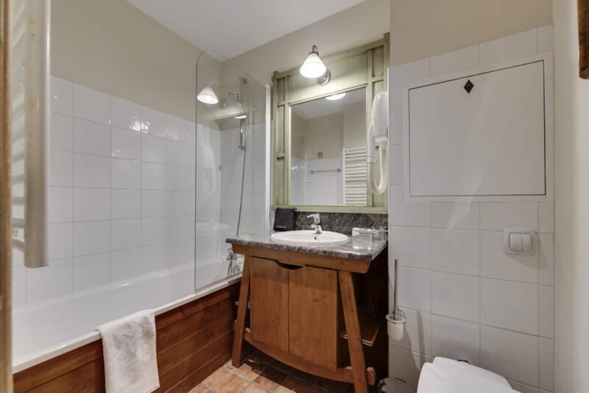 I den fortryllende alpelandsby Arc 1950, hvor brostensbelagte gader møder roen fra snedækkede tinder, tilbyder Hameau du Glacier Residence et luksuriøst tilflugtssted for rejsende, der søger både eventyr og afslapning. Dette gågade-kun-for-gå-resort er problemfrit forbundet med det berømte Paradiski-skiområde, der kan prale af 425 kilometer uberørte pister for skiløbere og snowboardere på alle niveauer. Forestil dig at vågne op til den friske bjergluft, træde ud i hjertet af Alperne og begive dig direkte ud på pisterne fra denne ski-in/ski-out-residens. Arc 1950's charme med dens pulserende atmosfære og maleriske omgivelser sætter scenen for uforglemmelige øjeblikke. \n\nLejligheden er på 55 kvadratmeter og er omhyggeligt designet til at rumme op til fire voksne og to børn. Den har to hyggelige soveværelser, herunder et dobbeltværelse med eget badeværelse og et soveværelse med to enkeltsenge, hvilket sikrer komfort for familier eller grupper. Stuen inviterer dig til at slappe af med sin sovesofa og varme atmosfære, mens det fuldt udstyrede køkken og spiseplads gør det nemt at dele måltider og latter efter en dag med alpine eventyr. Moderne faciliteter såsom Wi-Fi, skiboks og separat brusebad bidrager til bekvemmeligheden, mens de inkluderede tjenester - redte senge ved ankomst, badekåber og slutrengøring - sikrer et problemfrit ophold. \n\nGæster på Hameau du Glacier Residence har adgang til et omfattende wellness-område med udendørs swimmingpool, jacuzzi, sauna, dampbad og fitnessfaciliteter. Uanset om du slapper af i jacuzzi under stjernehimlen eller lader op i saunaen, tilbyder wellness-området den perfekte balance til de spændende pister. I nærheden tilbyder landsbyen charmerende restauranter, butikker og afterski-aktiviteter, hvilket gør den til et livligt knudepunkt for afslapning og underholdning. \n\nVælg denne bolig for dens uovertrufne beliggenhed, førsteklasses faciliteter og den unikke charme fra Arc 1950. Uanset om du er her for spændingen ved skiløb eller roen i bjergene, lover Hameau du Glacier Residence en ferie fyldt med komfort, eventyr og varige minder.