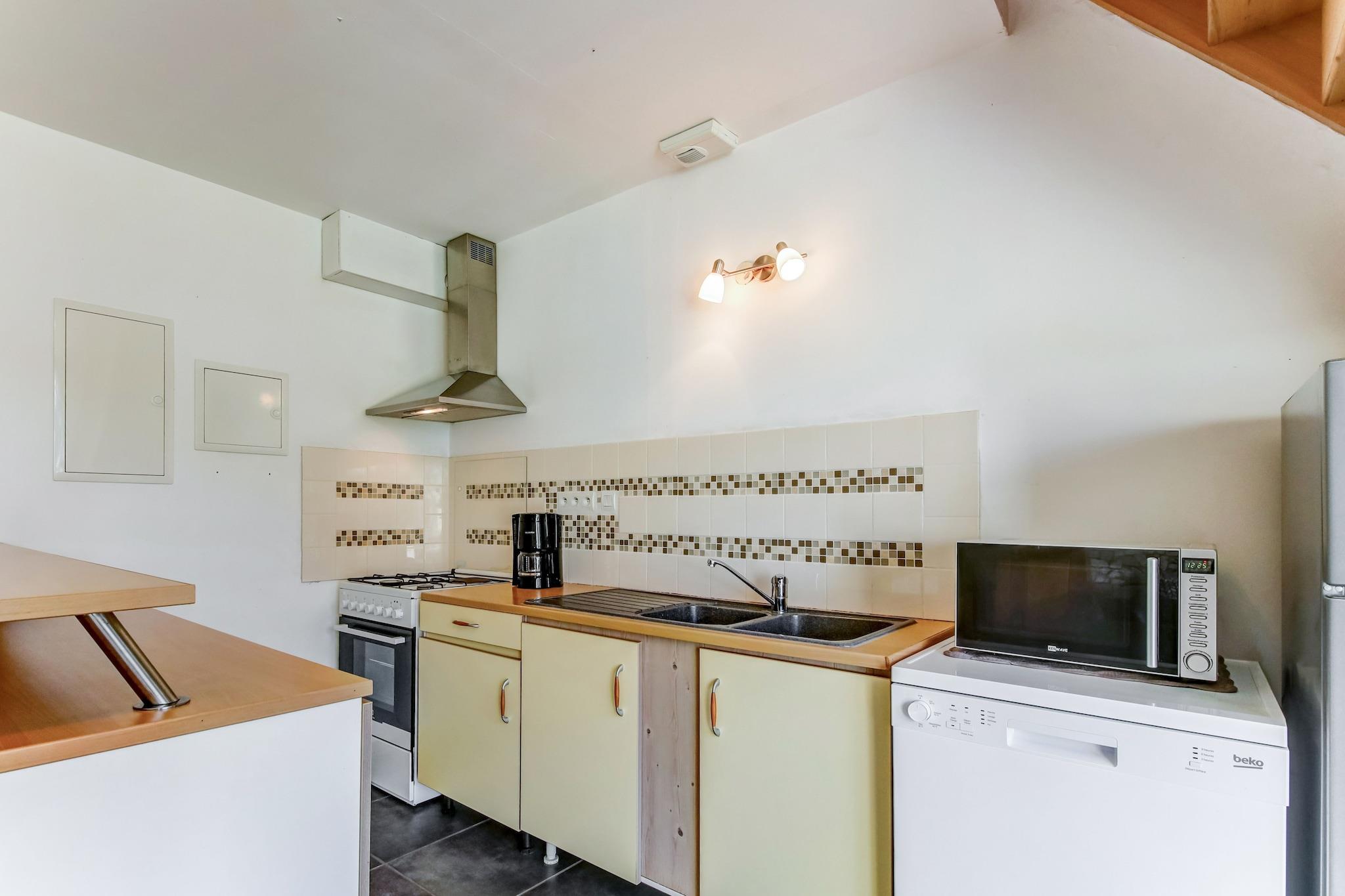 Stueetage: (Stue(Fjernsyn, DVD-afspiller), åbent køkken(elkedel, brødrister, komfur(gas, elektrisk), kaffemaskine(kaffetragt), kaffemaskine(kaffepude), ovn, mikrobølgeovn, opvaskemaskine , køle-fryseskab, vaskemaskine)) På 1. etage: (soveværelse(dobbeltseng(160 x 200 cm)), sovekabine(tilgængelig via et værelse)(køjeseng(90 x 190 cm)), badeværelse(bruser, toilet)) varme(elektrisk), terrasse, have(indhegnet), havemøbler, grill, parkering