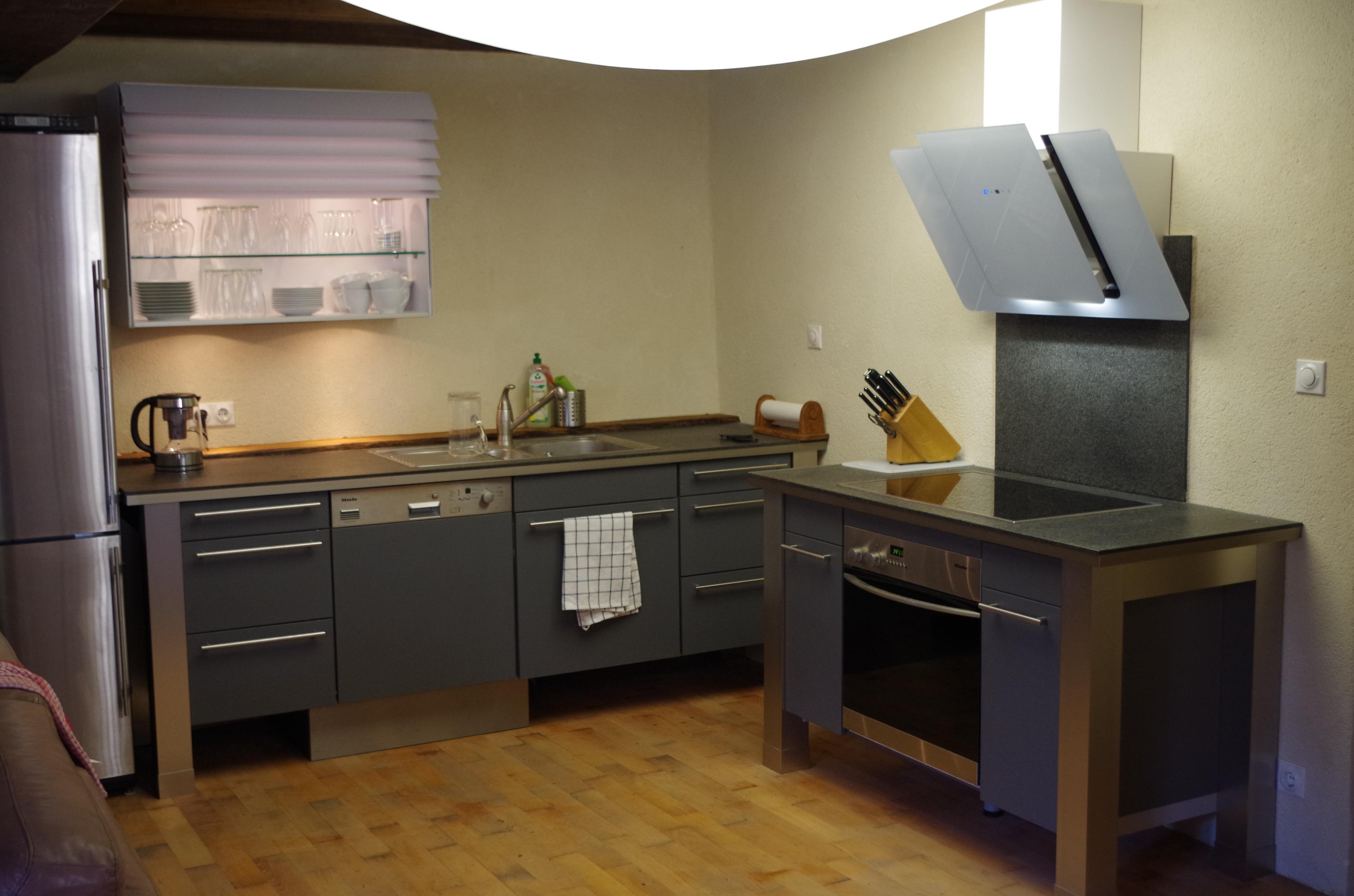 Das EG beherbergt eine Küche mit Herd, Spüle, Kühl-Gefrierschrank, Spülmaschine und Espressomaschine. Eine Essecke mit einer Eckbank, Tisch und Stühlen und zwei gemütliche Couchen laden zum Lesen und Spielen ein.