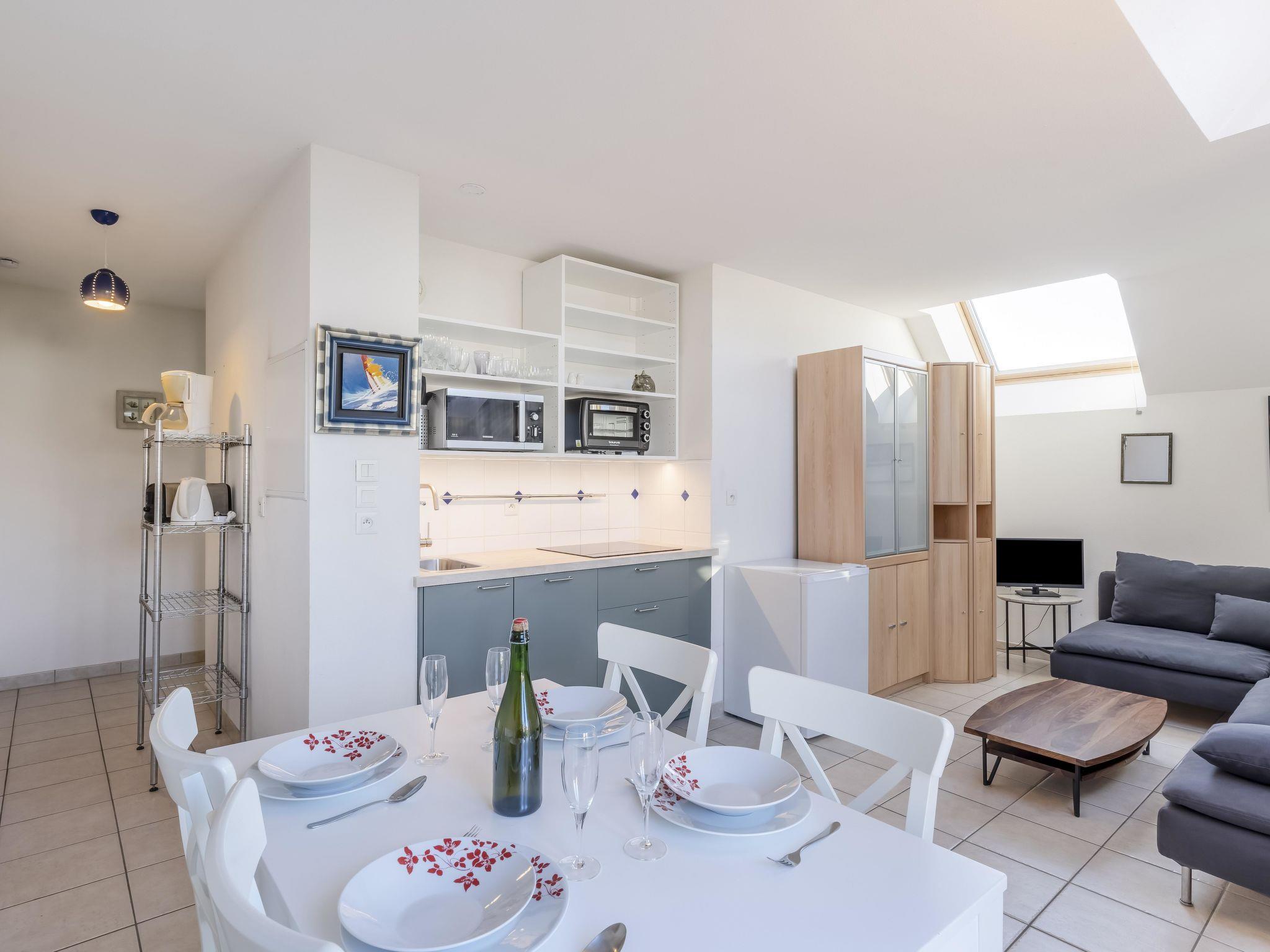 3-room apartment 44 m2 on 3rd floor, north-east facing position. Living/dining room with TV (flat screen). Exit to the balcony. 1 room with 1 french bed (160 cm, length 190 cm). Exit to the balcony. 1 room with sloping ceilings with 1 french bed (140 cm, length 190 cm). Kitchenette (mini-oven, dishwasher, 4 induction hot plates, toaster, kettle, microwave, electric coffee machine). Shower/WC. Electric heating, boiler. 2 balconies 2 m2. Distant view of the sea. Facilities: baby cot for up to 2 year olds. Internet (WiFi, extra). Please note: smoke alarm.