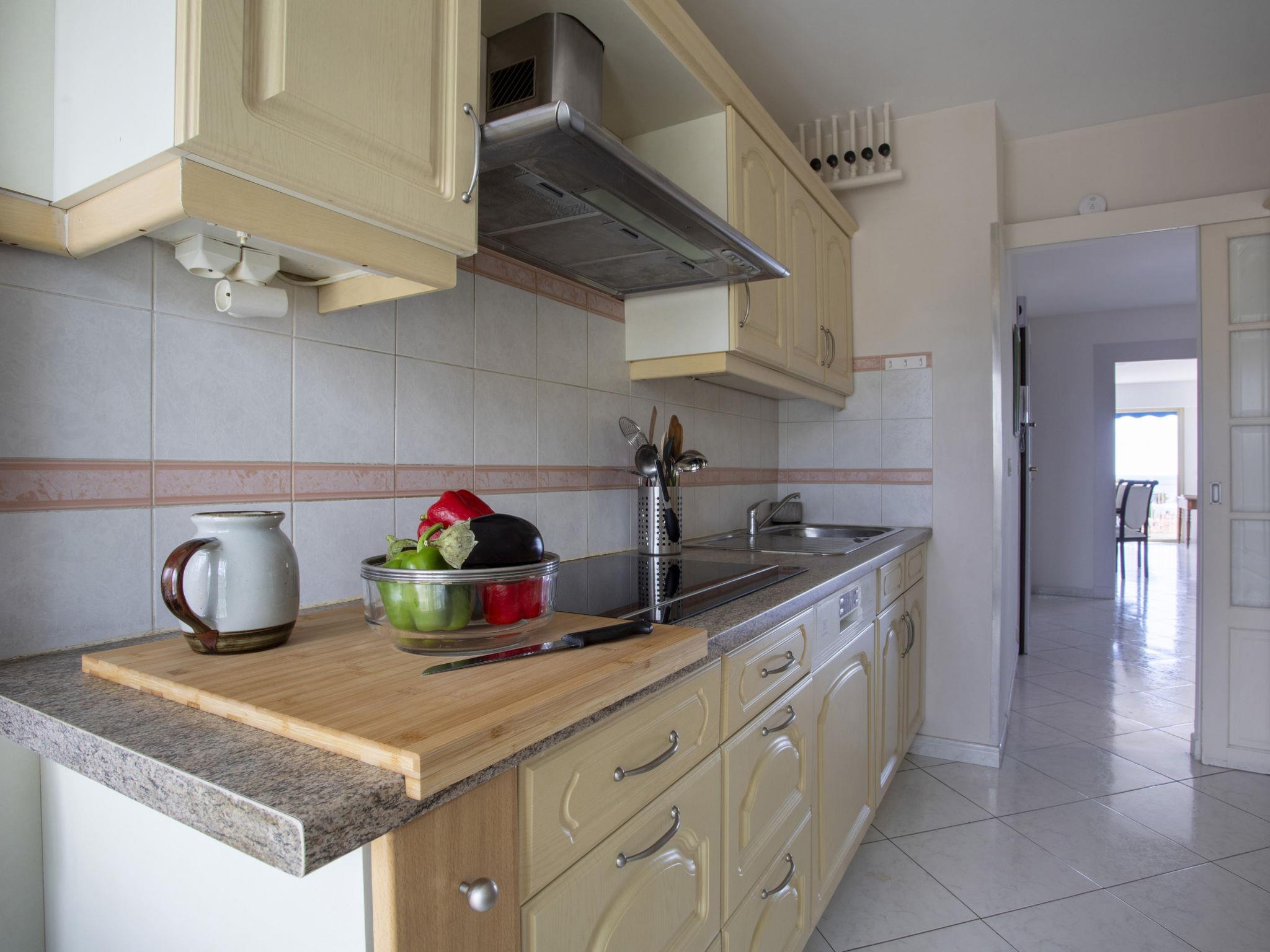 3-room apartment 100 m2 on 5th floor, south facing position. Spacious, partly renovated in 2025, comfortable furnishings: large living/dining room with 1 double sofabed (1 x 140 cm, length 190 cm), TV (flat screen). Exit to the terrace. 1 large room with 1 french bed (1 x 160 cm, length 200 cm). Exit to the balcony. 1 large room with 1 french bed (2 x 80 cm, length 200 cm). Exit to the balcony. Large kitchen (oven, dishwasher, 3 induction hot plates, toaster, kettle, microwave, electric coffee machine). Exit to the balcony. Shower/WC, sep. WC. Heating, air-conditioning. Large balcony 10 m2, north facing position, terrace 15 m2, south facing position. Terrace furniture. Very beautiful panoramic view of the sea, the countryside and the resort. Facilities: washing machine, iron, hair dryer. Internet (WiFi, free). Garage (1 car). Please note: non-smoking house. Smoke alarm. Offer by a private individual according to Art. 155, IV of CGI. 06027039026HT