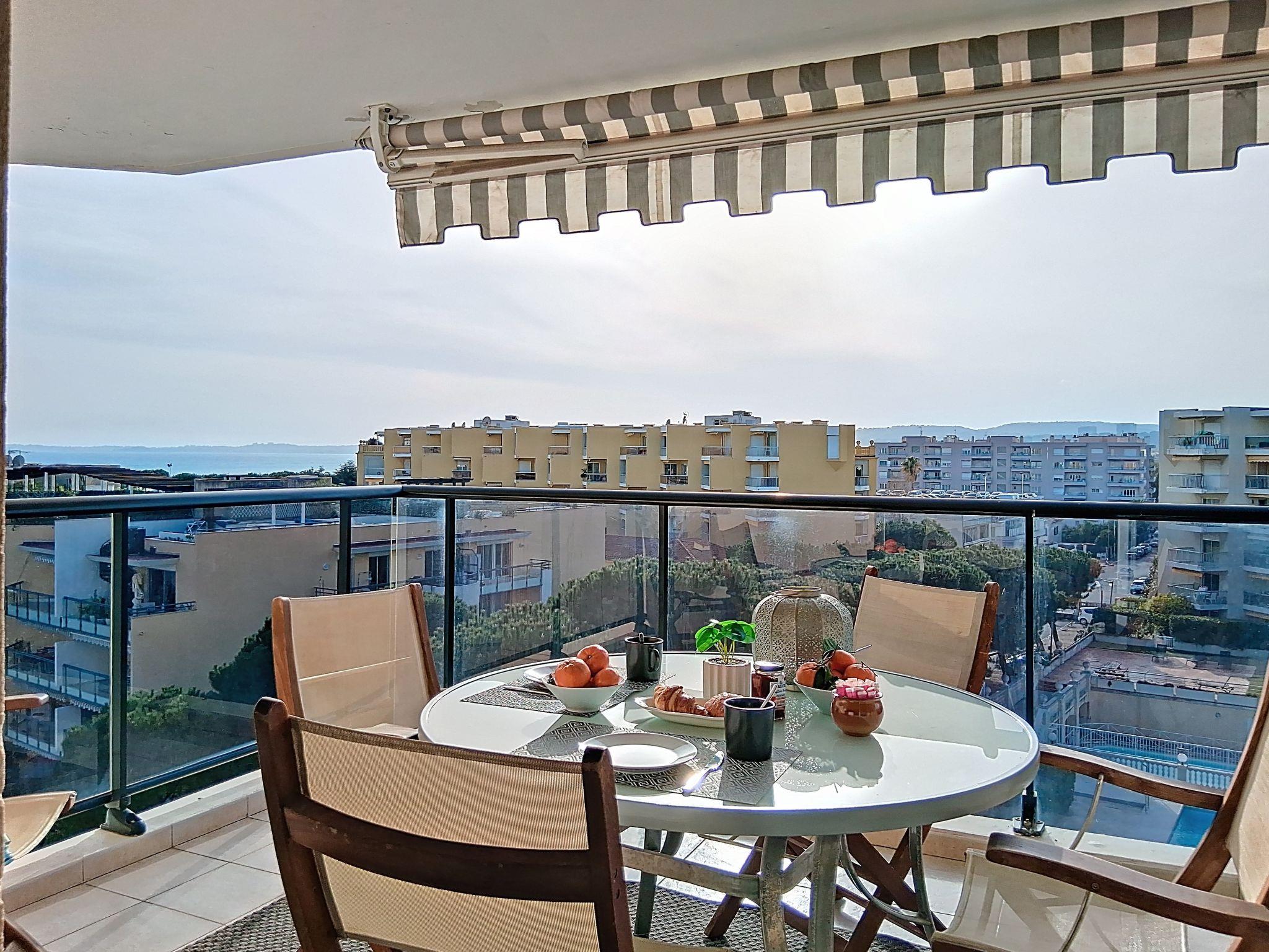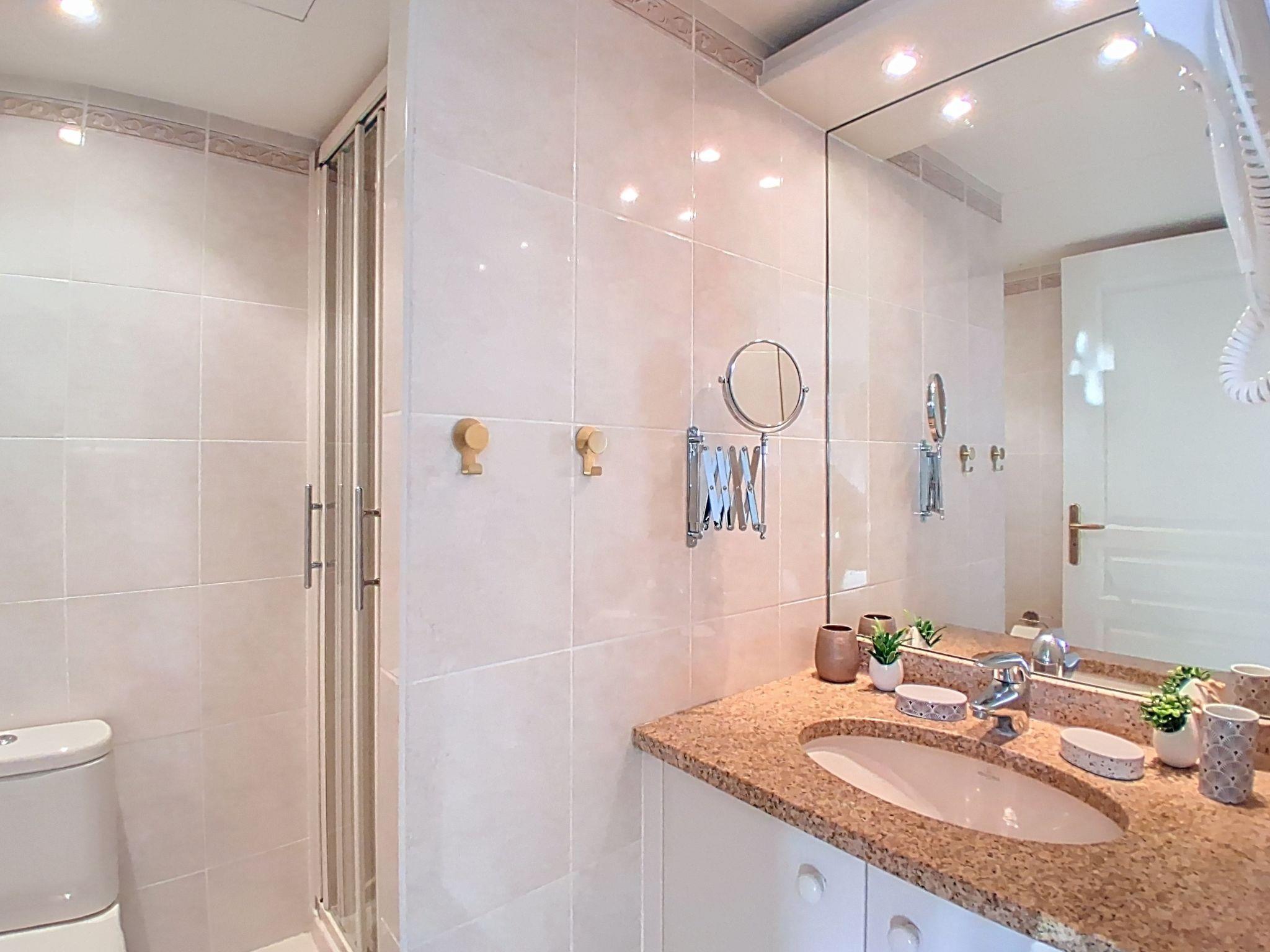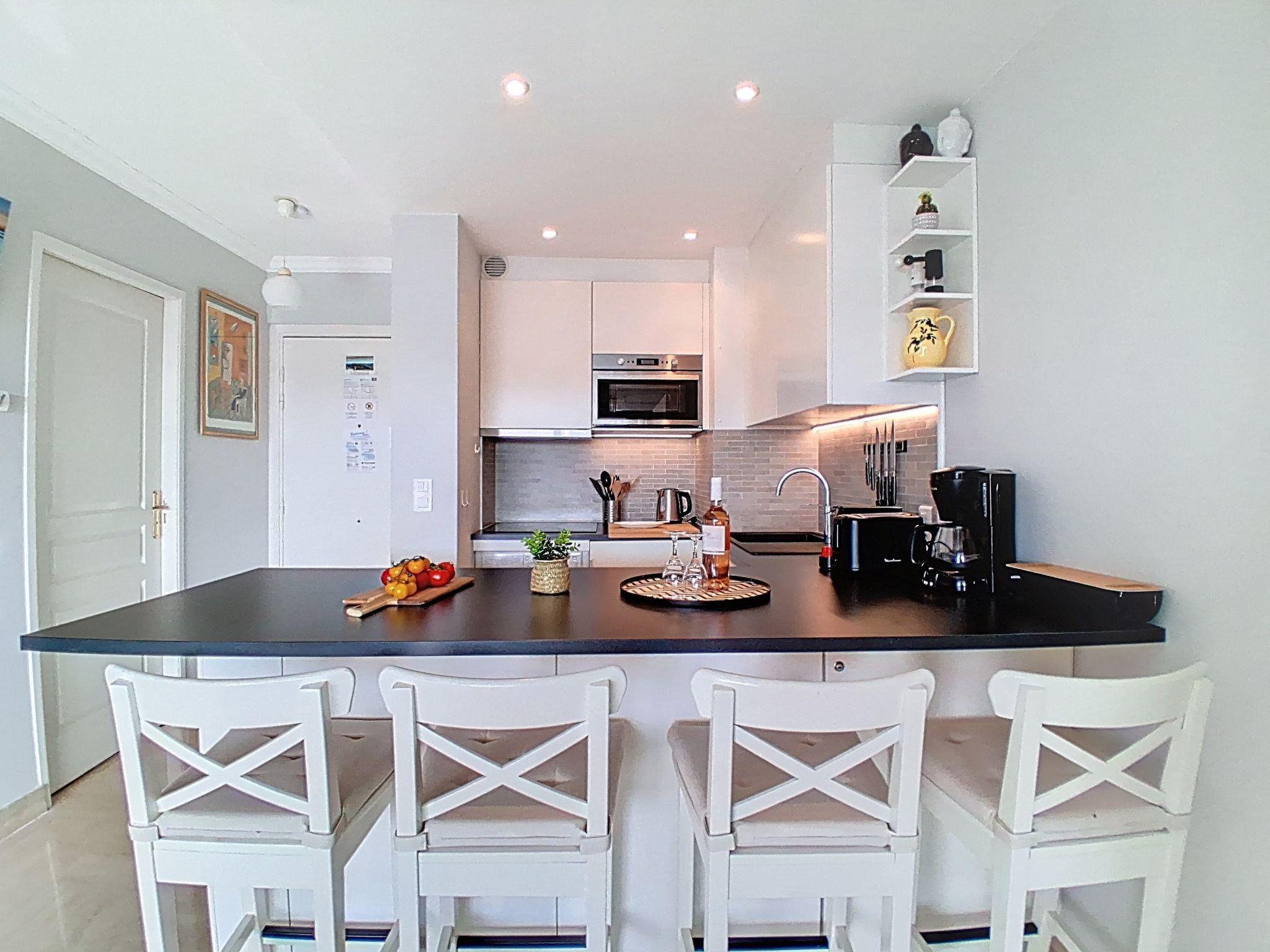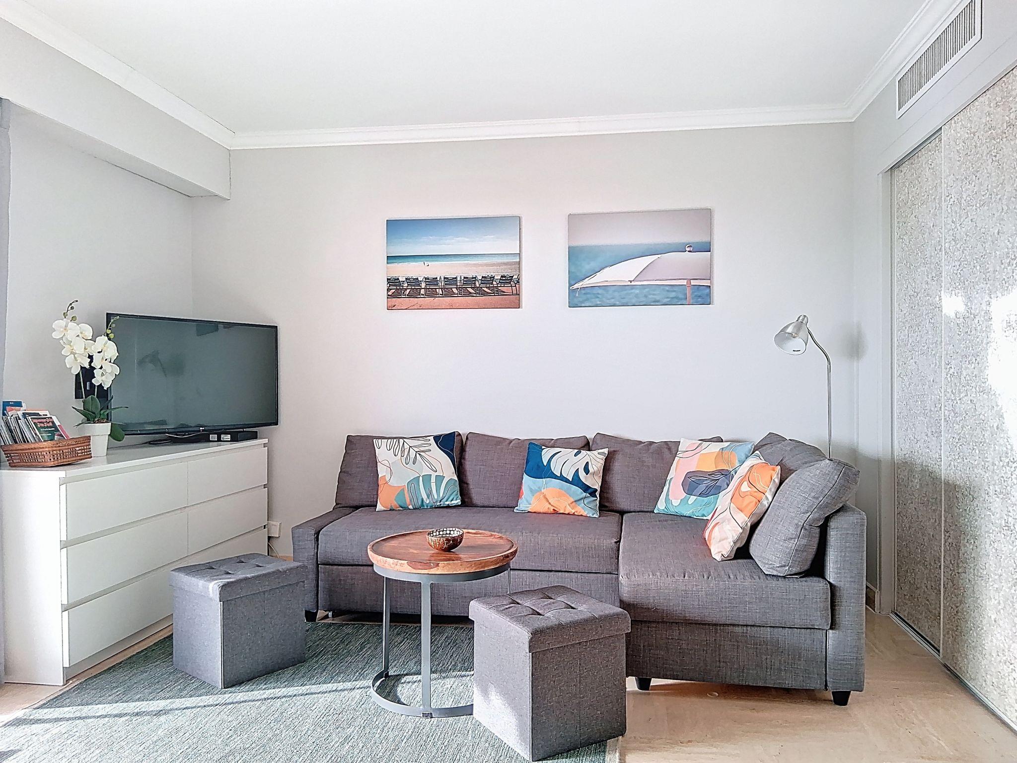 1-room studio 30 m2 on 5th floor, south-west facing position. Comfortable and modern furnishings: living/sleeping room with 1 fold-away bed (160 cm, length 200 cm), TV and flat screen. Exit to the terrace. Open kitchen (dishwasher, 3 induction hot plates, toaster, kettle, microwave, freezer, electric coffee machine, Capsules for coffee machine (NESPRESSO) extra). Exit to the terrace. Shower/WC. Heating, air-conditioning. Large terrace 12 m2, south facing position and west facing position. Terrace furniture. Very beautiful view of the sea, the swimming pool, the garden and the resort. Facilities: washing machine, iron, hair dryer. Internet (WiFi, free). Parking (1 car). Please note: non-smoking house. Smoke alarm. In a luxury residence with a concierge. Offer by a private individual according to Art. 155, IV of CGI. 06027027151DP