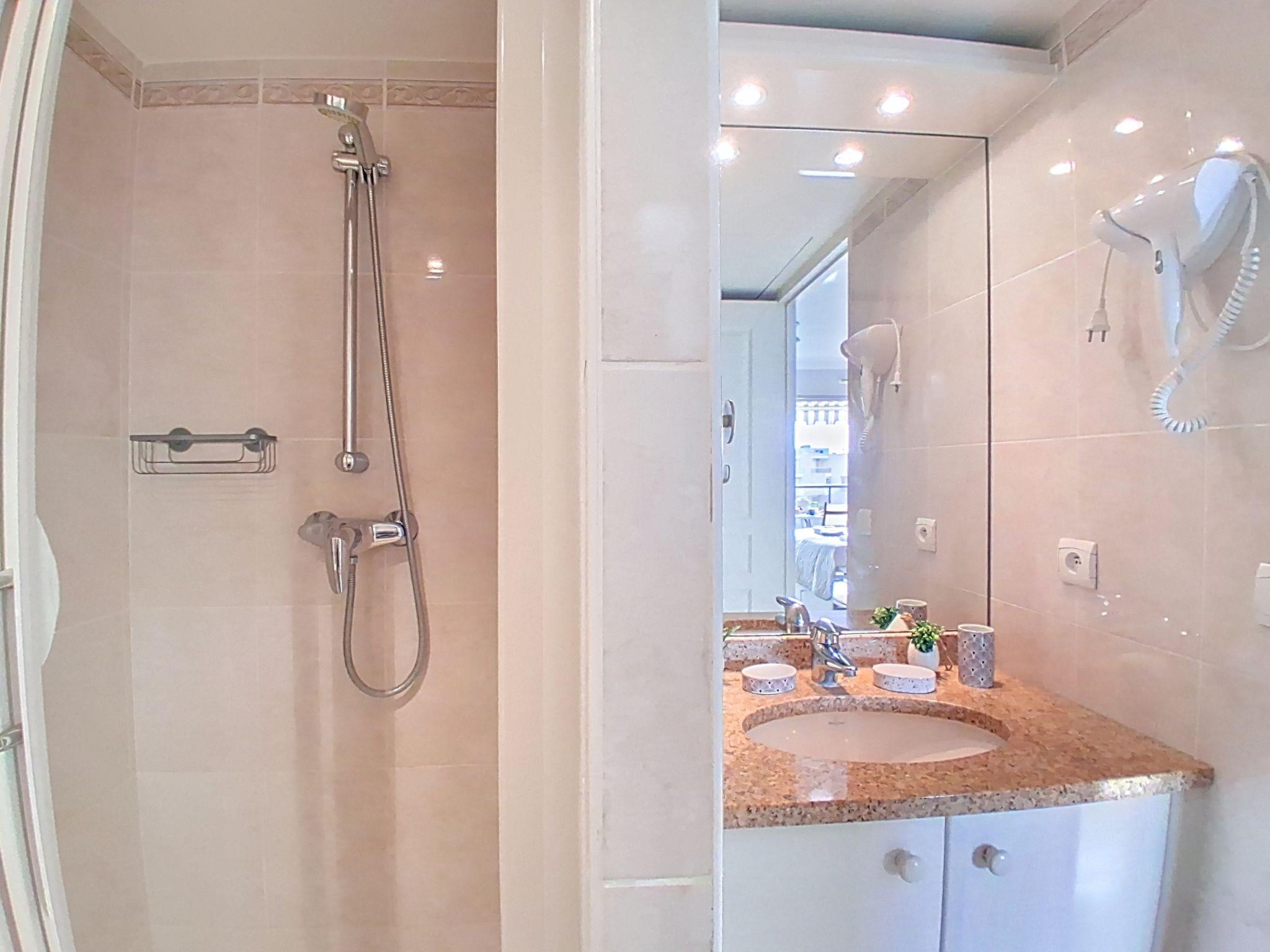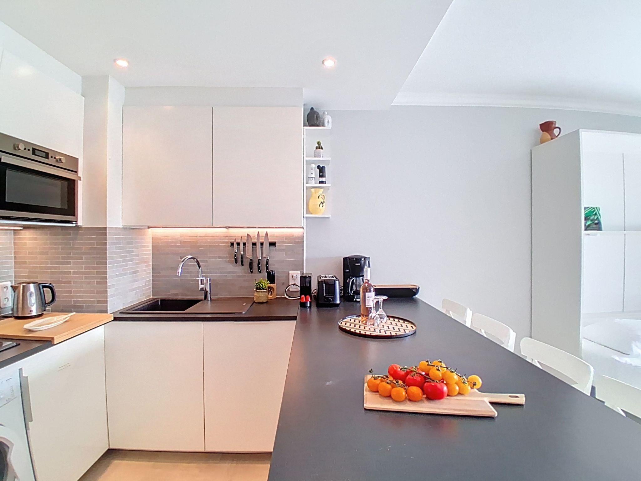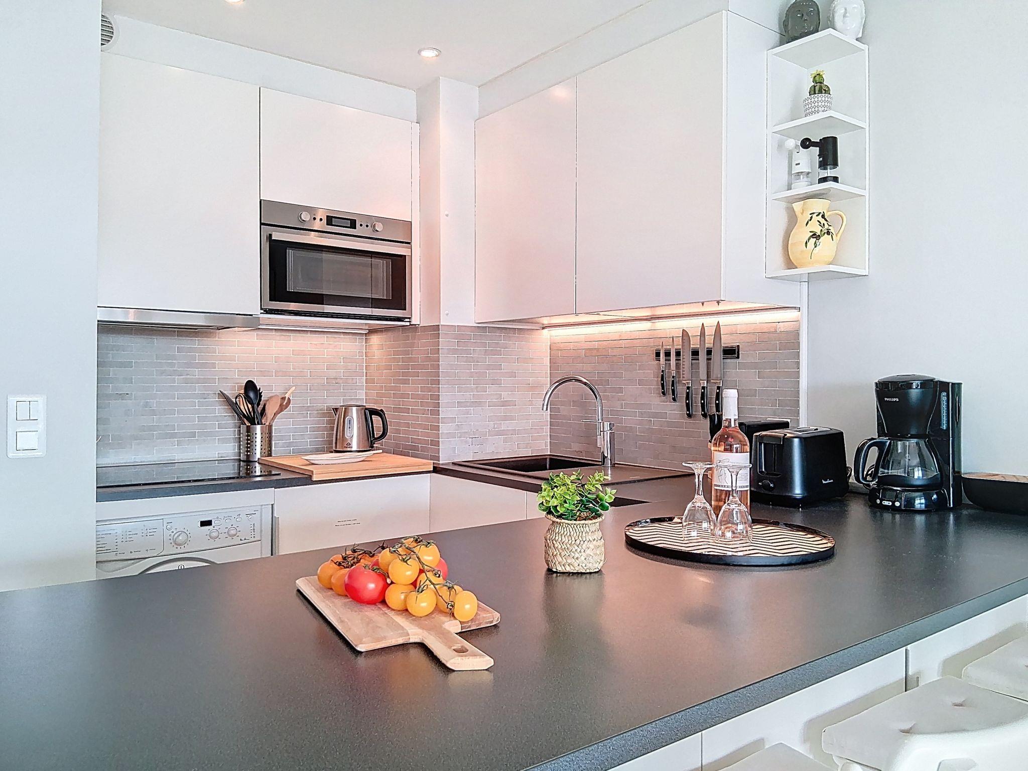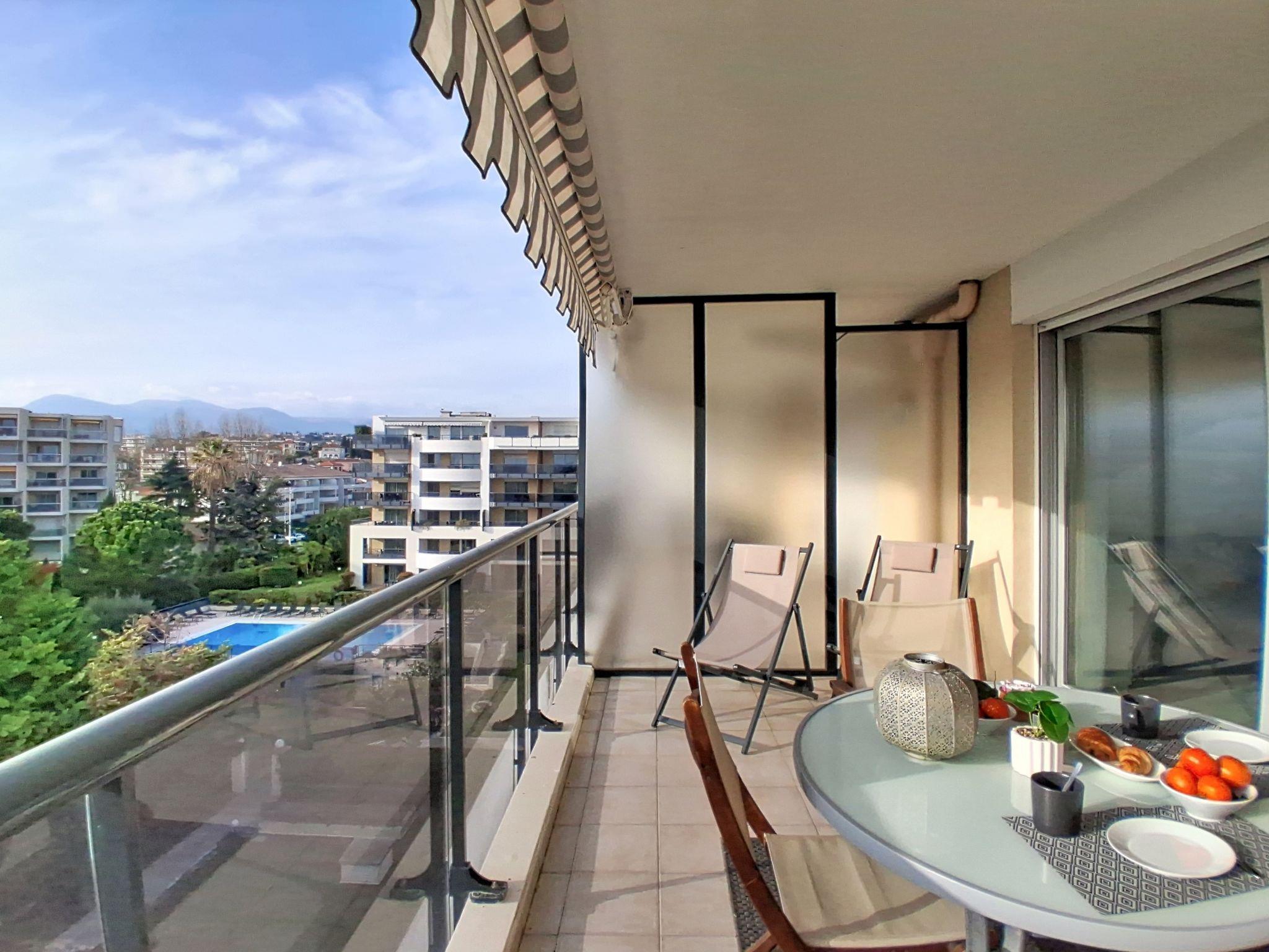 1-room studio 30 m2 on 5th floor, south-west facing position. Comfortable and modern furnishings: living/sleeping room with 1 fold-away bed (160 cm, length 200 cm), TV and flat screen. Exit to the terrace. Open kitchen (dishwasher, 3 induction hot plates, toaster, kettle, microwave, freezer, electric coffee machine, Capsules for coffee machine (NESPRESSO) extra). Exit to the terrace. Shower/WC. Heating, air-conditioning. Large terrace 12 m2, south facing position and west facing position. Terrace furniture. Very beautiful view of the sea, the swimming pool, the garden and the resort. Facilities: washing machine, iron, hair dryer. Internet (WiFi, free). Parking (1 car). Please note: non-smoking house. Smoke alarm. In a luxury residence with a concierge. Offer by a private individual according to Art. 155, IV of CGI. 06027027151DP