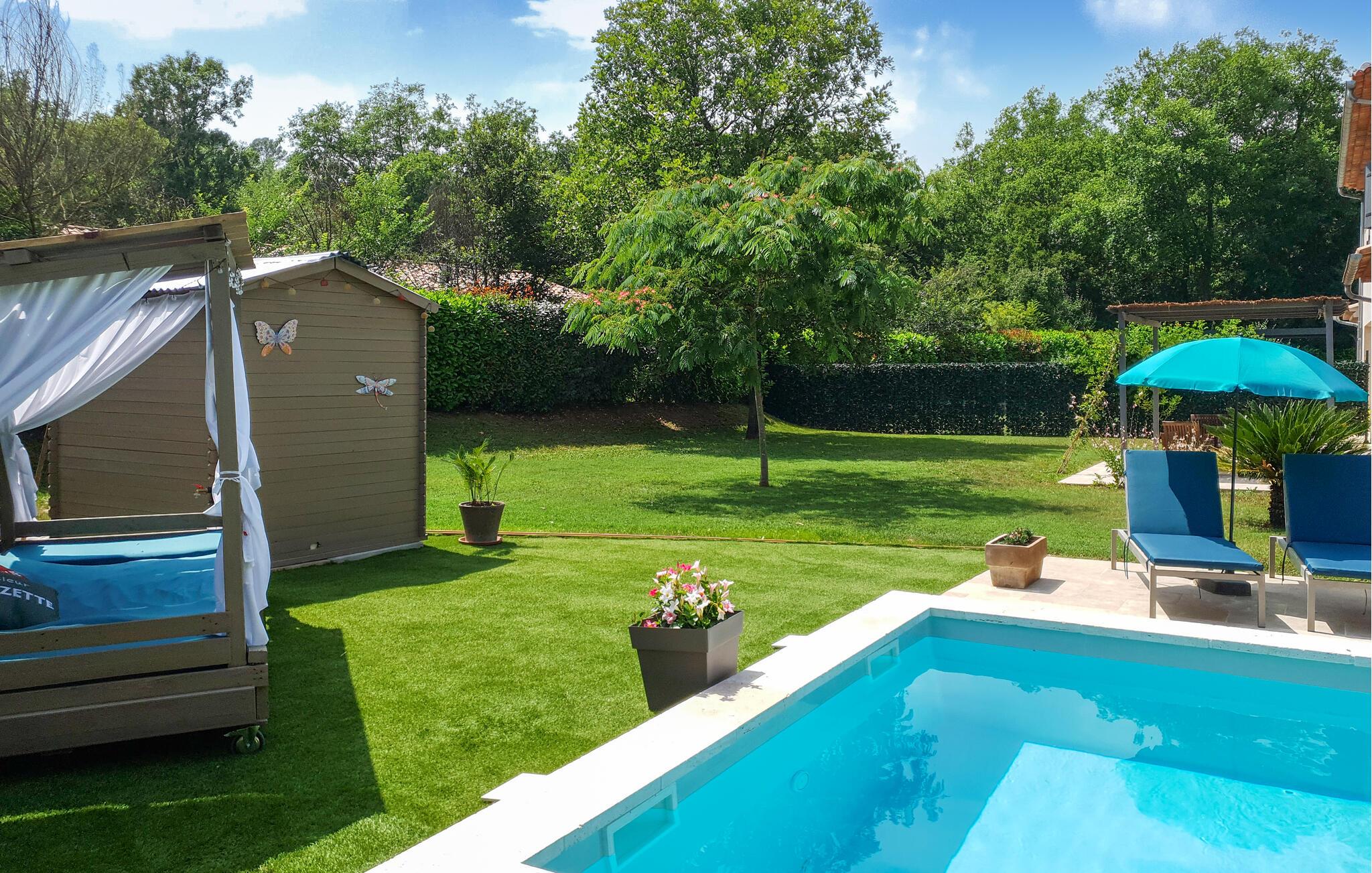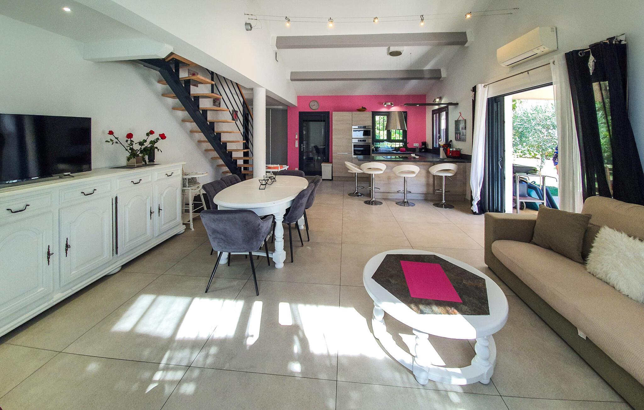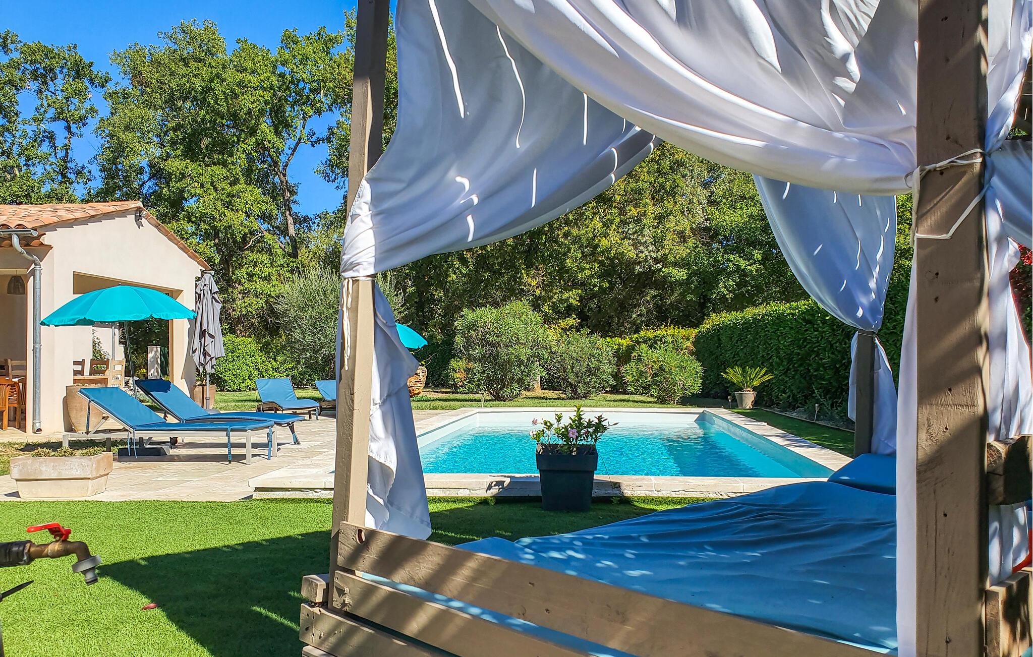 Vidunderligt feriehus med egen pool. Huset ligger i Callian og og dermed er det kun beliggende 33 km fra Cannes og byens smukke strande. Det er moderne indrettet og dens planløsning gør det muligt for store familier og vennegrupper at tilbring en dejlig ferie her. Her kan I have en rolig base for jeres ferie. I kan slappe af i den grønne have og tage en forfriskende dukkert i ny og næ. Her er selvfølgelig også en grill hvor I kan tilberede jeres måltider i det fri, ligesom hunden har god plads til at lege på den store grund. Callian er I sig selv en hyggelig udflugt værd, med de små gyder og stræder, men I bør også tage på nogle ture til Haute Siagnes kløfter og naturseværdigheder. I Fayence kan I opleve byens Saracenske port og en fantastisk panoramaudsigt til dalen. Ved Lac de Saint-Cassien venter der jer et skønt udbud af vandsportsdiscipliner, men det er også et skønt sted at afholde picknick. I cannes er der ikke kun den smukke strand, men også den elegante boulevard de la Croisette og den gamle bymidte Le Suquet. Langs kysten er der flere skønne strande ved f.eks. Saint-Raphaël. Hele året er det et skønt sted at holde ferie.
