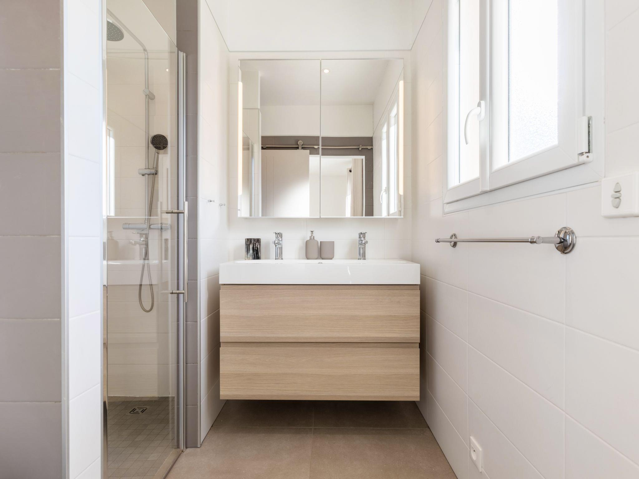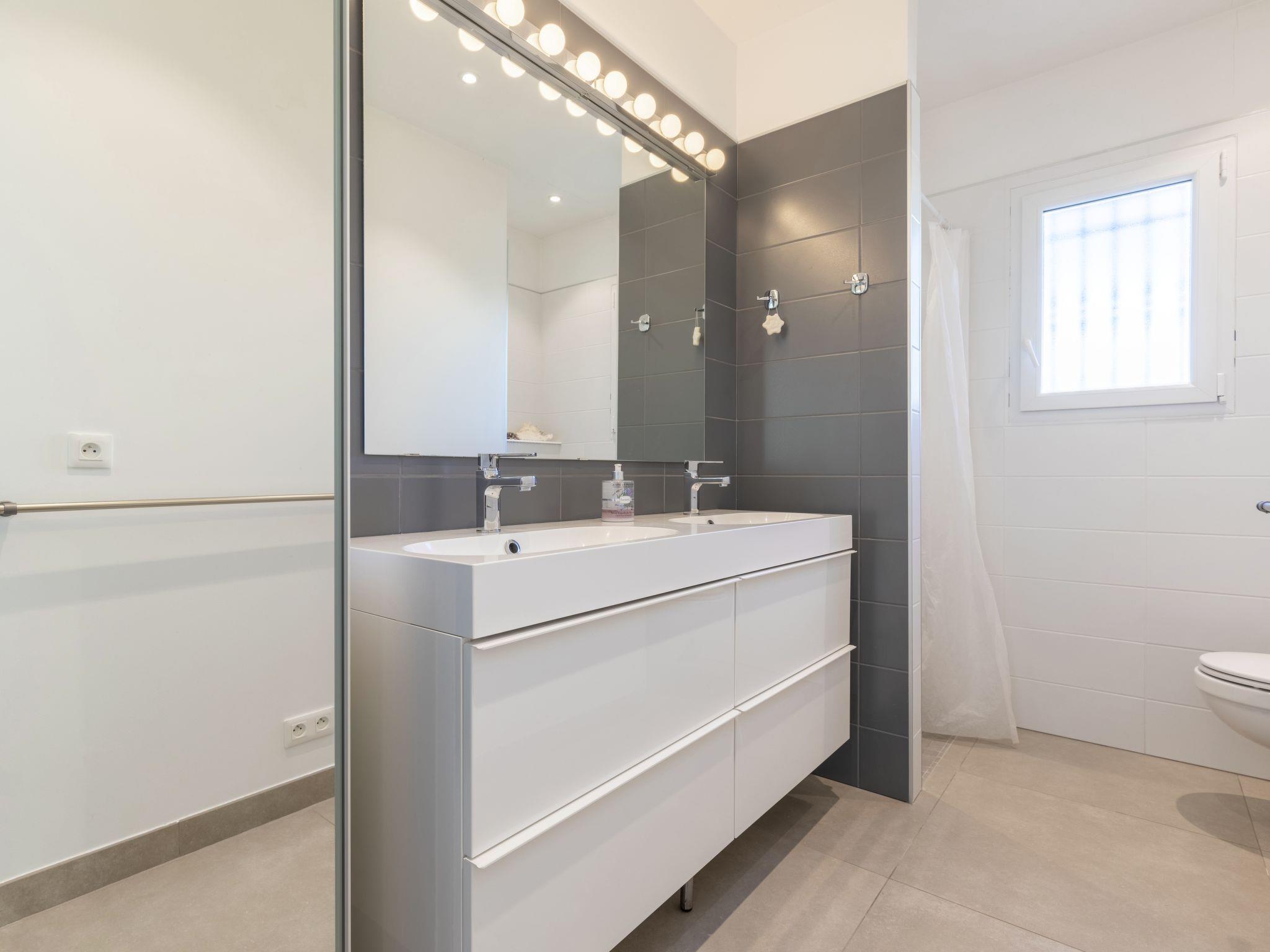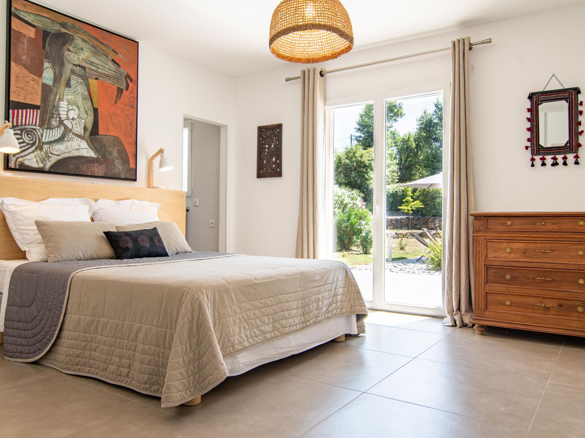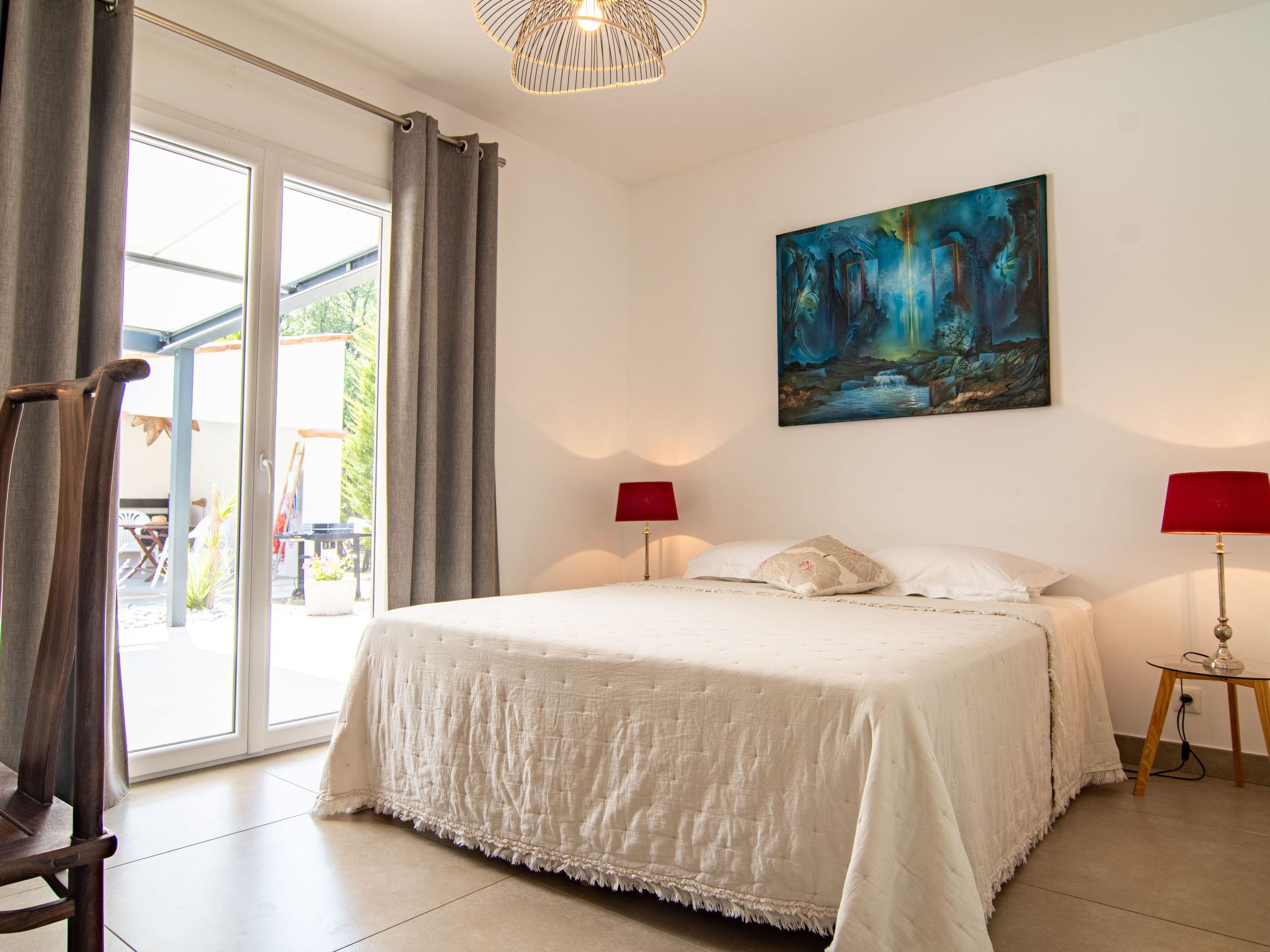 4-room villa 140 m2. Living/dining room with open-hearth fireplace (only for decoration), TV (flat screen). Exit to the terrace. 1 room with Dressing room with 1 french bed (160 cm, length 190 cm), shower/WC. Exit to the terrace. 1 room with 1 french bed (140 cm, length 190 cm). Exit to the garden, to the terrace. 1 room with 1 french bed (160 cm, length 190 cm). Exit to the terrace. Open kitchen (oven, dishwasher, 4 gas rings, toaster, kettle, electric coffee machine) with small dining table. Shower/WC, sep. WC, double hand-basin. Electric heating. Terrace furniture, deck chairs (4). Facilities: washing machine, iron. Internet (WiFi, free). Please note: non-smoking house. Smoke alarm. Offer by a private individual according to Art. 155, IV of CGI.