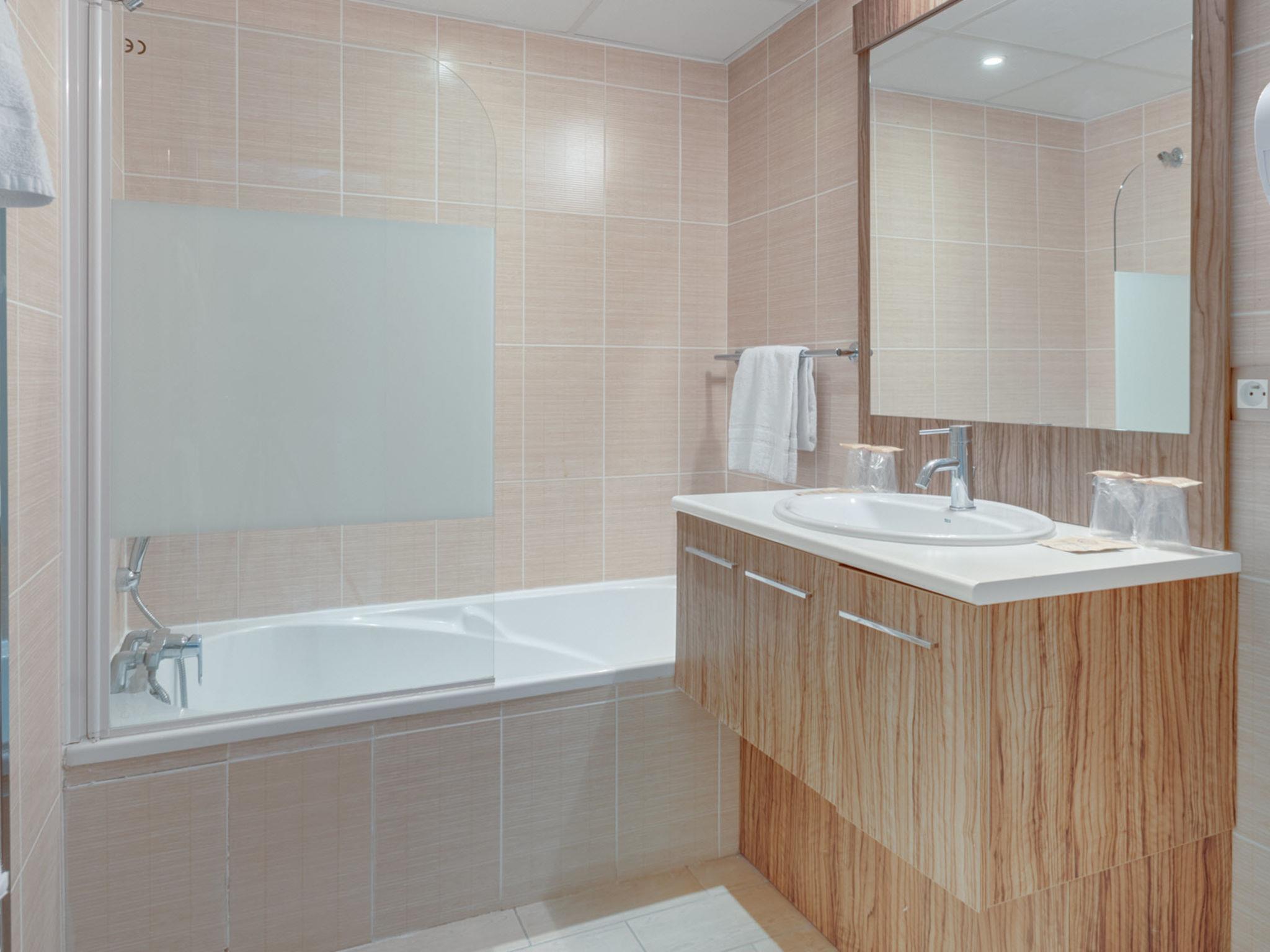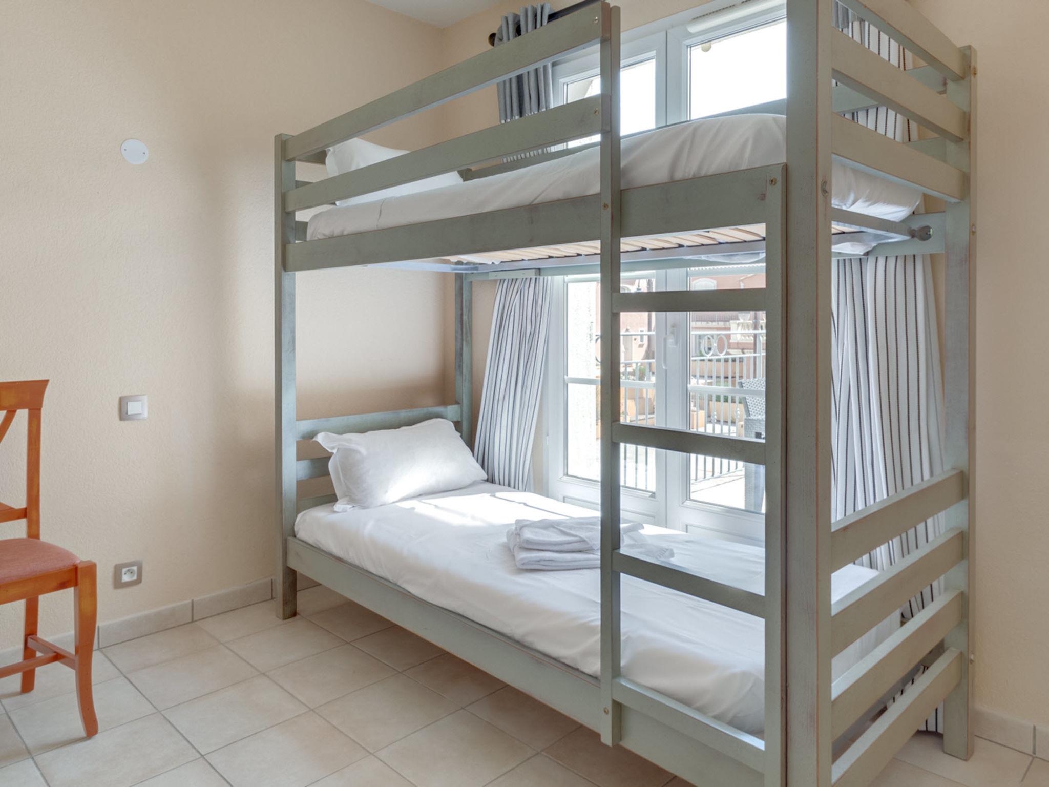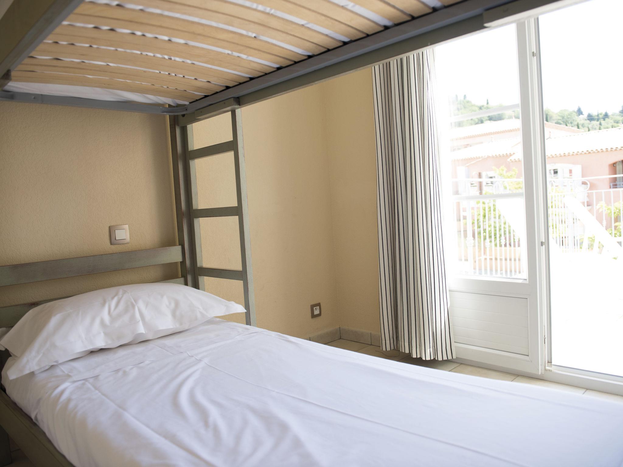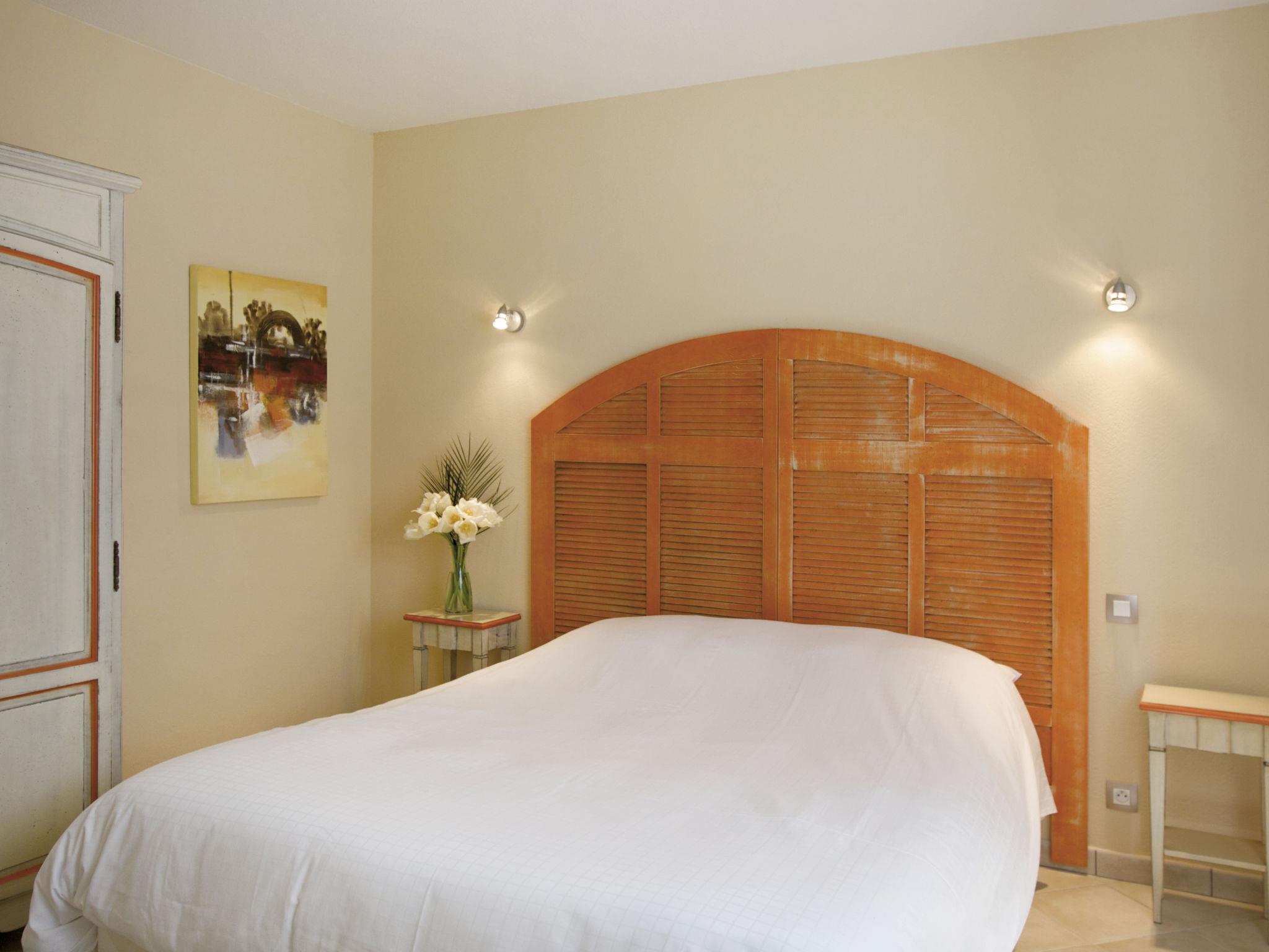 "Domaine de Camiole", 4-room apartment 60 to 66 m2. Tasteful furnishings: living/sleeping room with 1 double sofabed, dining table and satellite TV. 1 room with 1 french bed. Exit to the balcony. 1 room with 1 french bed. 1 room with 1 x 2 bunk beds. Exit to the balcony. Open kitchen (dishwasher, 4 ceramic glass hob hotplates, microwave, electric coffee machine). Sep. WC, bath or shower. Heating, air-conditioning. Balcony. Balcony furniture. Facilities: Internet (WiFi, free). Please note: non-smokers only. Maximum 1 pet/ dog allowed. Smoke alarm, fire extinguisher. The property is one of a type of property or apartment.