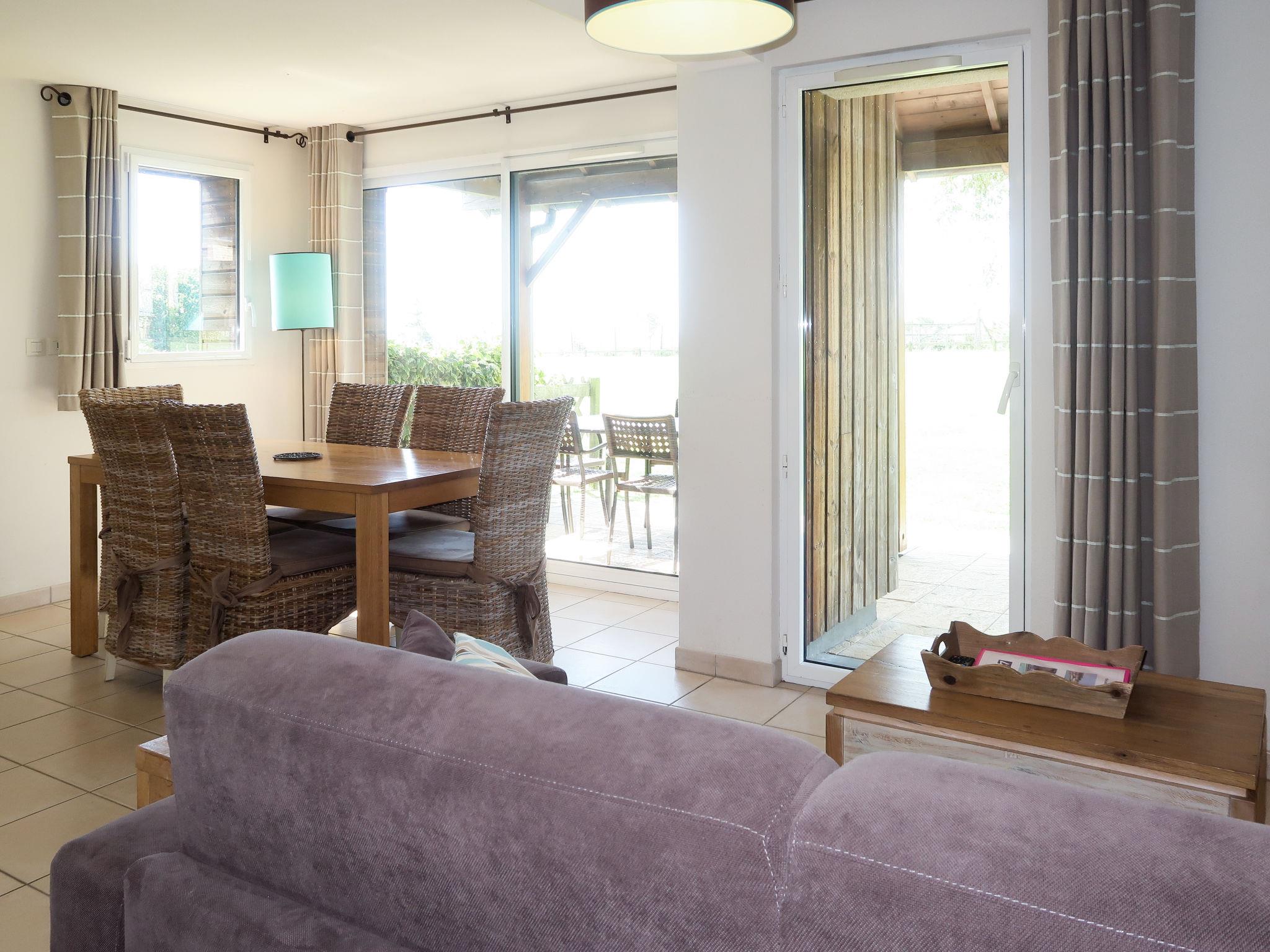 "Les Hauts de la Houle M.6X", 3-room terraced house 48 m2 on 2 levels. Beautiful and cosy furnishings: living/sleeping room with 1 double sofabed, dining table and TV. Exit to the terrace. Kitchenette (dishwasher, 2 ceramic glass hob hotplates, microwave). Sep. WC. Upper floor: 1 room with 1 french bed. 1 room with 2 beds. Bath/shower, sep. WC. Electric heating. Terrace. Terrace furniture. Facilities: children's high chair, baby cot (extra). Internet (WiFi, extra). Please note: maximum 2 pets/ dogs allowed. Smoke alarm.