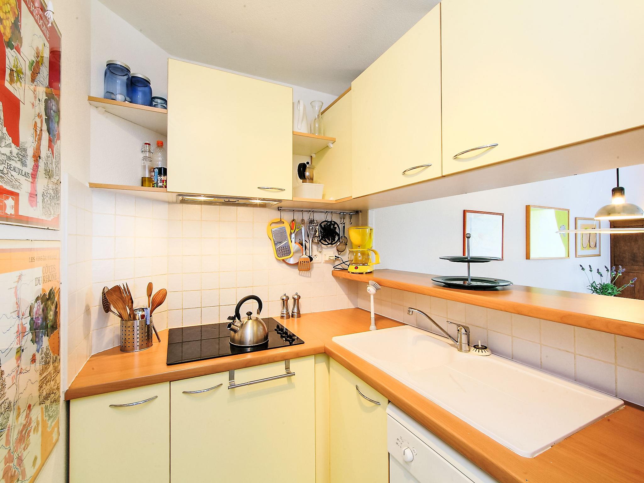 3-room apartment 48 m2 on 1st floor. Beautiful furnishings: living/dining room with flat screen and hi-fi system. Exit to the terrace. 1 room with 1 french bed (2 x 90 cm, length 190 cm). Exit to the terrace. 1 children's room with 1 x 2 bunk beds (90 cm, length 190 cm). Exit to the terrace. Open kitchen (dishwasher, 4 ceramic glass hob hotplates, toaster, kettle, microwave, electric coffee machine, combination microwave). Bathroom, sep. WC. Heating. Small terrace 8 m2, east facing position, small terrace 8 m2, west facing position. Terrace furniture. Beautiful view of the sea and the mountains. Facilities: washing machine, iron, hair dryer. Internet (WiFi, extra). Garage. Please note: smoke alarm. FR6660.180.4