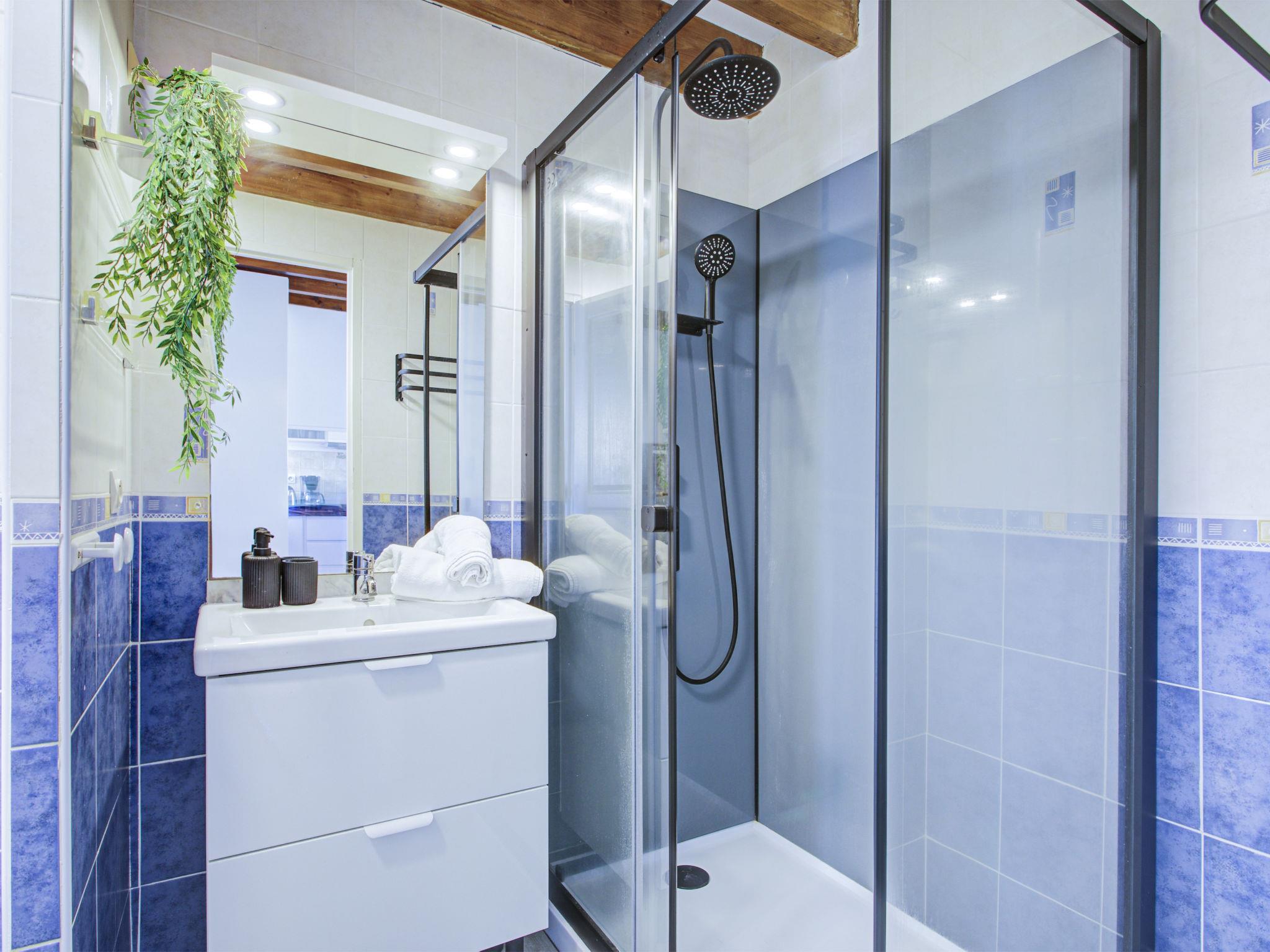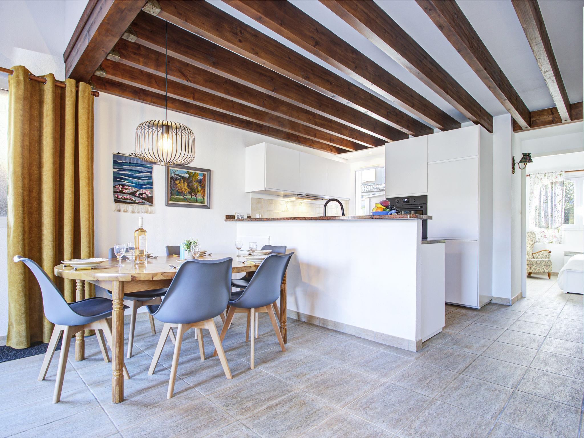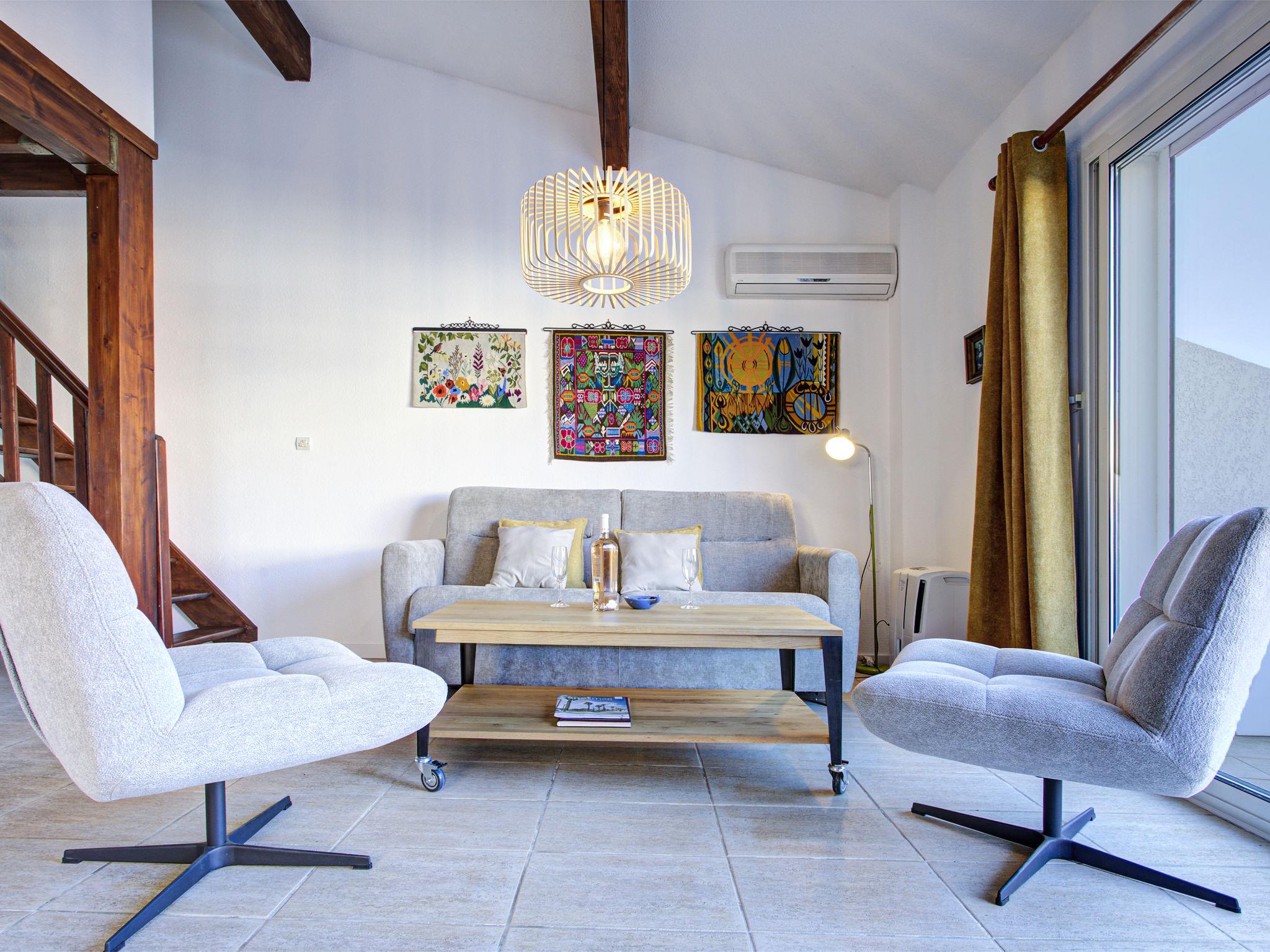 3-room house 73 m2 on 2 levels. Comfortable and beautiful furnishings: living/dining room with 1 double sofabed (1 x 140 cm, length 190 cm), TV, flat screen and air conditioning. Exit to the terrace. 1 room with 1 french bed (1 x 140 cm, length 190 cm), air conditioning. Open kitchen (oven, dishwasher, 4 ceramic glass hob hotplates, toaster, kettle, freezer, electric coffee machine). Shower/WC. Electric heating. Upper floor: 1 room with 1 french bed (1 x 160 cm, length 200 cm), air conditioning. Shower/WC. Terrace 25 m2, north facing position and west facing position terrace 70 m2, east facing position. Terrace furniture. Facilities: washing machine. Internet (WiFi). Parking. Please note: non-smokers only. Smoke alarm. Offer by a private individual according to Art. 155, IV of CGI.