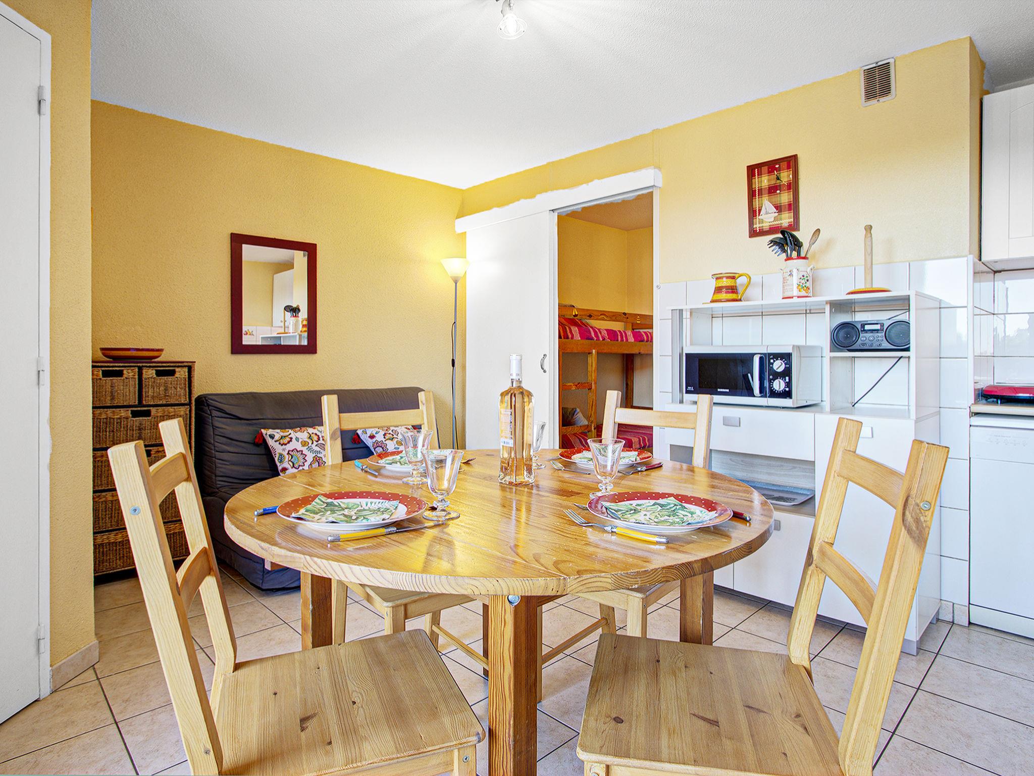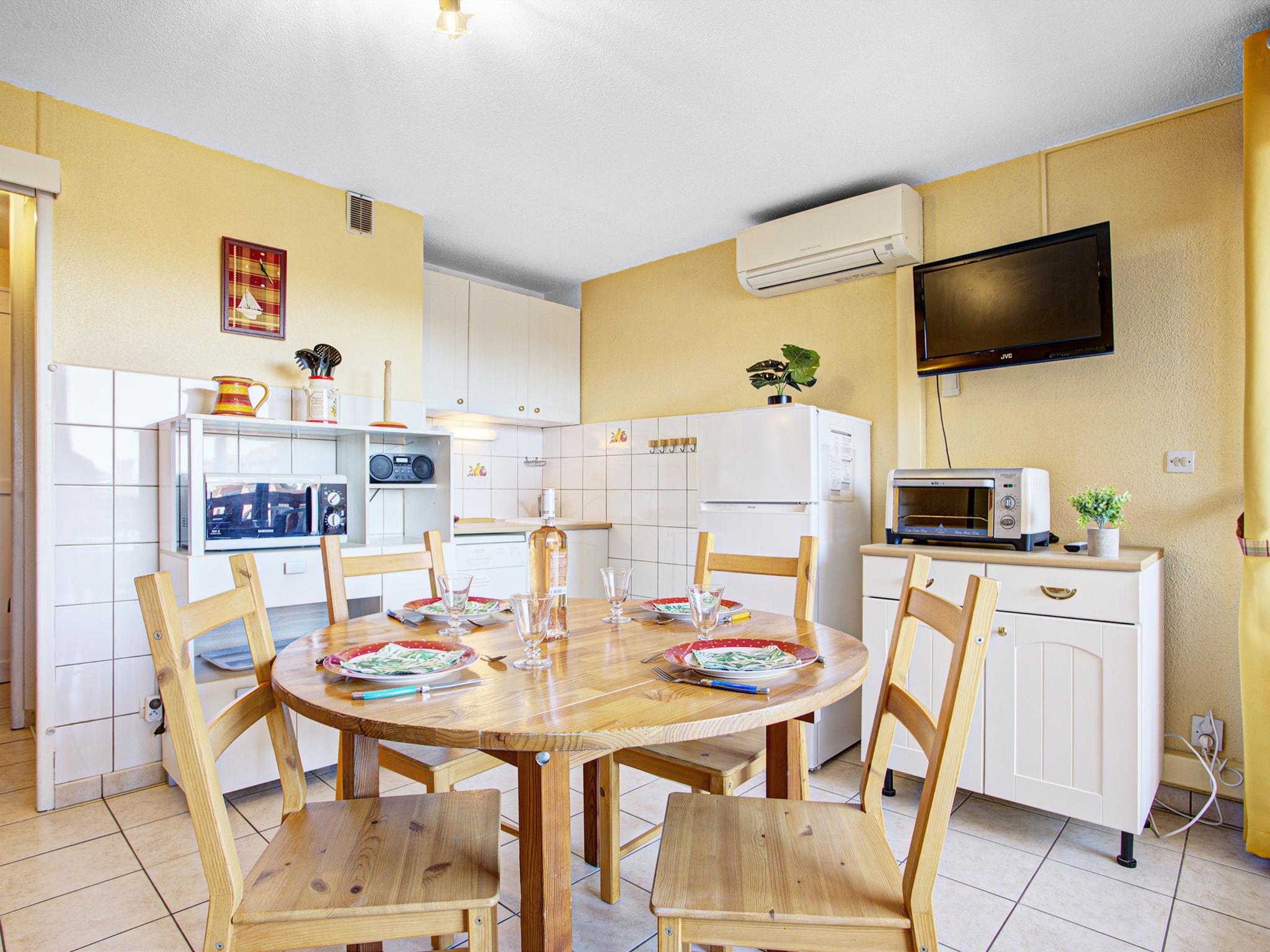 2-room apartment 25 m2 on 2nd floor. Beautiful furnishings: living/dining room with TV (flat screen). Exit to the balcony. 1 small room with 1 french bed (140 cm, length 190 cm). Entrance hall with 1 x 2 bunk beds (70 cm, length 190 cm). Kitchenette (2 hot plates, mini-oven, dishwasher, microwave, freezer, electric coffee machine). Shower/WC. Air-conditioning, forced-air heating. Balcony 5 m2, east facing position. Terrace furniture. Beautiful view of the swimming pool. Facilities: washing machine. Internet (WiFi, extra). Parking. Please note: smoke alarm, no lift.