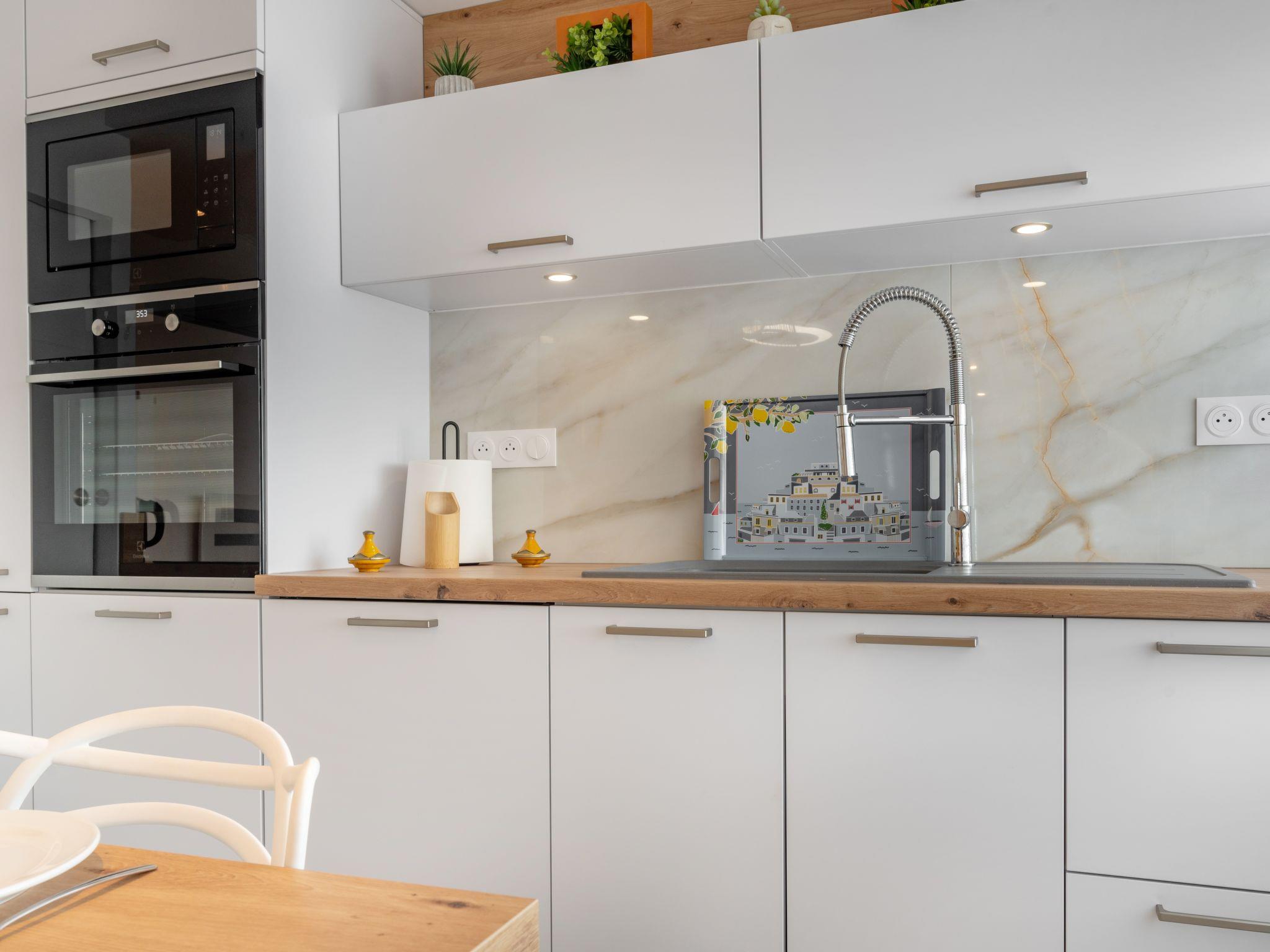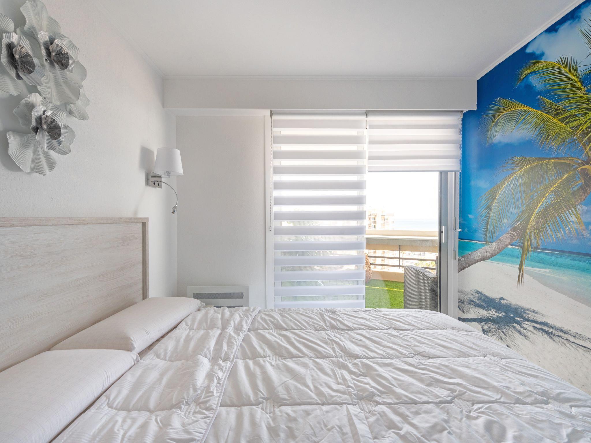 "Terrasses du Levant", 2-room apartment 40 m2 on 7th floor, east facing position. Fully renovated in 2022, very beautiful and tasteful furnishings: living/dining room with TV (flat screen), air conditioning. Exit to the terrace, east facing position. 1 room with 1 french bed (1 x 160 cm, length 200 cm), TV, air conditioning and fan. Exit to the terrace. Large, open kitchen (oven, dishwasher, 4 induction hot plates, toaster, kettle, microwave, electric coffee machine, cooking island). Shower, sep. WC. Large terrace 20 m2, east facing position. Terrace furniture. Very beautiful view of the sea. Facilities: washing machine, dryer, iron, hair dryer. Internet (WiFi, free). Parking space n 261. Offer by a private individual according to Art. 155, IV of CGI.