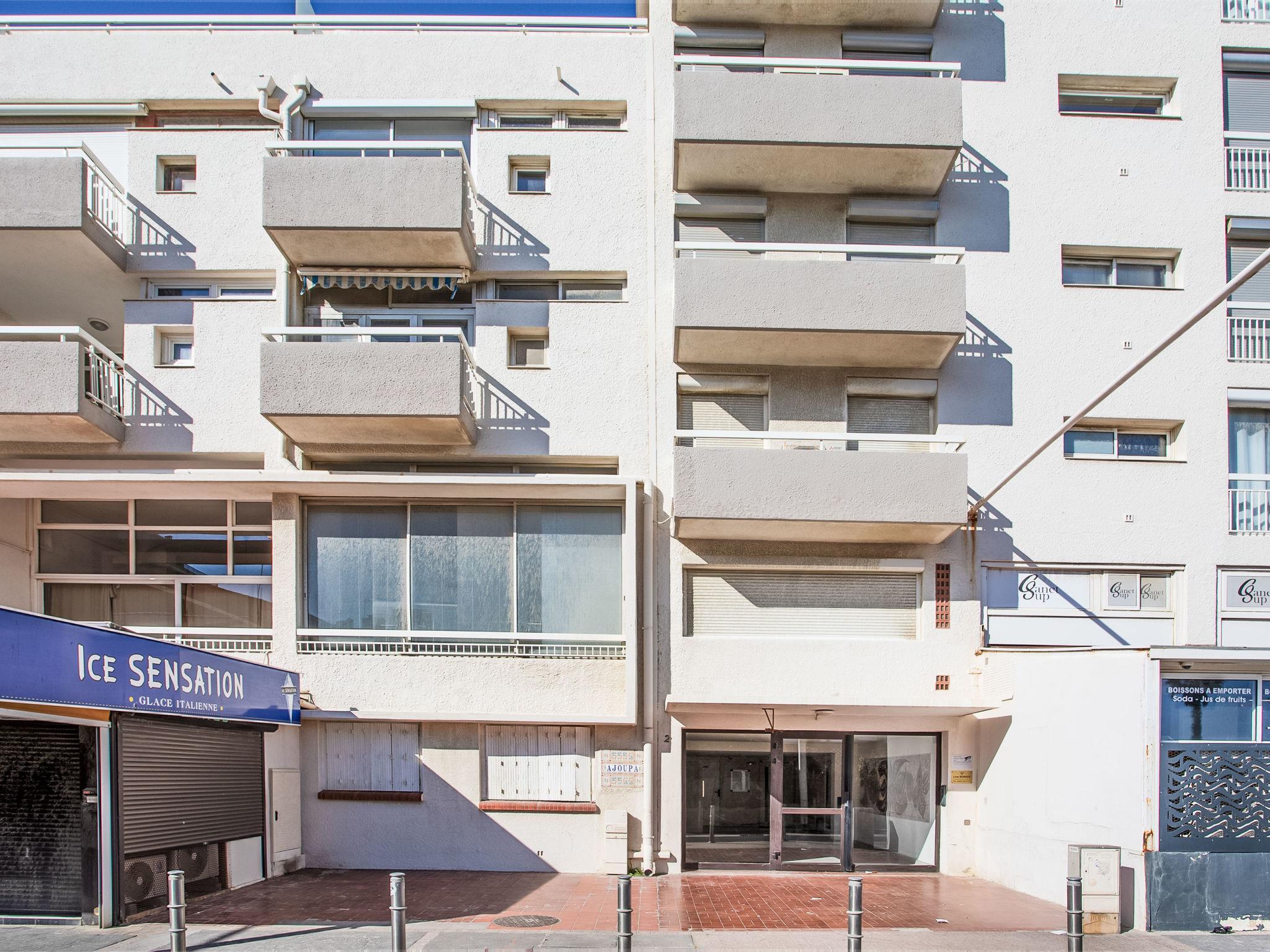 Canet Plage: Residence "Ajoupa", 6 storeys. In the district of de la Place Méditerranée, 20 m from the sea, road to cross. In the complex: lift. Public car park at 100 m. Shop, grocery 50 m, supermarket 10 m, shopping centre 8 km, restaurant 30 m, bakery 20 m, café 10 m, pedestrian zone 20 m, bus stop 100 m, railway station "Perpignan" 12 km, sandy beach 20 m, diving center 18 km, outdoor swimming pool 1 km, indoor swimming pool 1 km, lake Etang de Canet 3 km. Sports harbour 800 m, golf course (21 hole) 8 km, tennis, minigolf 600 m. Nearby attractions: Perpignan 12 km, Collioure 25 km, Banyuls 37 km, Espagne 35 km, Andorre 180 km, Barcelone 200 km. Well-known lakes can easily be reached: Villeneuve de la Raho 19 km, ST Jean Pla de Corts 39 km, Gorges du Gouleyrous 42 km. Hiking paths: St Martin du Canigou 70 km, Pic du Canigou 77 km, Lac des Bouillouses 105 km.