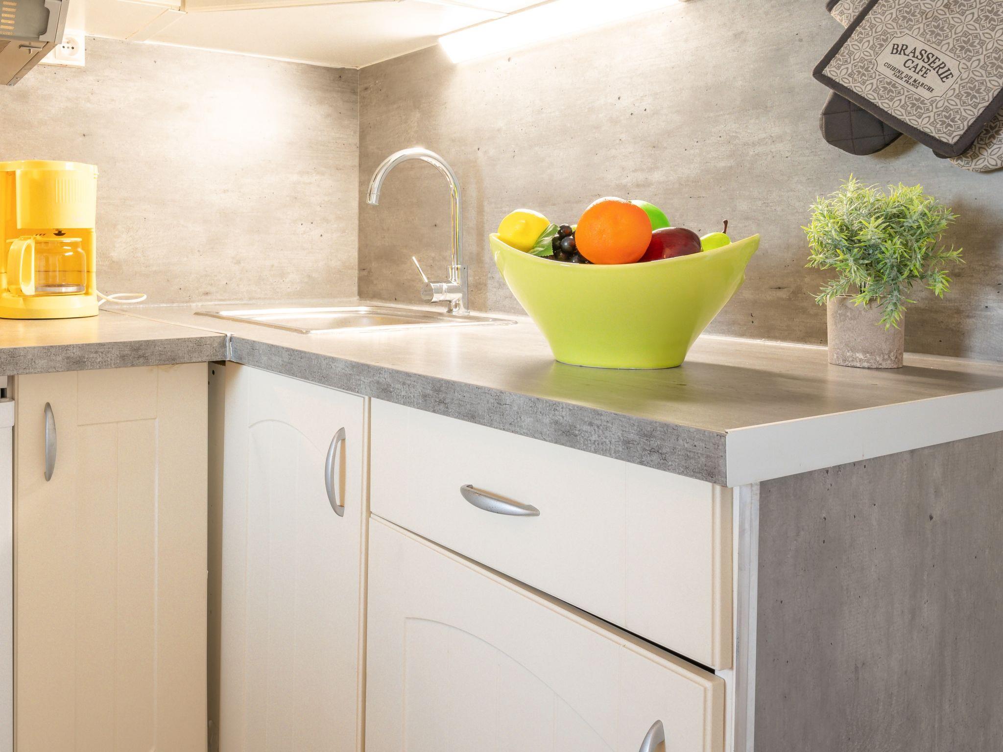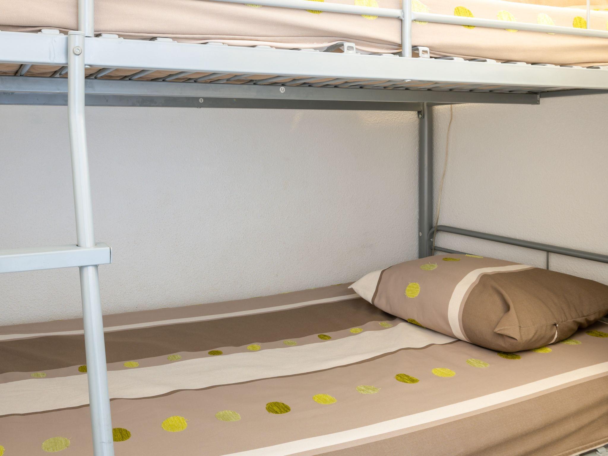 2-room apartment 28 m2 on 5th floor. Very practical furnishings: living/dining room with TV (flat screen). Exit to the loggia. 1 room with 1 french bed (140 cm, length 190 cm). Sleeping alcove with 1 x 2 bunk beds (90 cm, length 190 cm). Kitchenette (2 ceramic glass hob hotplates, toaster, microwave, electric coffee machine, combination microwave). Shower, sep. WC. Electric heating. Terrace 7 m2. Balcony furniture. Beautiful view of the sea. Facilities: washing machine. Internet (WiFi, extra). Parking (fenced). Instead of an enclosed bedroom, some sleeping areas are located in an open-plan area (gallery, alcove, etc.).
