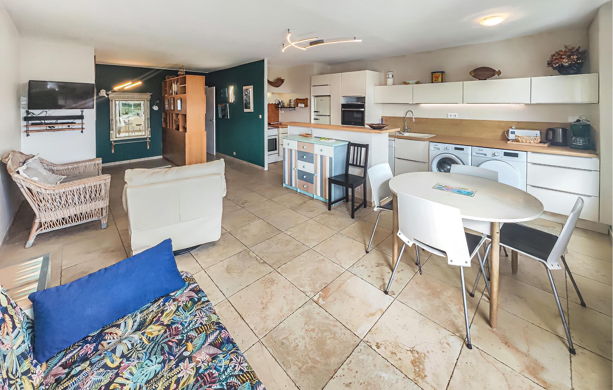 Denne lyse og indbydende lejlighed venter jer i den afslappede havn i Cap d'Agde og tilbyder den perfekte mulighed for at kombinere afslappende dage ved havet med dejlige udflugter ind i landet. Tilbered lækre måltider i det åbne køkken, planlæg jeres aktiviteter ved det indbydende spisebord og læn jer tilbage på sofaen efter en lang dag med et brætspil eller en god bog.
