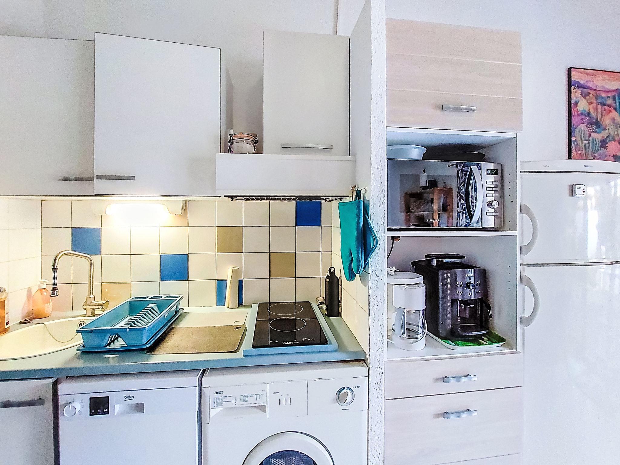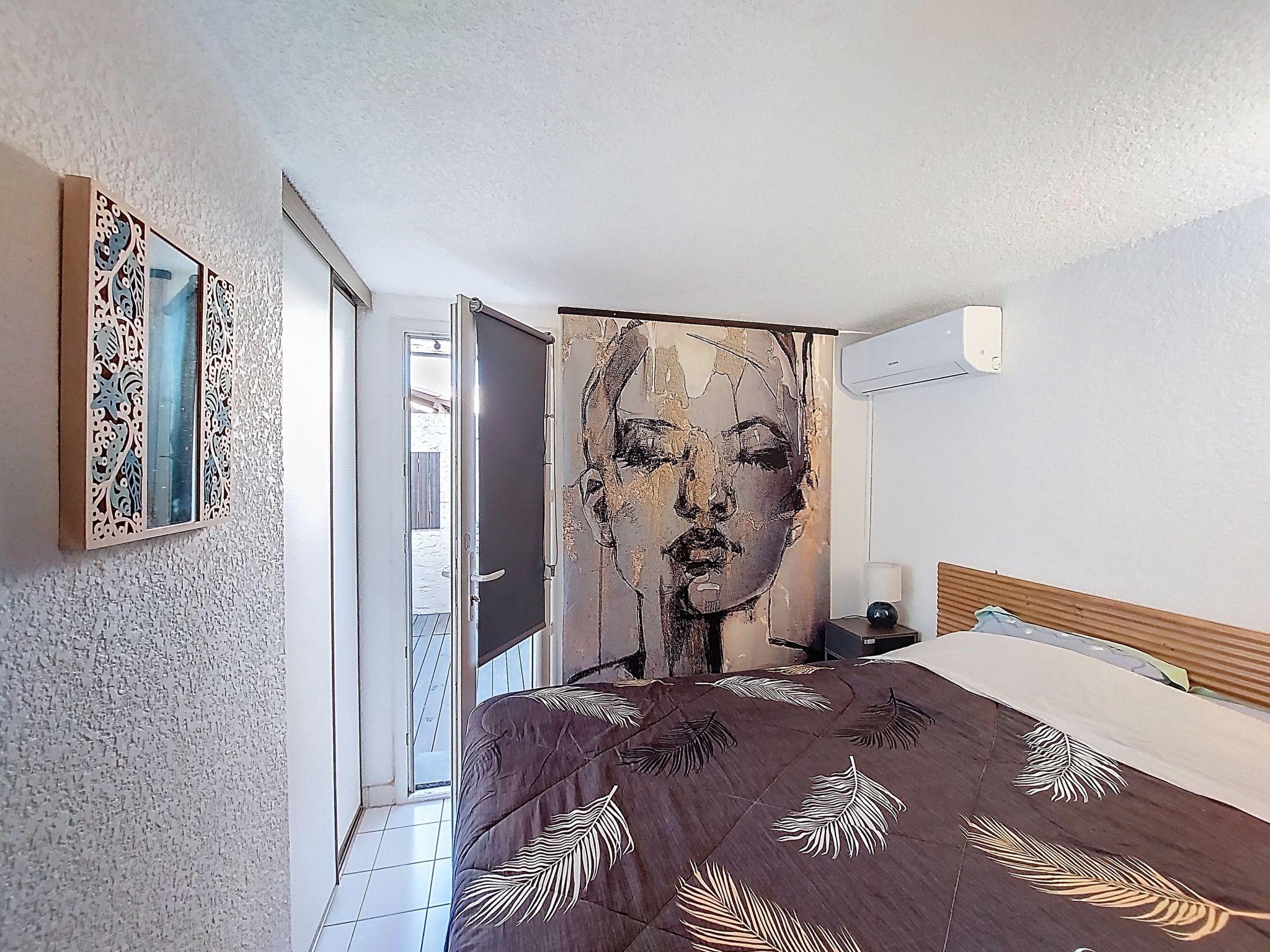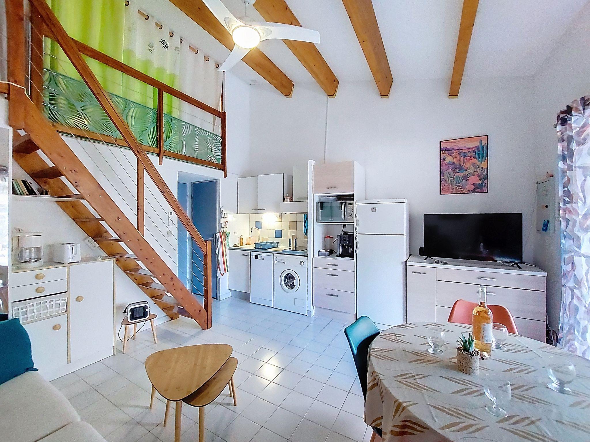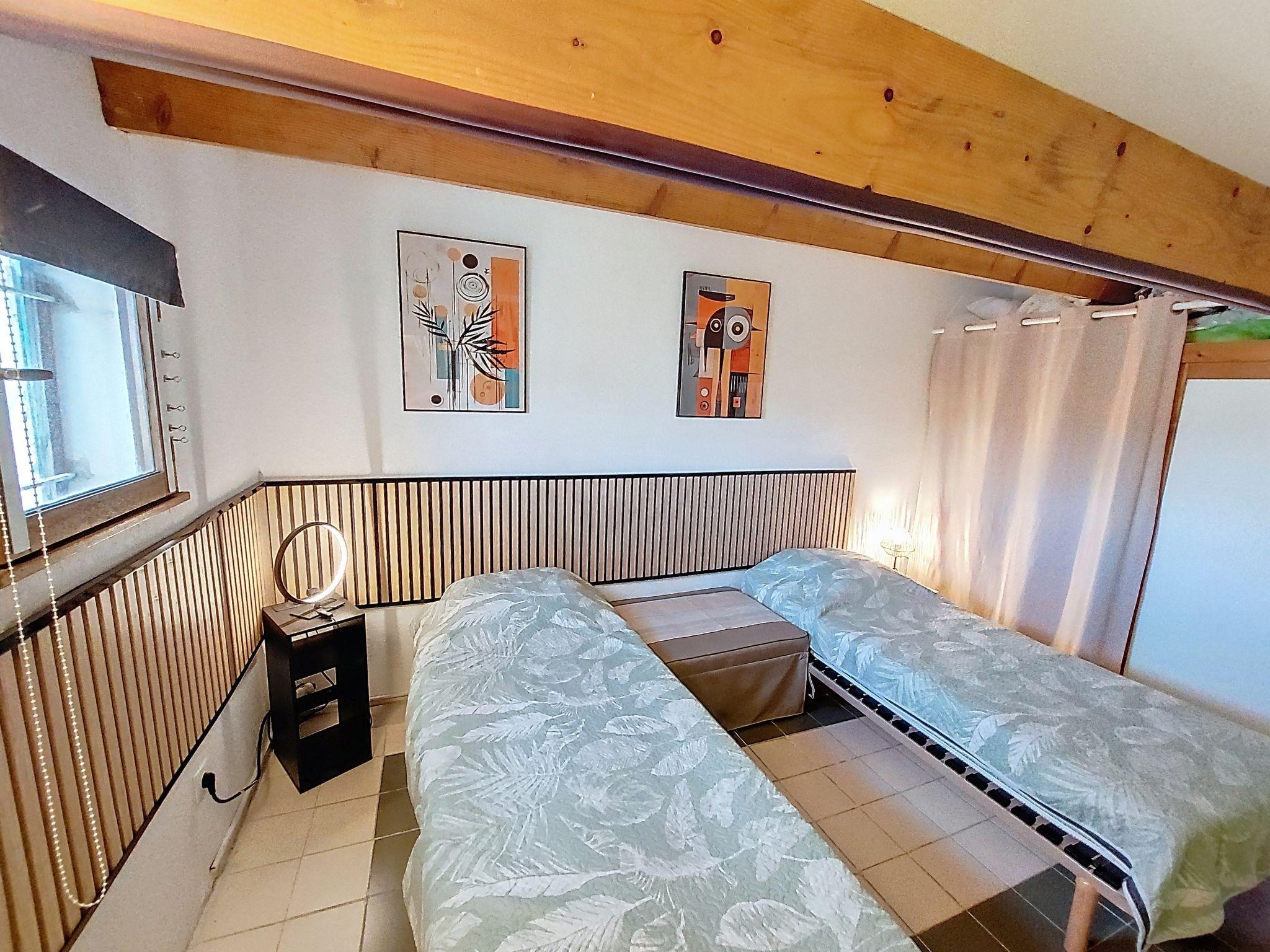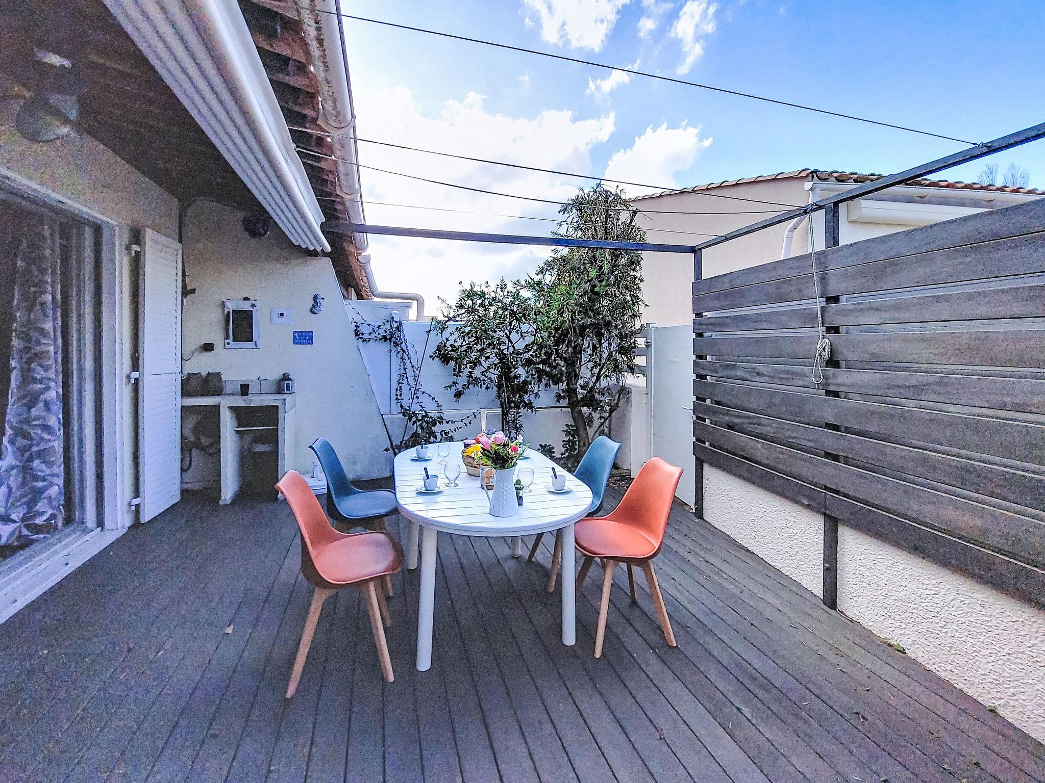 2-room terraced house 40 m2 on 2 levels. Living/dining room with TV (flat screen), air conditioning and forced-air heating. Exit to the terrace. 1 room with 1 french bed (140 cm, length 190 cm). Kitchenette (2 hot plates, dishwasher, electric coffee machine, combination microwave). Shower, sep. WC. Upper floor: gallery with sloping ceilings, ceiling height 170 - 240 cm with 2 beds (80 cm, length 190 cm). Large terrace 27 m2. Facilities: washing machine. Internet (WiFi, extra). Parking space n 45. Please note: non-smoking house. Smoke alarm. Offer by a private individual according to Art. 155, IV of CGI.