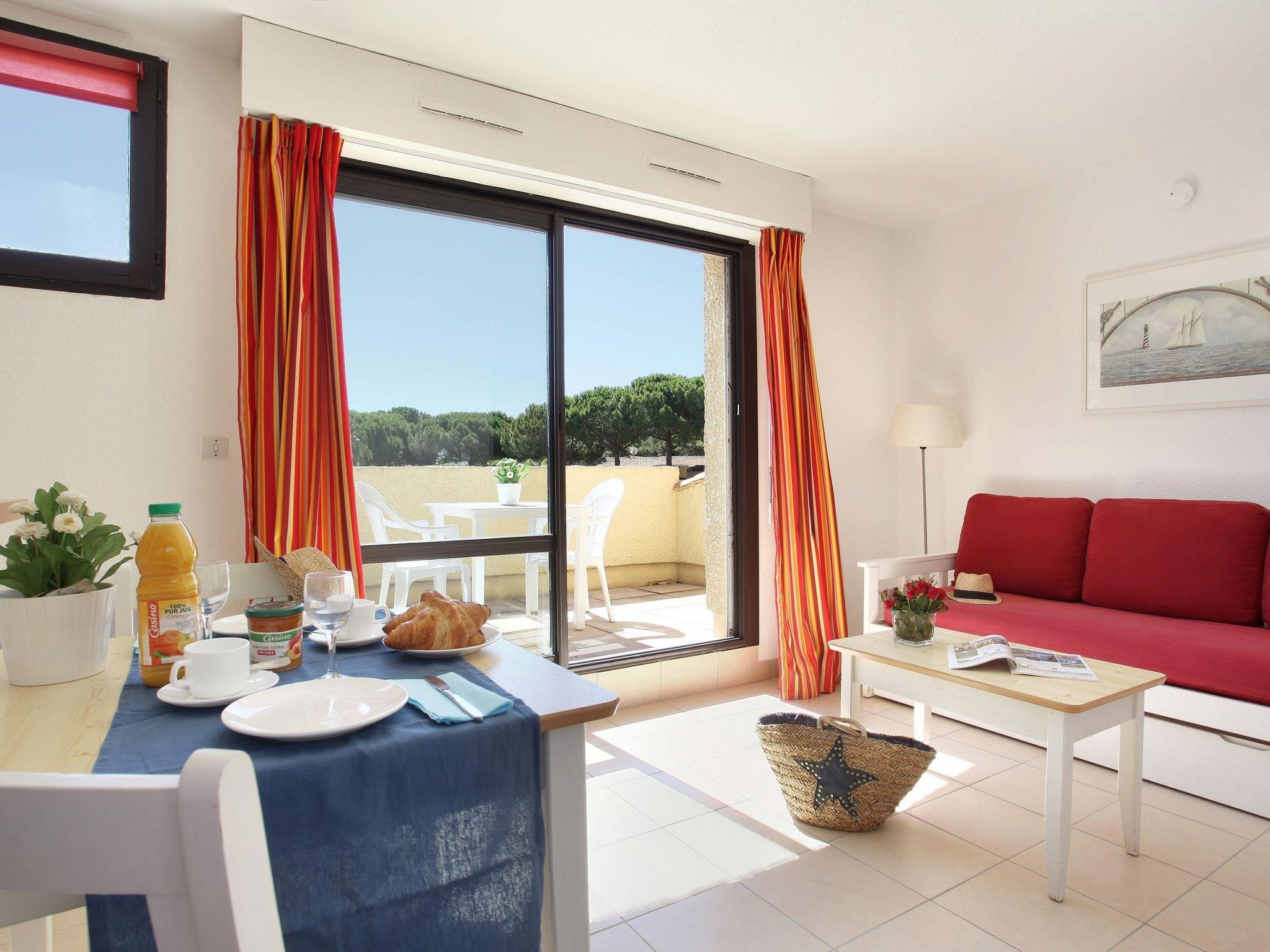 "Résidence Odalys Référence Saint Loup", 1-room apartment 18 m2, on the upper floor. Bright, practical furnishings: living/sleeping room with 2 sleeping facilities, dining table and TV. Exit to the balcony. Kitchenette (2 ceramic glass hob hotplates, microwave, electric coffee machine). Shower/WC. Electric heating. Balcony. Balcony furniture. Facilities: children's high chair, baby cot (extra). Internet (WiFi, free). Please note: non-smokers only. Smoke alarm, fire extinguisher.