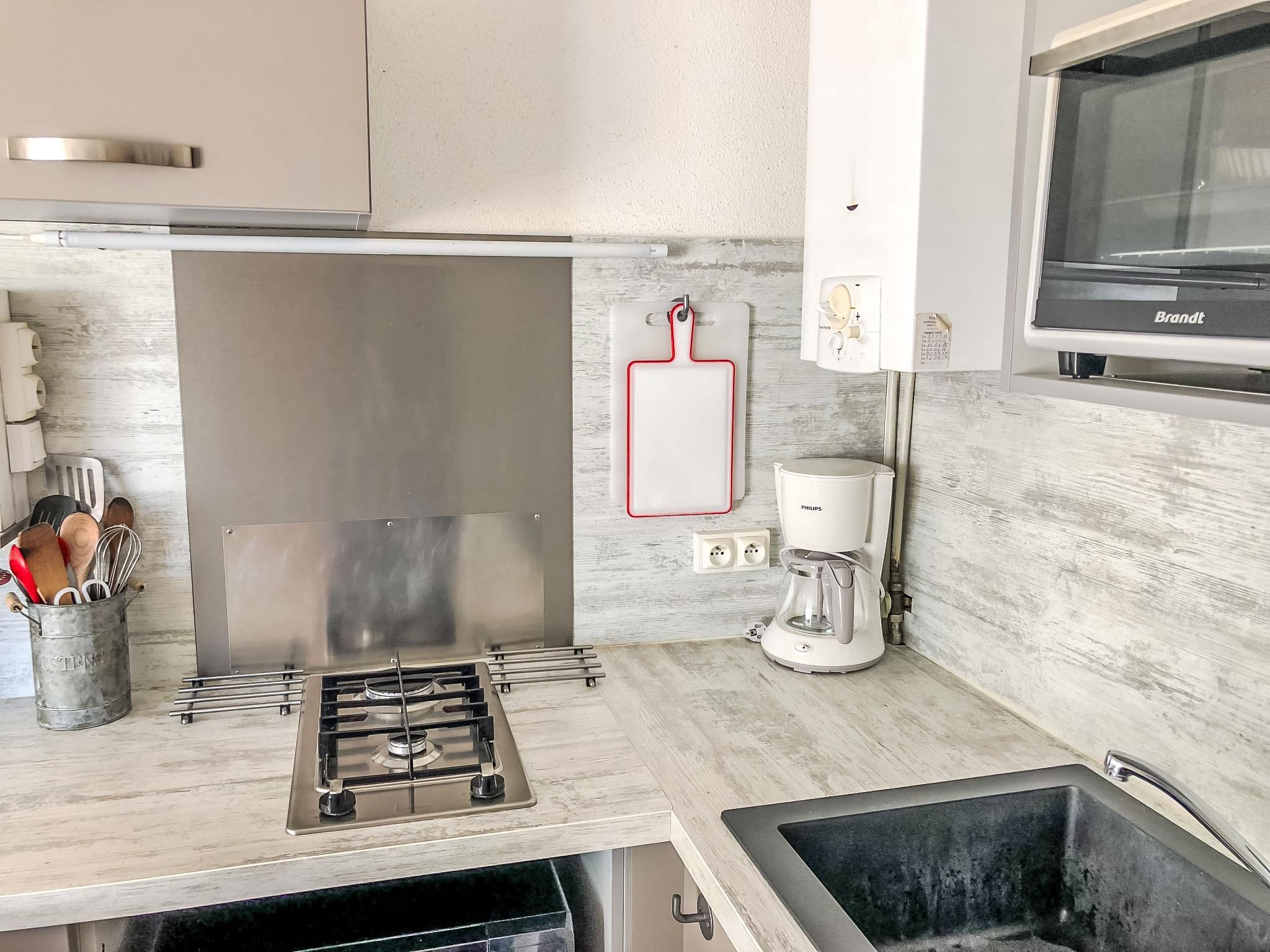 2-room apartment 32 m2, on the ground floor, east facing position. Living/dining room with 1 double sofabed (140 cm, length 190 cm). Exit to the terrace. 1 room with 2 beds (80 cm, length 190 cm). Exit to the terrace. Kitchenette (2 hot plates, oven, microwave, electric coffee machine) with TV. Shower/WC. Electric heating. Terrace 14 m2. Terrace furniture. Facilities: iron. Internet (WiFi, extra). Parking space n 1202. Please note: maximum 1 pet/ dog allowed. Smoke alarm.