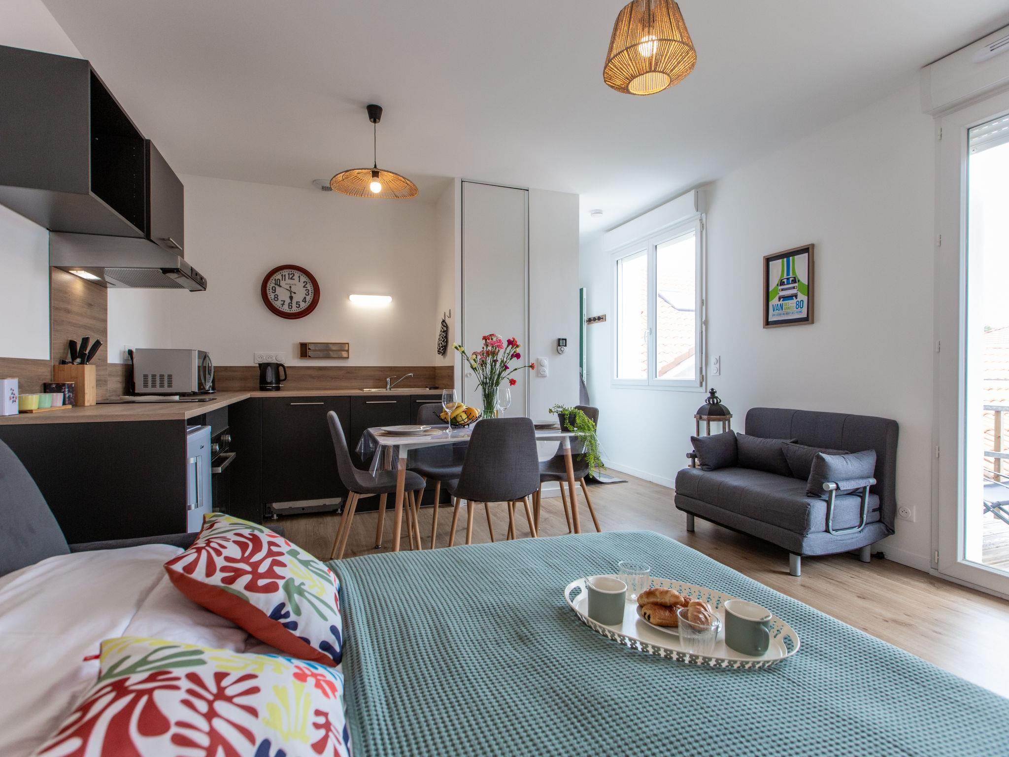 1-room studio 26 m2 on 2nd floor. Modern and cosy furnishings: living/dining room with 1 double sofabed (140 cm, length 190 cm), TV (flat screen). Exit to the balcony. Open kitchen (oven, 2 ceramic glass hob hotplates, toaster, kettle, microwave, electric coffee machine). Shower/WC. Electric heating. Balcony 4 m2. Balcony furniture. Facilities: hair dryer. Internet (WiFi, extra). Offer by a private individual according to Art. 155, IV of CGI. 40065001458VO