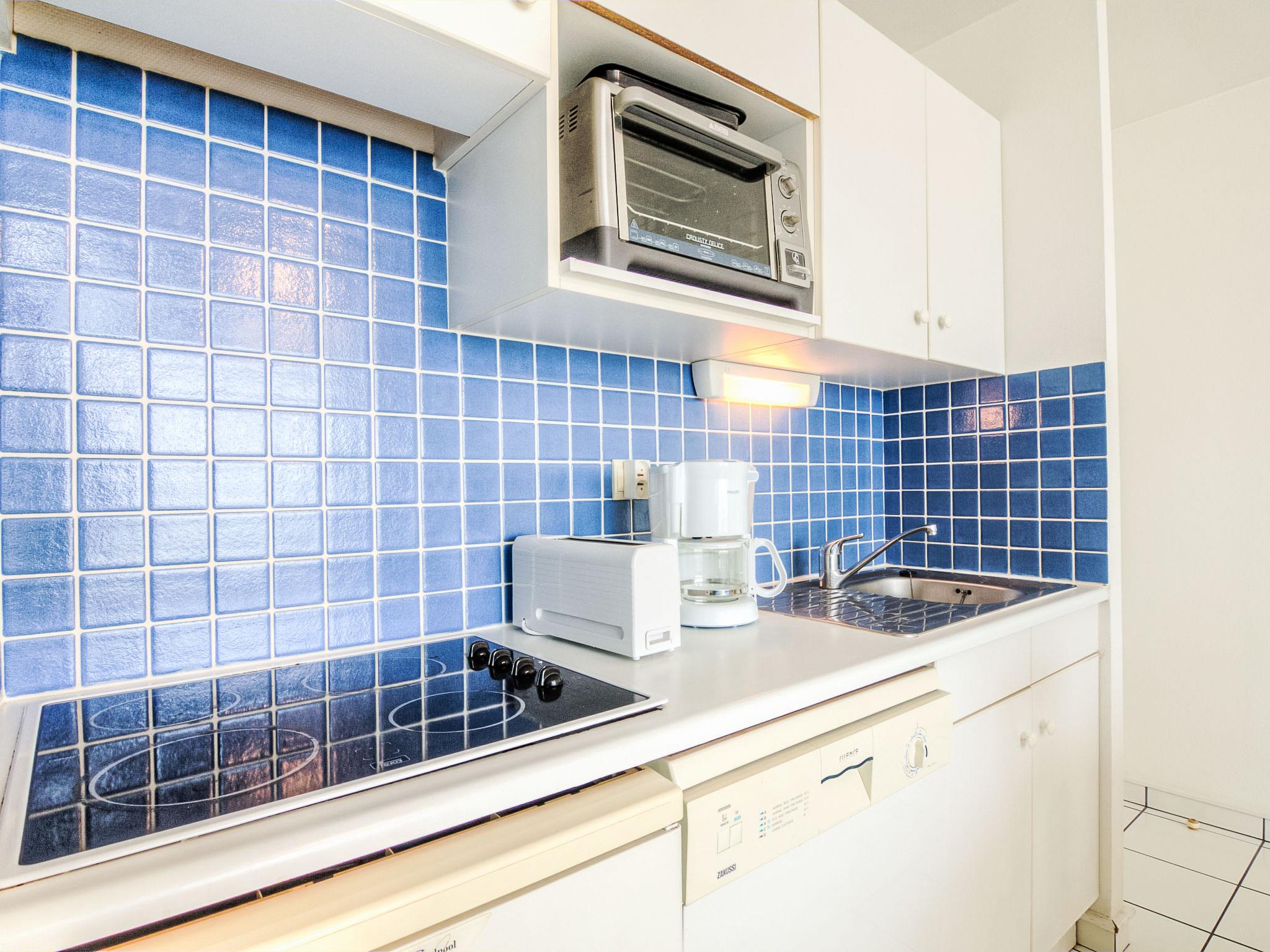 3-room maisonette 45 m2 on 1st floor. Beautiful furnishings: living/dining room with 1 double sofabed (1 x 140 cm, length 190 cm), TV (flat screen). Exit to the balcony. 1 room with 1 french bed (1 x 140 cm, length 190 cm), bath/shower. Kitchenette (dishwasher, 4 ceramic glass hob hotplates, microwave). Sep. WC. Upper floor: 1 room with 2 beds (90 cm, length 190 cm), shower. Electric heating. Balcony furniture. View of the swimming pool. Facilities: washing machine. Internet (WiFi, free). Parking space n 80. Please note: suitable for families. Maximum 1 pet/ dog allowed. Smoke alarm. 56034000807B4