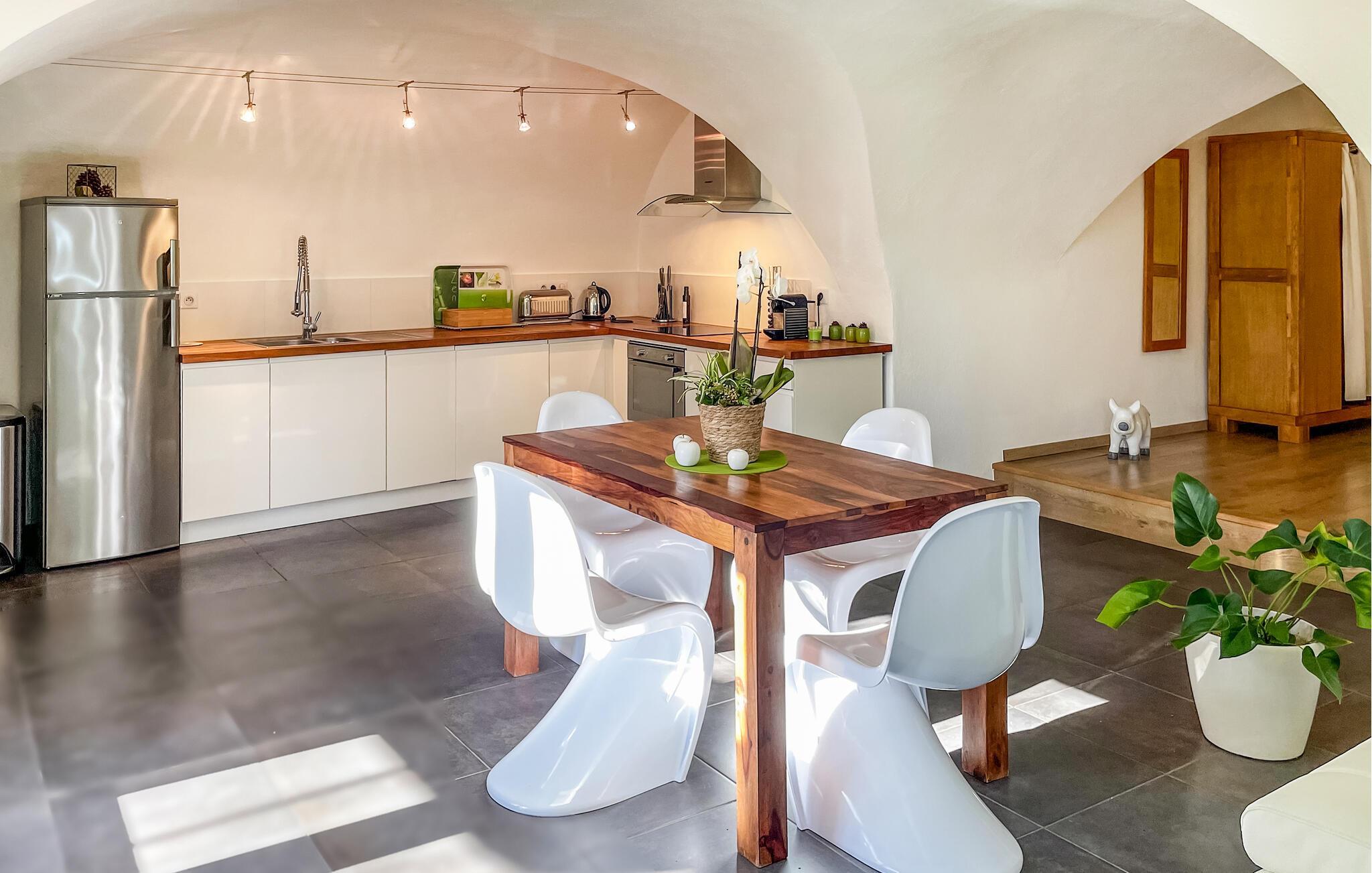 Denne ferielejlighed i et historisk kloster fra det 9. århundrede er et ideelt tilflugtssted for en romantisk ferie. Beliggende blandt vinmarker er denne fredfyldte bolig en del af en prestigefyldt ferieudlejning bestående af seks charmerende enheder, alle designet til par. Lejligheden har et indbydende opholdsområde i åbent rum med hvælvede lofter. Det har et opholdsområde, der er møbleret med to komfortable sofaer, et fladskærms-tv og en Harman Kardon Bluetooth-højttaler. Spisepladsen støder op til et veludstyret køkken med moderne bekvemmeligheder. Udenfor har ejendommen en stor grund, hvor gæsterne kan vandre midt i den maleriske udsigt over vingårdene. En fælles swimmingpool, sikret af et alarmsystem, inviterer til afslapning, ledsaget af en overdækket terrasse. Derudover fuldender en dedikeret jacuzzi-terrasse, grill og petanquebane de udendørs faciliteter. Et vaskerum, der deles mellem beboerne, sikrer bekvemmelighed under dit ophold. Ejendommen ligger mellem Nîmes og Montpellier, tæt på landsbyen Carnas, nær den middelalderlige landsby Sommières. Med 300 solskinsdage om året byder dette hjørne af paradis i den provencalske Gard på landskaber af sjælden skønhed: 30 minutter til Camargue og sandstrandene i Languedoc. Et stenkast væk afslører nationalparken Cévennes lige så spektakulære landskaber. Regionen er rig på en fantastisk historisk arv: Byen Avignon, de romerske byer Nîmes og Arles, Pont du Gard, Hertugdømmet Uzès, de historiske Languedoc-byer Montpellier, Pézenas, Aigues-Mortes, Sommières og Sauve og et væld af charmerende landsbyer at besøge. Denne ferieejendom er et ideelt udgangspunkt for at opdage Camargue, Cevennerne, Gard Provençal, Languedoc.
