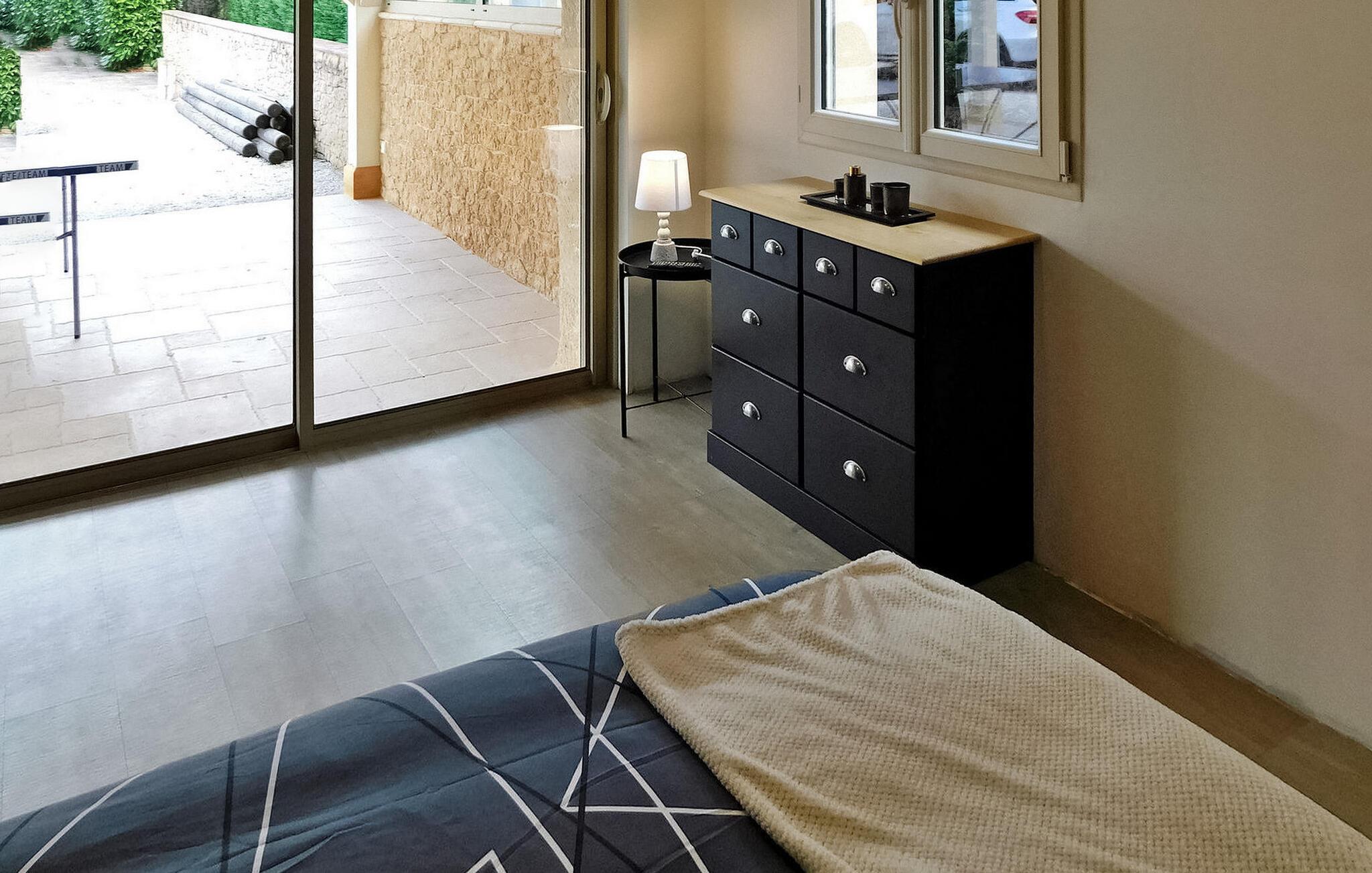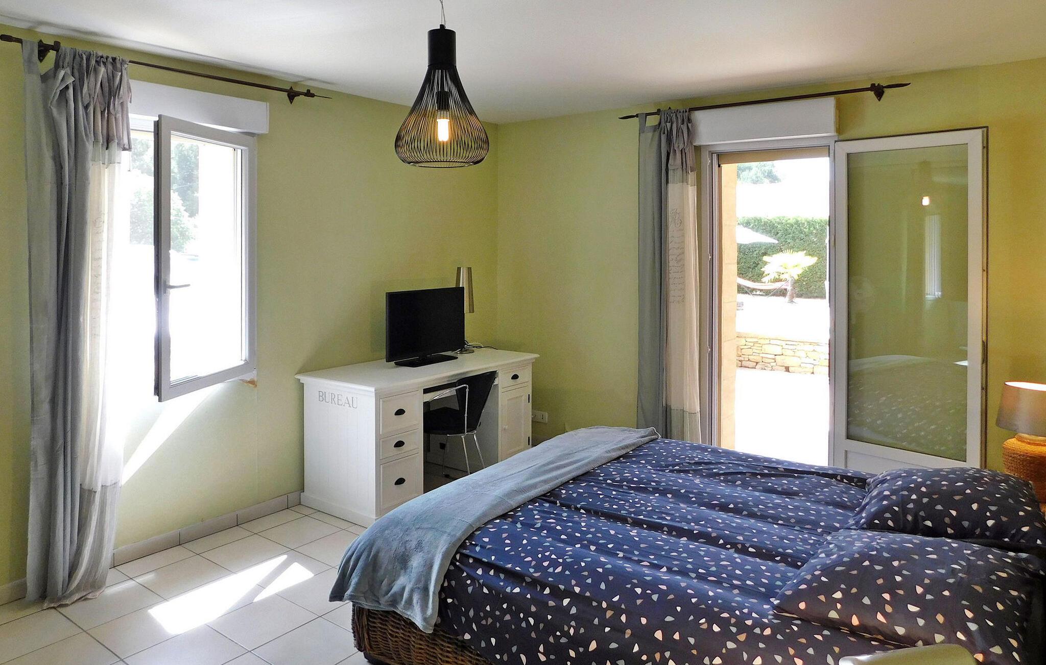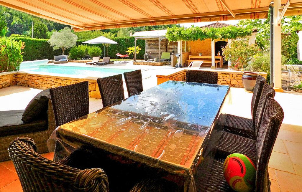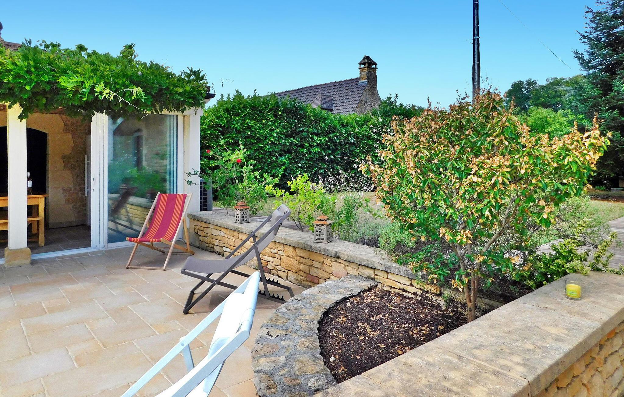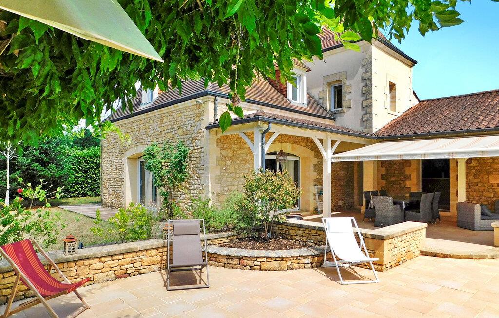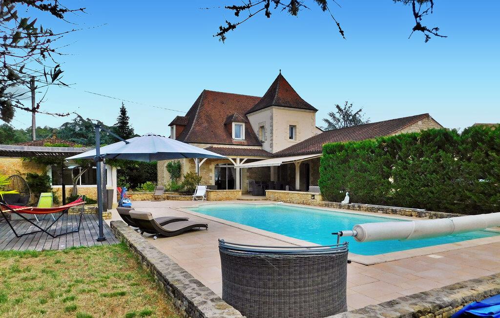 Beliggende nær Sarlat i Dordogne, dette rummelige feriehus rummer gæster på tværs af et hovedhus og en tilstødende udhus og er kun 15 minutters gang til de nærmeste butikker. Hovedhuset har en indbydende indgang, der fører til et selvstændigt køkken og vaskerum. Det består af tre soveværelser. Det generøse opholdsområde åbner ud til terrasserne og poolen og tilbyder spiseplads og et komfortabelt opholdsområde. Det uafhængige udhus er vært for et ekstra soveværelse med privat brusebad og et fitnesscenter udstyret med fitnessudstyr og en vægmonteret fladskærm. Udenfor er der en rummelig overdækket terrasse, der støder op til køkkenet og opholdsstuen, med udendørsmøbler. Et poolhus med faciliteter, herunder et amerikansk køleskab og gasplade, supplerer det overdækkede, skyggefulde afslapningsområde udsmykket med liggestole og puder. Den 11m x 5m opvarmede swimmingpool, med hjørnetrapper og en dykkeralarm, byder på et forfriskende tilflugtssted. Bemærk: Ejendommen er beliggende langs en lille sekundær vej, der giver nem adgang til nærliggende faciliteter. Huset ligger i udkanten af landsbyen langs en bivej, der fører til landsbyen. Alle butikker ligger i gåafstand (500 m). Den smukke middelalderby Sarlat (alle butikker, restauranter og faciliteter) ligger 9 km væk.