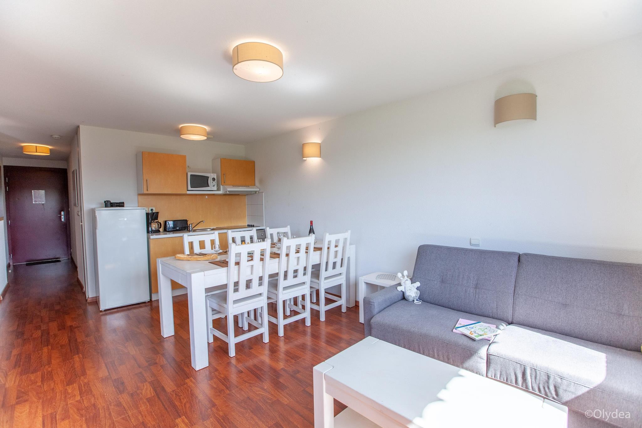 Denne feriebolig på Adonis Cassen, beliggende midt i Cassens grønne, åbne landskaber, tilbyder et afslappende miljø til en afslappet ferie. Denne lejlighed kombinerer enkelhed indendørs med behagelige udendørsområder, hvilket gør den til et komfortabelt valg for par, venner eller små familier, der ønsker plads, luft og ro. Indenfor tilbyder stuen/spisestuen en afslappet atmosfære med en dobbelt sovesofa, tv og spisebord til fælles stunder. Det kompakte tekøkken er udstyret med kaffemaskine, opvaskemaskine og køleskab, så du kan tilberede måltider uden besvær. Sovepladserne omfatter tre hyggelige soveværelser - to med dobbeltsenge hver, og det tredje soveværelse har to enkeltsenge, hvilket gør nætterne fleksible og afslappende, og det moderne badeværelse har bruser og toilet. Med både aircondition og varme er lejligheden komfortabel i enhver sæson. Træd udenfor, og du vil finde indbydende steder at nyde den friske landluft. En balkon og terrasse åbner ud mod en have udstyret med møbler til afslapning og udendørs måltider. Den fælles swimmingpool, åben fra april til september, bliver højdepunktet på solrige dage. Gæsterne kan benytte sig af parkering på stedet, kæledyrsvenlig adgang og familiefaciliteter såsom en babyseng og højstol. Ud over boligen er Chalosse-området ideelt til afslappende udforskning - landbrugsstier, lokale markeder og naturskønne køreture gennem det landlige sydvestlige Frankrig. Kurbyen Dax ligger inden for rækkevidde, mens dagsture til Atlanterhavsstrandene omkring Hossegor giver dig mulighed for at balancere landskabsro med forfriskende havluft.