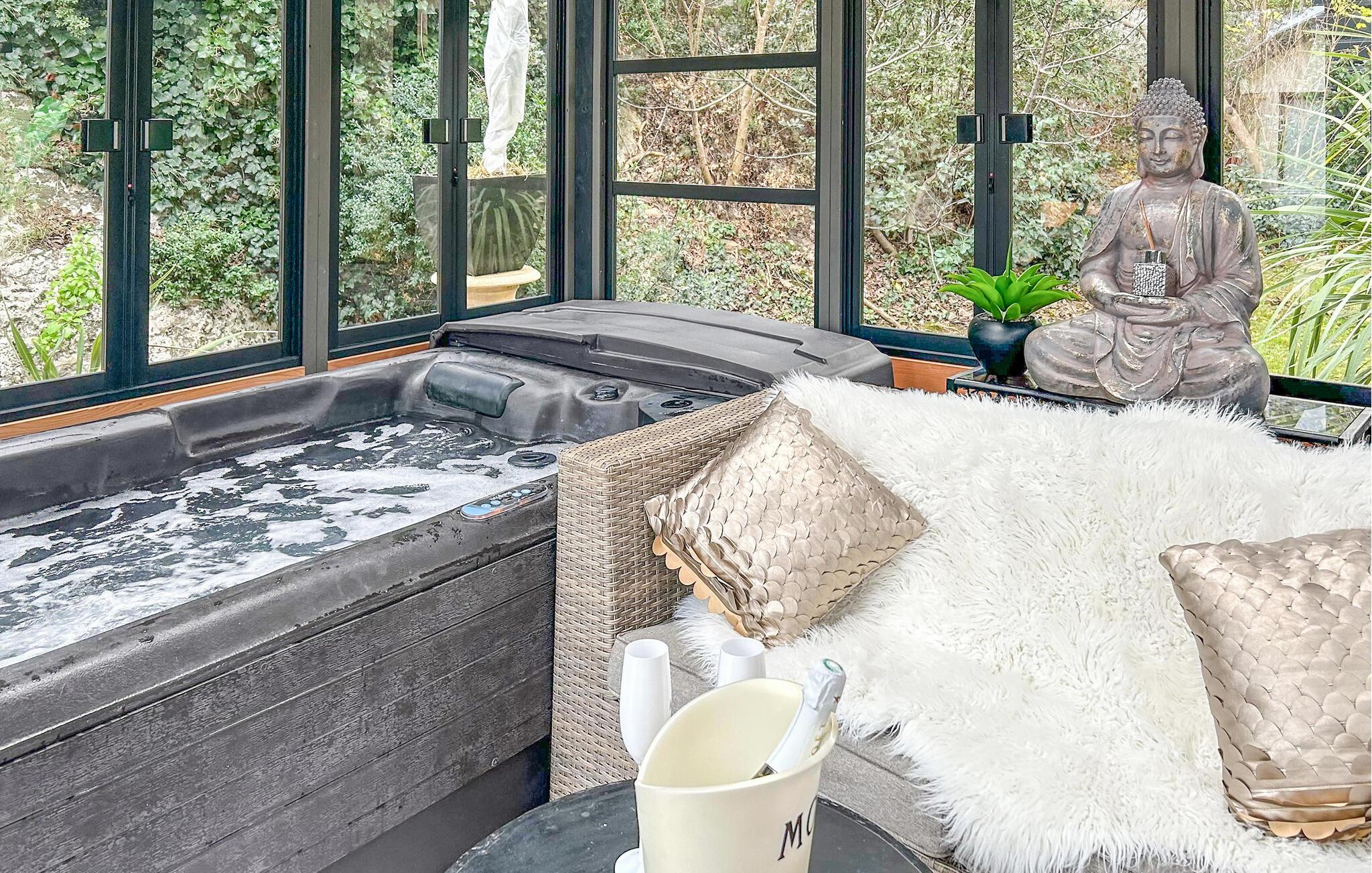 Slap af i det individuelt designede feriehus med spabad og pool.