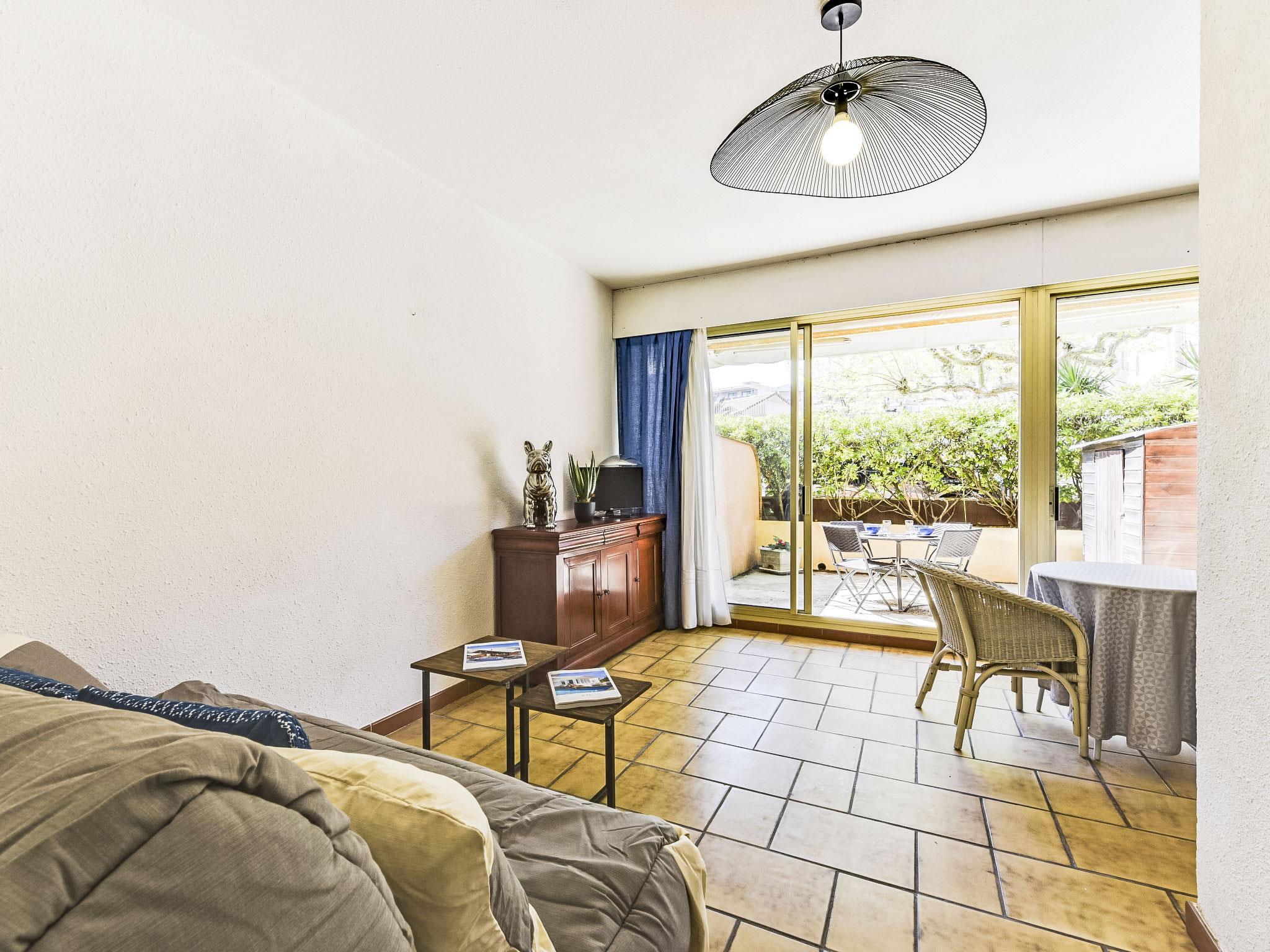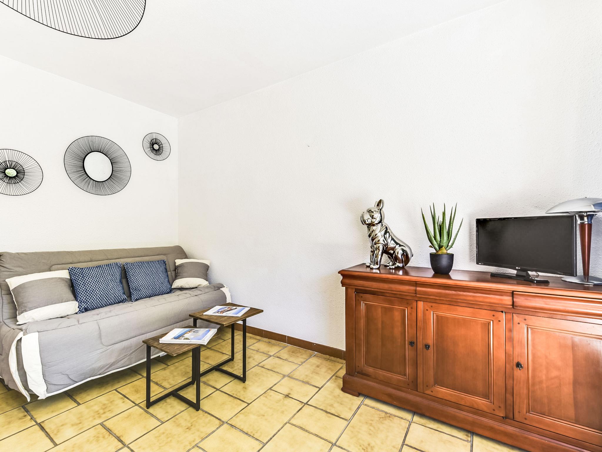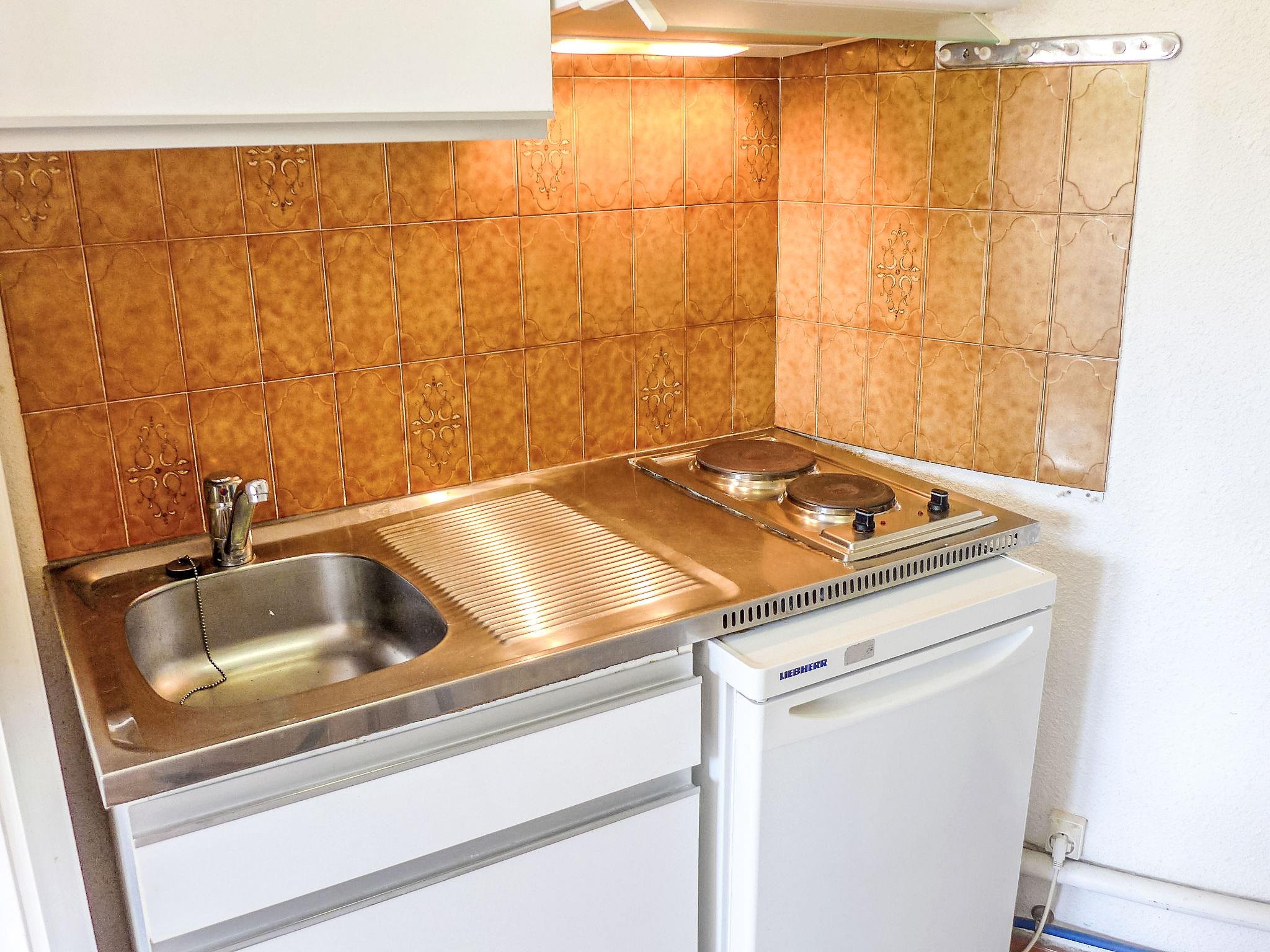 1-room studio 30 m2, on the ground floor, west facing position. Practical and beautiful furnishings: living/sleeping room with panoramic window with 1 sofabed (160 cm, length 200 cm), TV (flat screen). Exit to the terrace, west facing position. Kitchenette (2 hot plates, toaster, kettle, electric coffee machine, combination microwave). Shower, sep. WC. Electric heating, air-conditioning. Terrace 25 m2. Terrace furniture, deck chairs (2). Facilities: washing machine, iron, hair dryer. Internet (WiFi, extra). Parking space n 45. Please note: apartment carpark side. TV only FR. Smoke alarm.