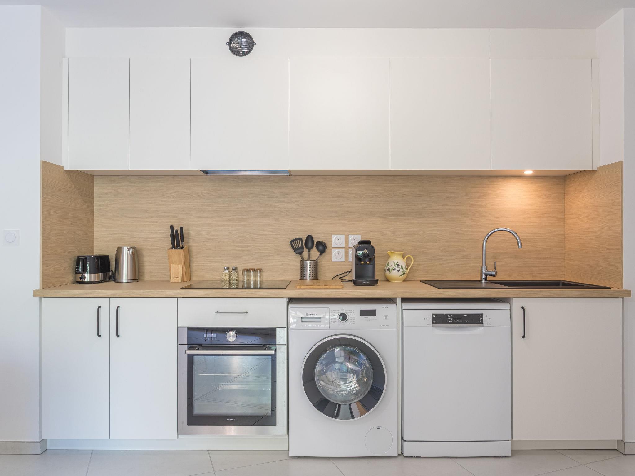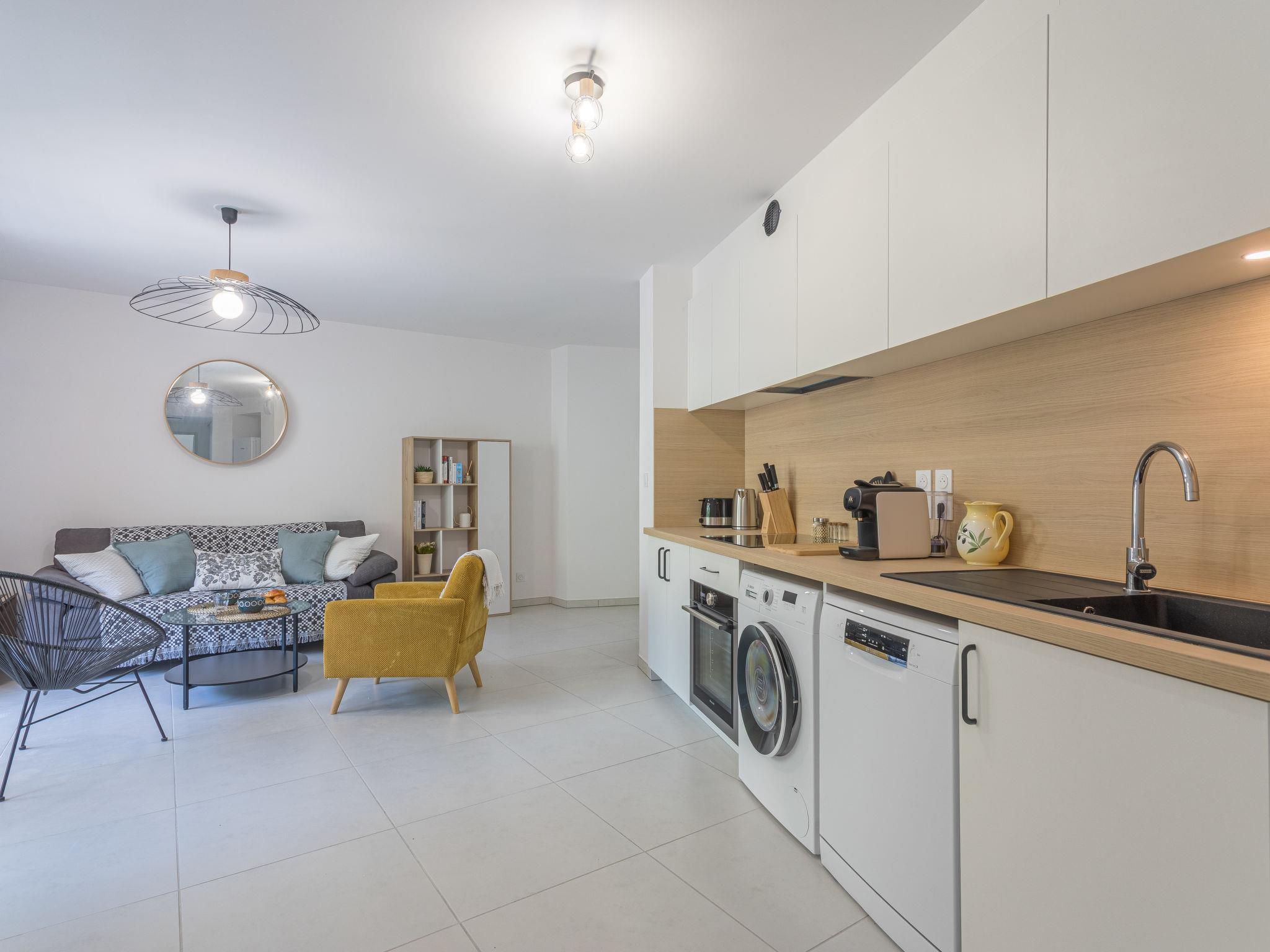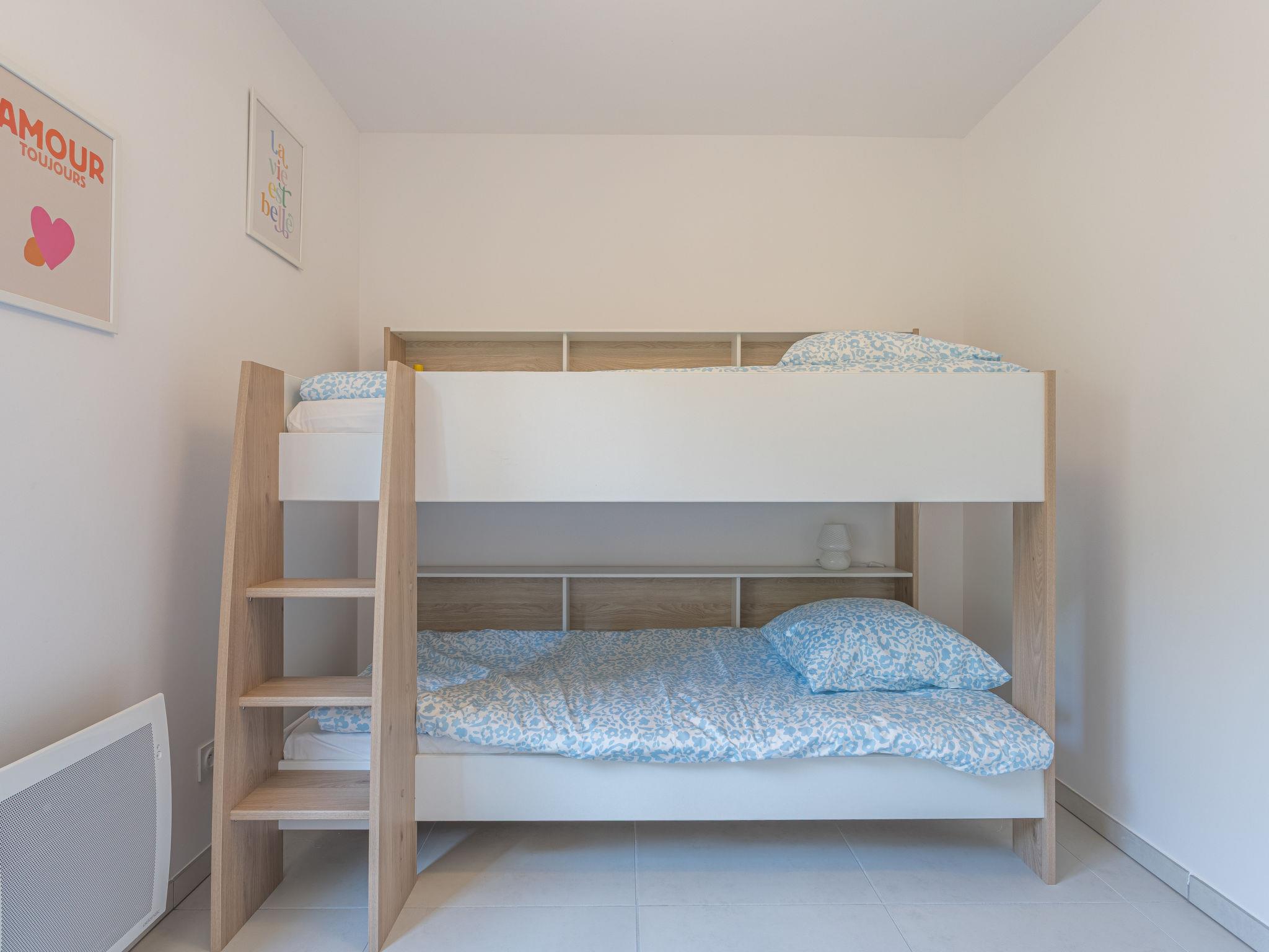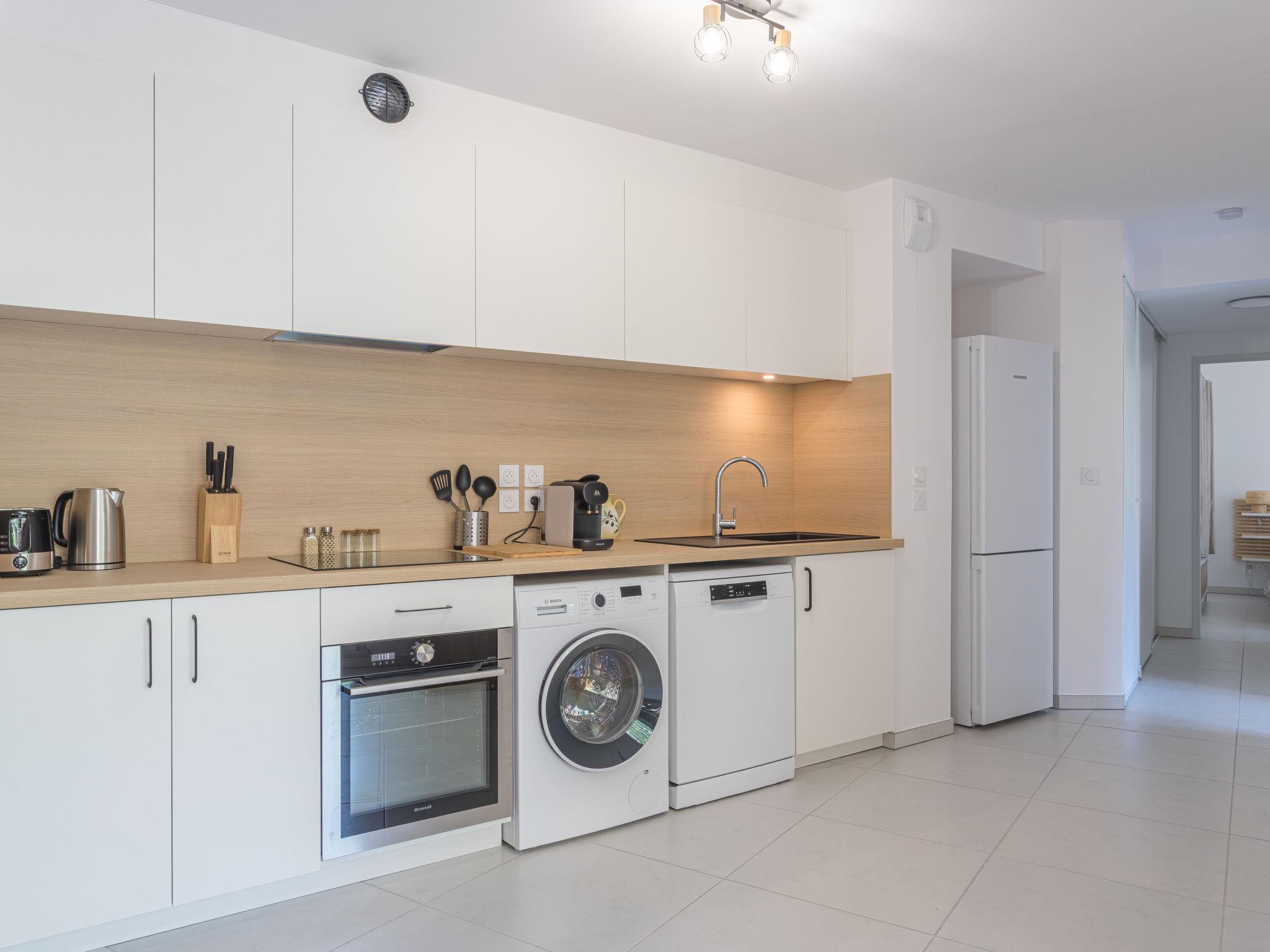 3-room apartment 50 m2 on 1st floor. Bright, comfortable furnishings: living/dining room with TV (flat screen), air conditioning. Exit to the terrace. 1 room with 1 french bed (160 cm, length 190 cm). 1 room with 1 x 2 bunk beds (90 cm, length 190 cm). Open kitchen (oven, dishwasher, 3 induction hot plates, toaster, kettle, microwave, electric coffee machine). Shower/WC. Electric heating. Terrace 8 m2, south-east facing position. Terrace furniture. Facilities: washing machine, iron, hair dryer. Internet (WiFi, free). Garage space n 2 (2 cars), height 194 cm, width 280 cm. Please note: non-smokers only. Smoke alarm. Offer by a commercial proprietor according to Art. 155, IV, CGI