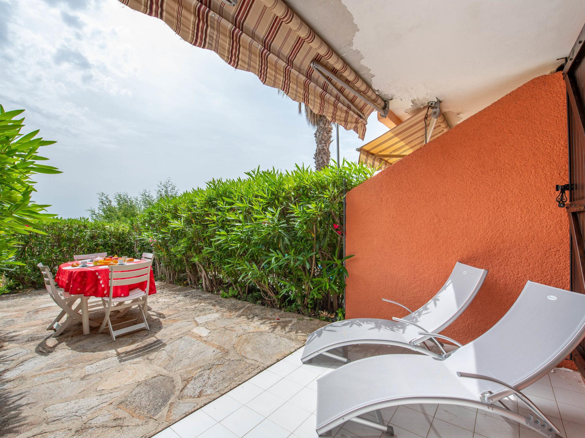 1-room studio 20 m2, on the ground floor. Beautiful furnishings: living/dining room with 1 double sofabed (160 cm, length 200 cm), TV. Sleeping alcove, 2 bunk beds (80 cm, length 190 cm). Kitchenette (2 hot plates, oven, dishwasher, toaster, kettle, freezer, electric coffee machine, Capsules for coffee machine (Dolce Gusto) extra). Bath/WC. Electric heating, boiler (150 litres). Terrace 12 m2, roofed, east facing position, patio 20 m2. Terrace furniture, deck chairs (2). Partial view of the sea and the swimming pool. Facilities: washing machine, iron, hair dryer. Internet (WiFi, extra). Parking space n 21 (fenced). Please note: 1 small pet/ dog allowed. Smoke alarm. Instead of an enclosed bedroom, some sleeping areas are located in an open-plan area (gallery, alcove, etc.). Offer by a private individual according to Art. 155, IV of CGI.
