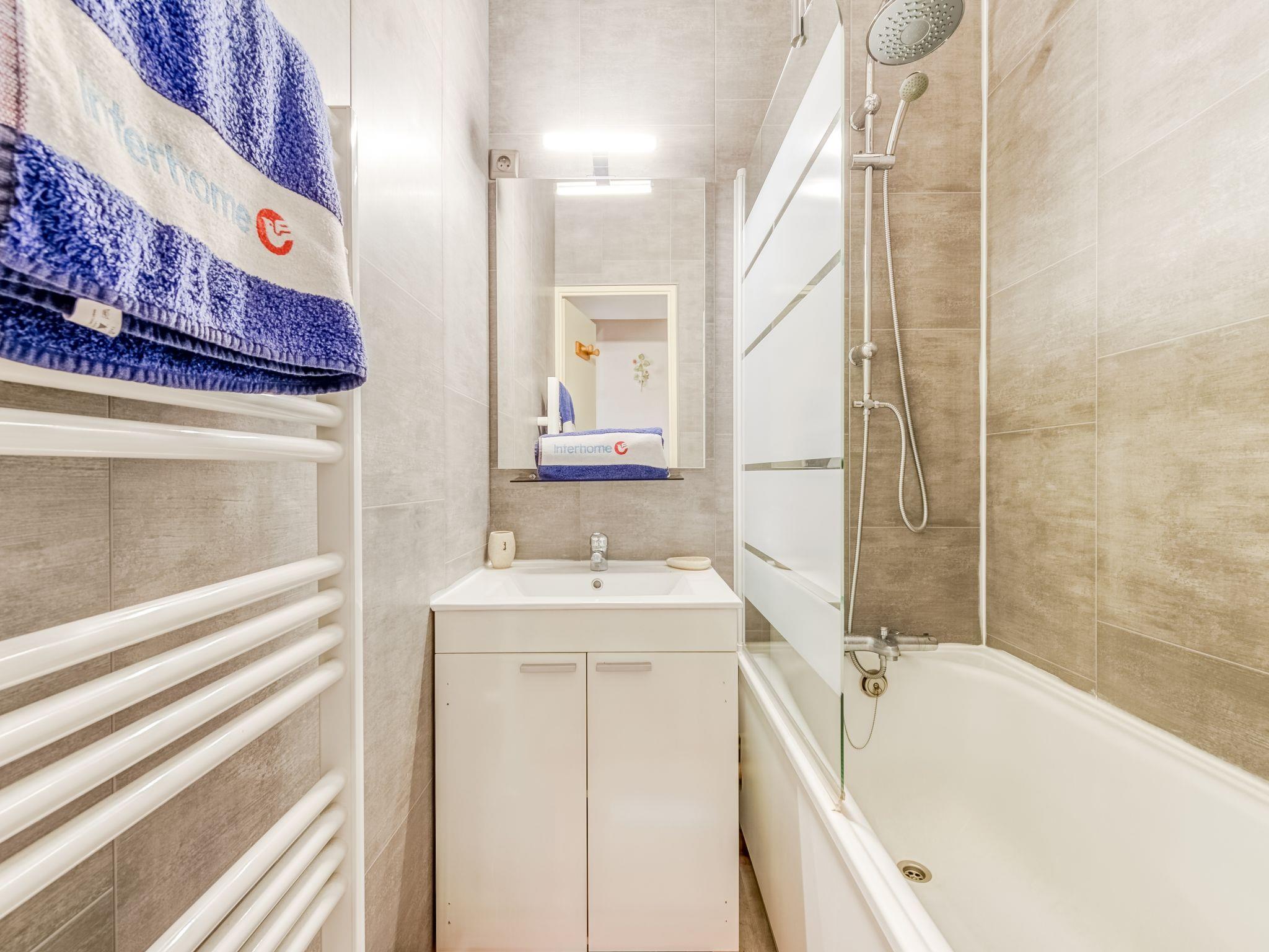 3-room apartment 35 m2 on 2 levels, on the ground floor, south-west facing position. Partly renovated in 2020, beautiful furnishings: living room with TV (flat screen), CD-player, DVD and fan. Exit to the terrace. Open kitchen (2 ceramic glass hob hotplates, toaster, kettle, microwave, grill, electric coffee machine, Capsules for coffee machine (Senseo) extra). Bathroom, sep. WC. Electric heating, boiler (150 litres). Upper floor: (steep stair), 1 room with 1 french bed (140 cm, length 190 cm). 1 room with 2 beds (80 cm, length 190 cm), fan. Terrace 18 m2, south facing position and west facing position. Terrace furniture, electric barbecue, deck chairs (2). View of the garden. Facilities: washing machine, iron, hair dryer. Internet (WiFi, free). Parking space n 10 (1 car). Please note: smoke alarm.