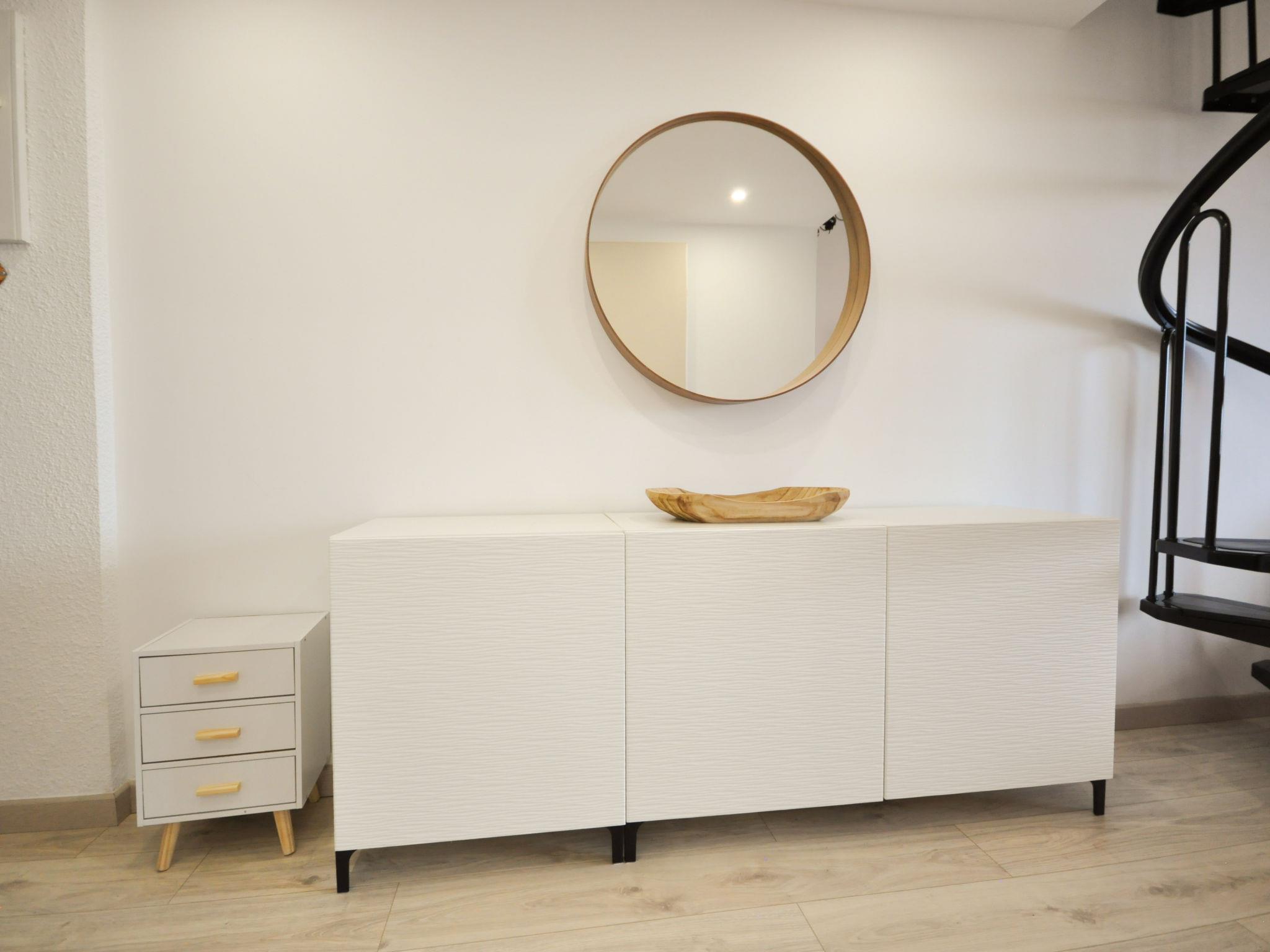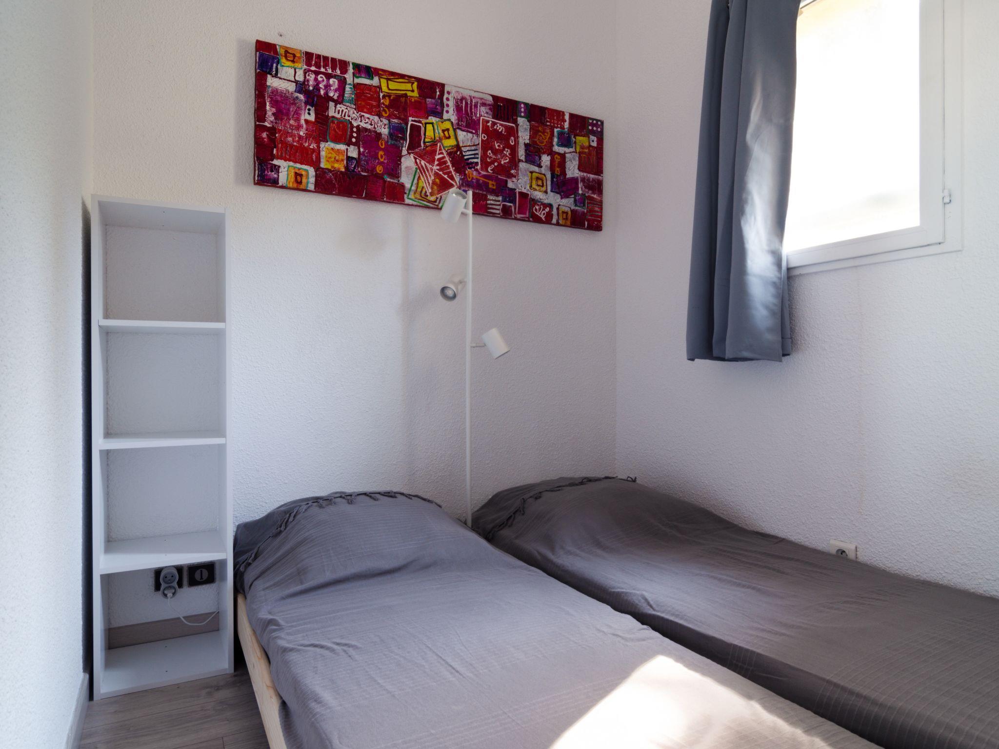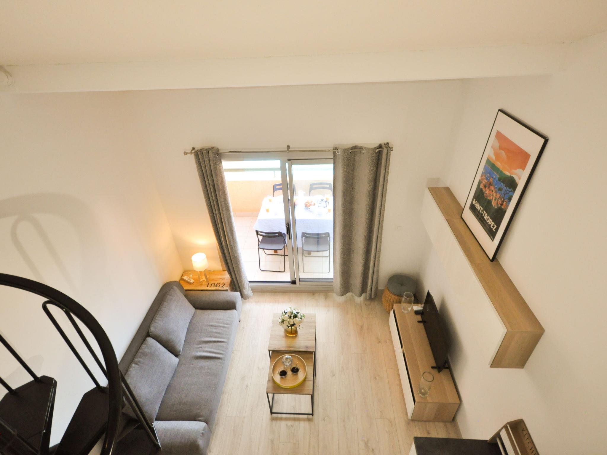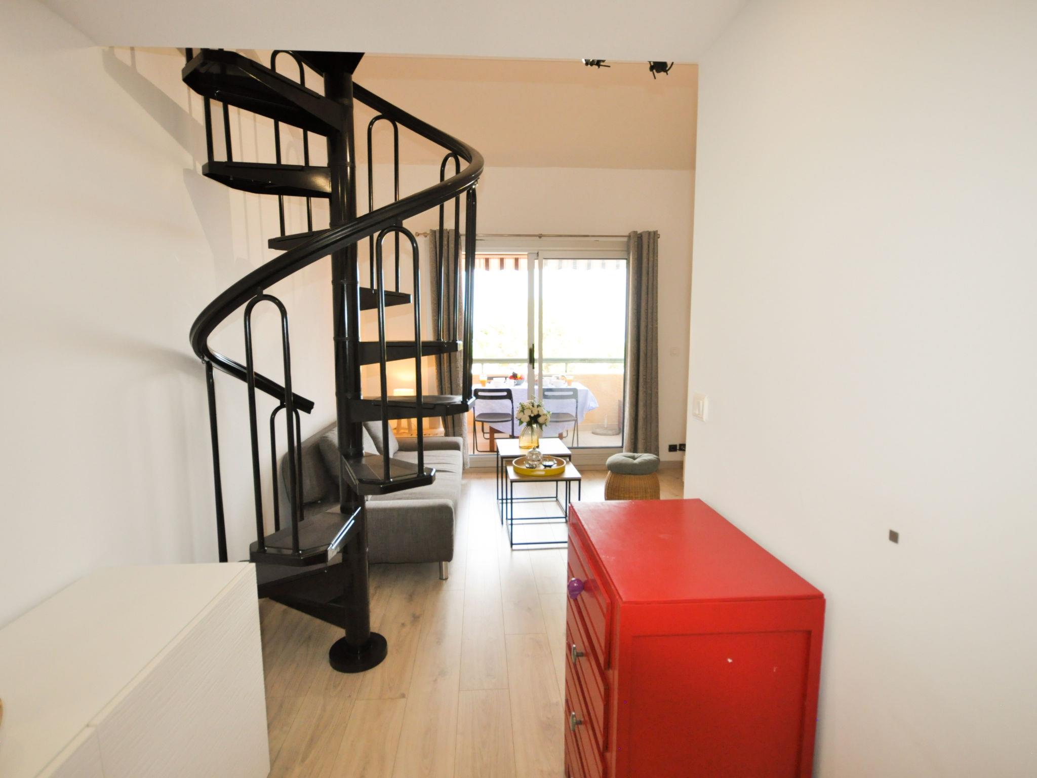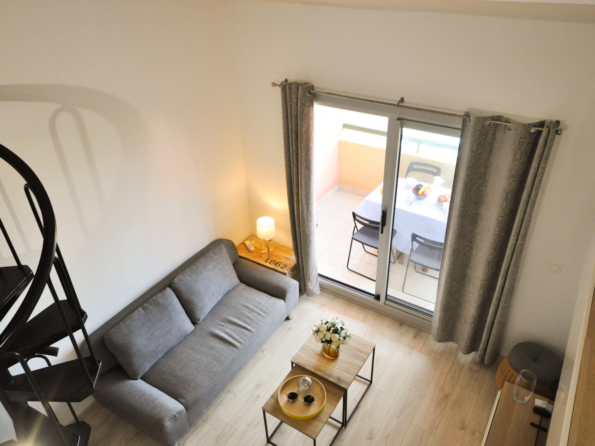 2-room apartment 24 m2 on 2 levels on 1st floor, south facing position. Fully renovated, beautiful furnishings: living room with TV (flat screen), air conditioning. Exit to the balcony. 1 small room with 1 pull-out bed (2 x 80 cm, length 190 cm). Kitchenette (2 ceramic glass hob hotplates, toaster, kettle, microwave, electric coffee machine). Shower/WC. Electric heating, boiler. Upper floor: (spiral staircase) open gallery with sloping ceilings with 1 double bed (140 cm, length 190 cm), fan. Balcony 6 m2, south facing position. Balcony furniture. Partial view of the sea and the swimming pool. Facilities: washing machine, iron, hair dryer. Internet (WiFi, extra). Parking space n 33 (fenced 1 car). Please note: smoke alarm. Instead of an enclosed bedroom, some sleeping areas are located in an open-plan area (gallery, alcove, etc.). Offer by a private individual according to Art. 155, IV of CGI.