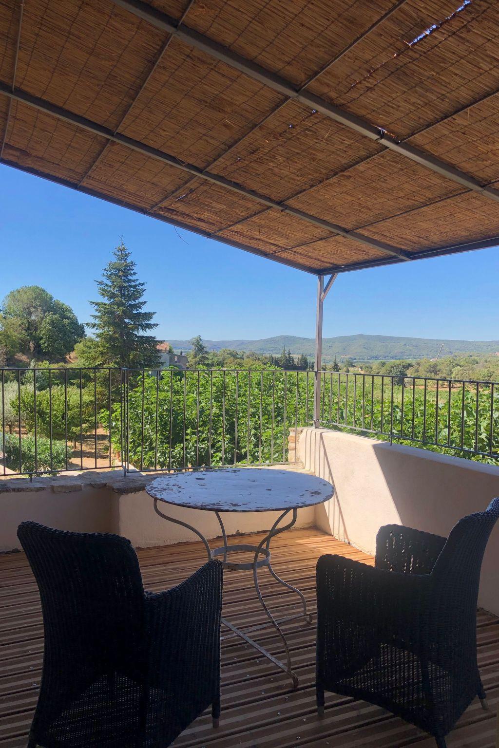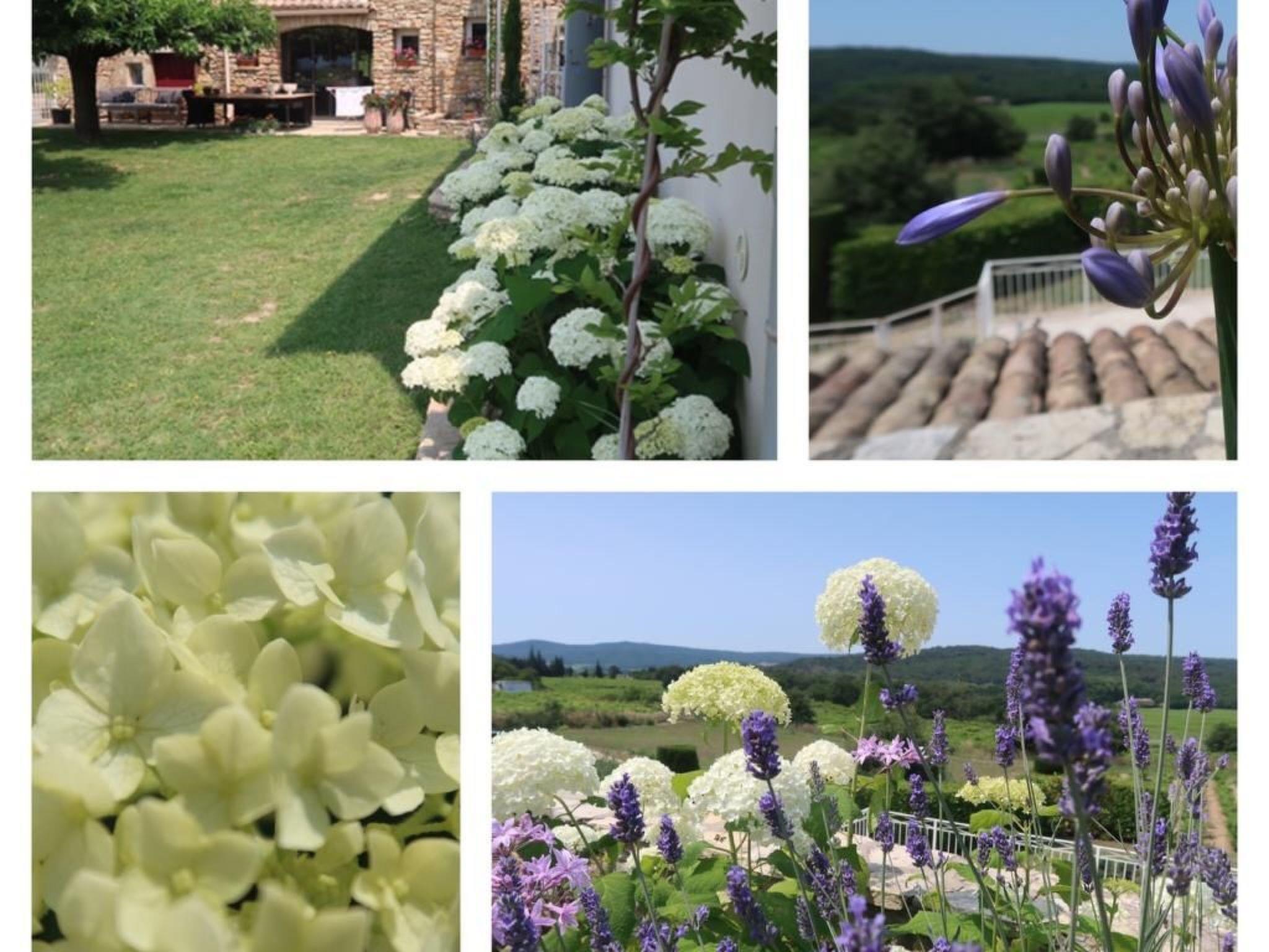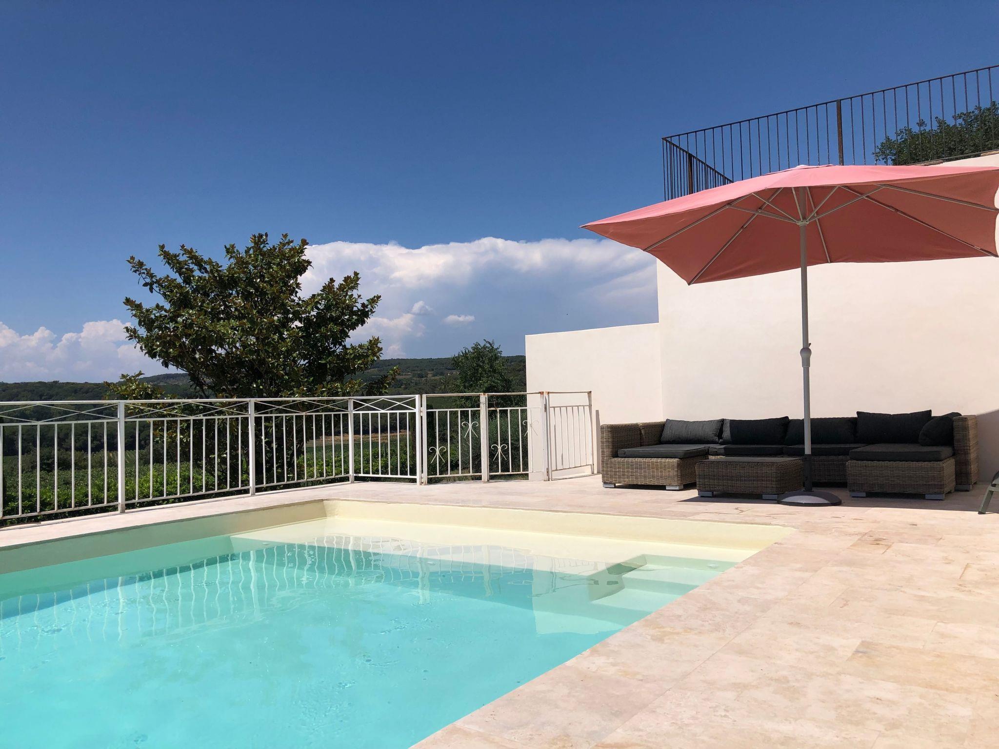 The gîte has a terrace with a table and chairs to enjoy a glass or a meal. From the terrace you have a beautiful view over the valley and the setting sun. A little lower down, the swimming pool is shared with the guests (adults only) of the other gîte. There are also several spots in the garden and fruit orchard where you can enjoy the singing of the cigales.