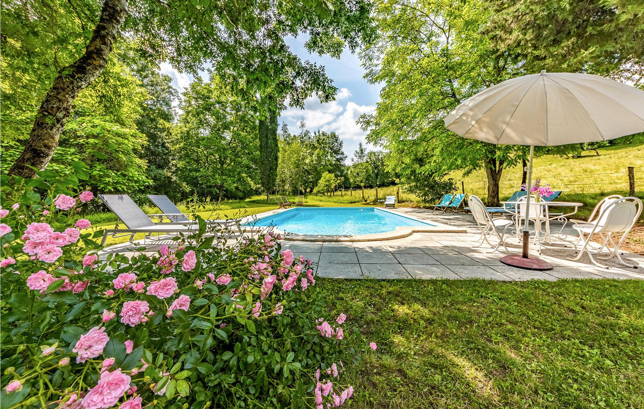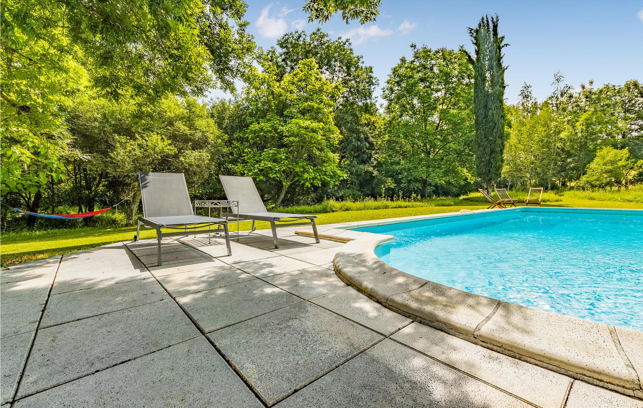 Dyk ned i den forfriskende saltvandspool omgivet af grønne, rolige landskaber. Brug den skyggefulde terrasse til hyggelige måltider eller nyd solen i hængekøjen under træerne. Prøv et spil bordtennis eller boule i gården, mens børnene udforsker de brede grønne områder.