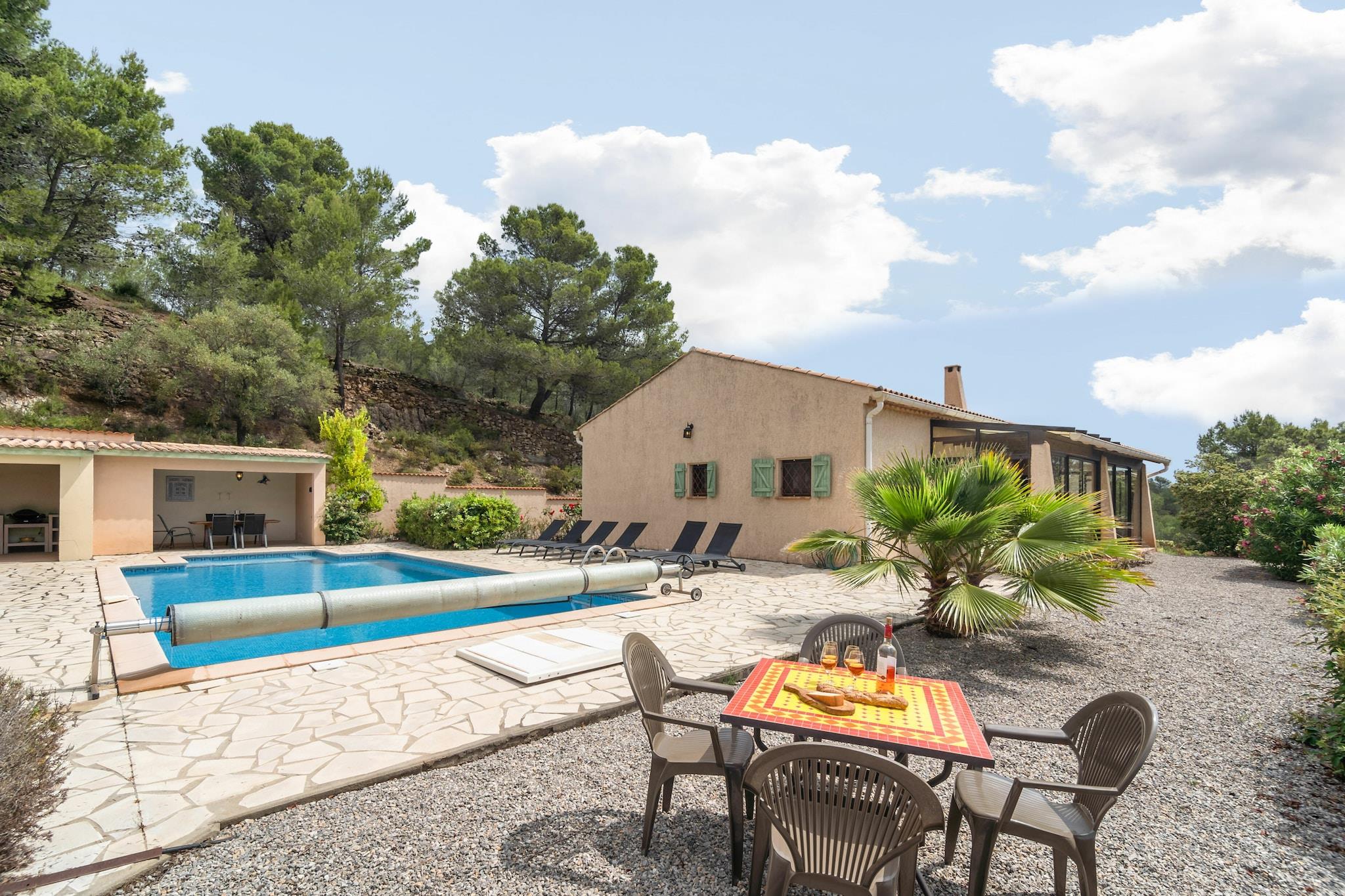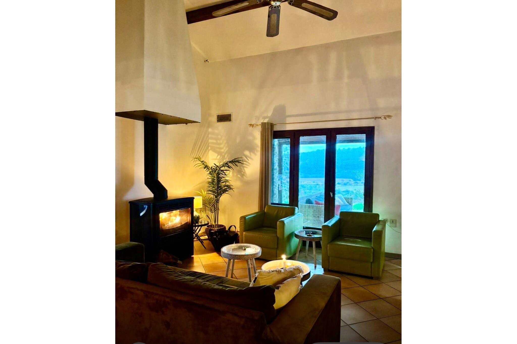 Beliggende på en bakketop i den charmerende vinlandsby Cébazan tilbyder Villa Impériale total privatliv og en betagende udsigt over vinmarker og et nærliggende naturreservat. Omgivet af 13.500 m² frodige haver fyldt med roser, oliventræer og palmer, har denne villa med tre soveværelser komfortabel plads til seks personer. Indenfor finder du airconditionerede rum, et fuldt udstyret køkken, en hyggelig opholdsstue med pejs og et badeværelse med både badekar og bruser. Kun 650 m væk er landsbyens bageri perfekt til friske morgenbaguetter, mens den livlige købstad Saint-Chinian ligger få minutter væk for shopping, vinsmagninger og spisning. Der er en charmerende restaurant med en hyggelig udendørs terrasse beliggende 10 minutters gang fra huset, hvor der serveres hjemmelavede retter, herunder dem, der tilberedes på trækulsgrillen. Tilbring solrige dage med at slappe af ved den 10×5 m private pool med trappe, eller slap af under den skyggefulde terrasse. Udendørskøkkenet - med grill og køleskab - gør udendørs måltider til en fornøjelse. Når aftenen falder på, kan du nippe til lokal vin under en stjerneklar himmel. Fra din dør fører markerede vandrestier gennem vinmarker og skove, ideelt for naturelskere. For de eventyrlystne kan du nyde mountainbiking, kanosejlads, golf eller en naturskøn bådtur langs Canal du Midi. Kæledyr er varmt velkomne her, med endeløse stier til lange gåture lige fra villaen. Nærliggende Saint-Chinian byder på kæledyrsvenlige udendørscaféer og markeder, hvor din firbenede ven kan deltage i fornøjelsen. Middelhavskysten, kun 30 minutter væk, byder på strækninger af sandstrande, der er perfekte til gåture langs havet med din hund, plus fiskerestauranter, hvor kæledyr kan slappe af ved din side.