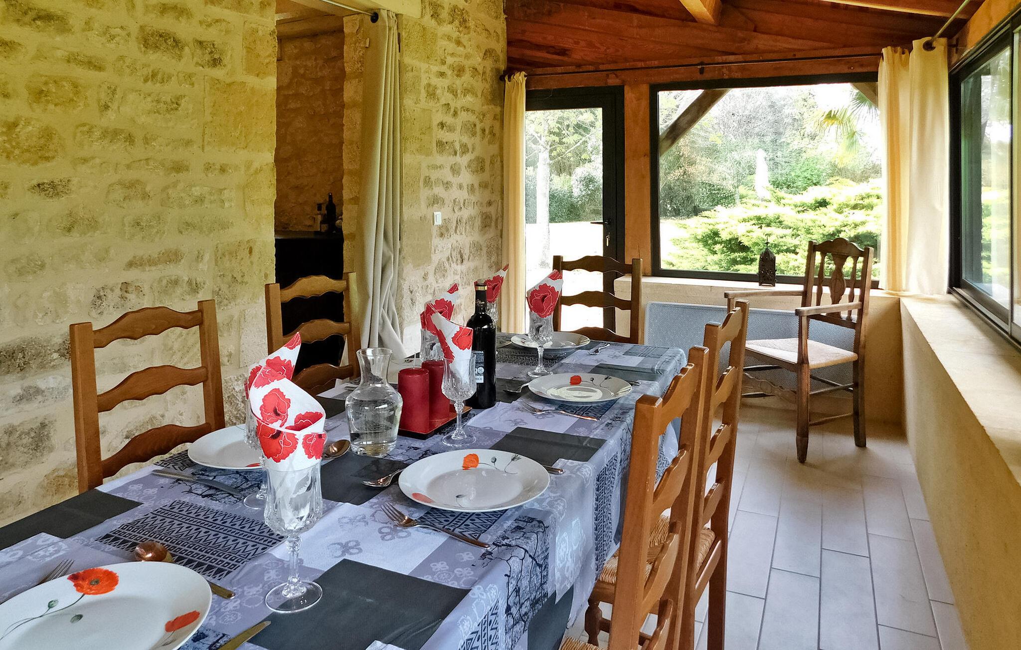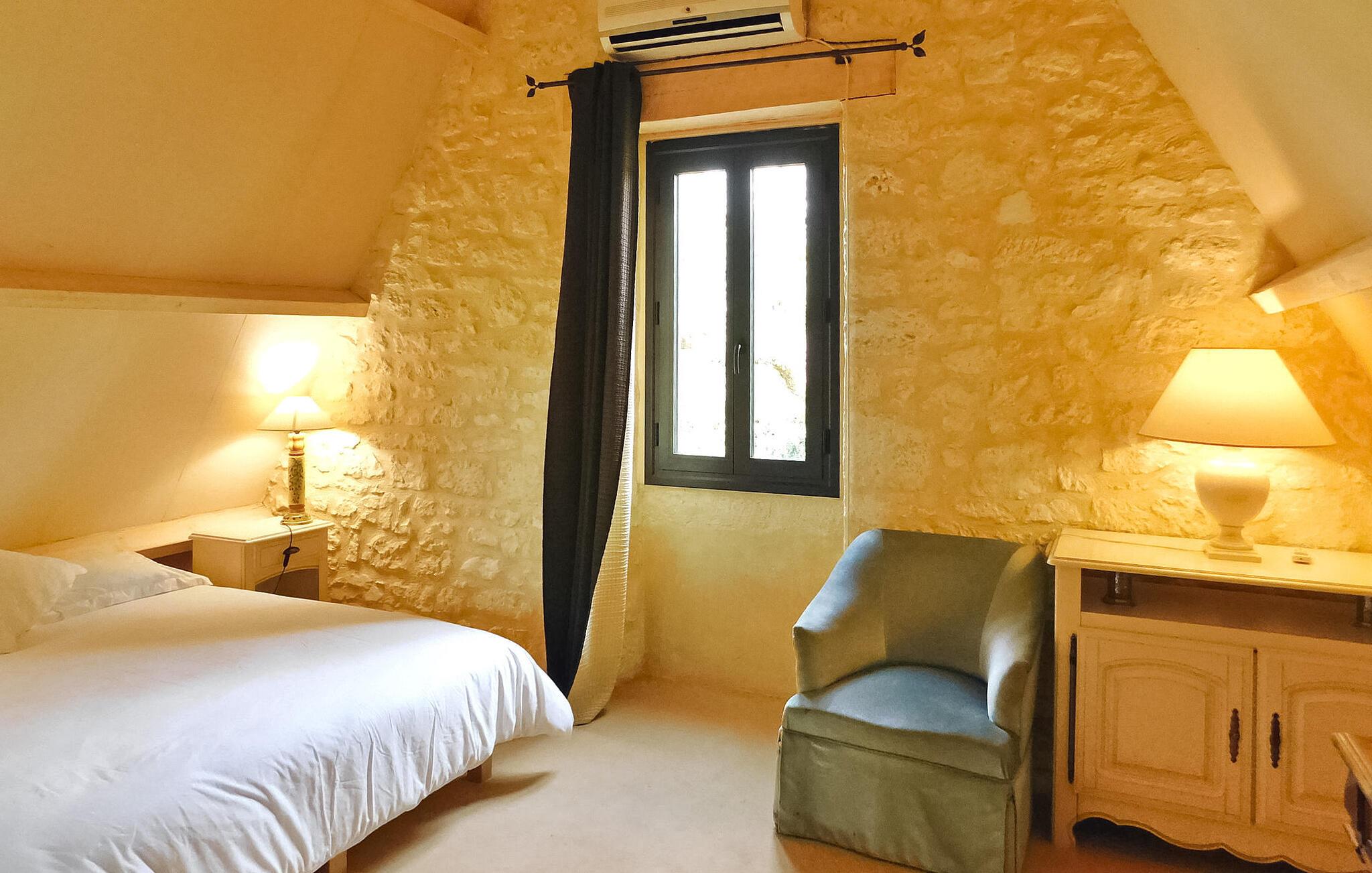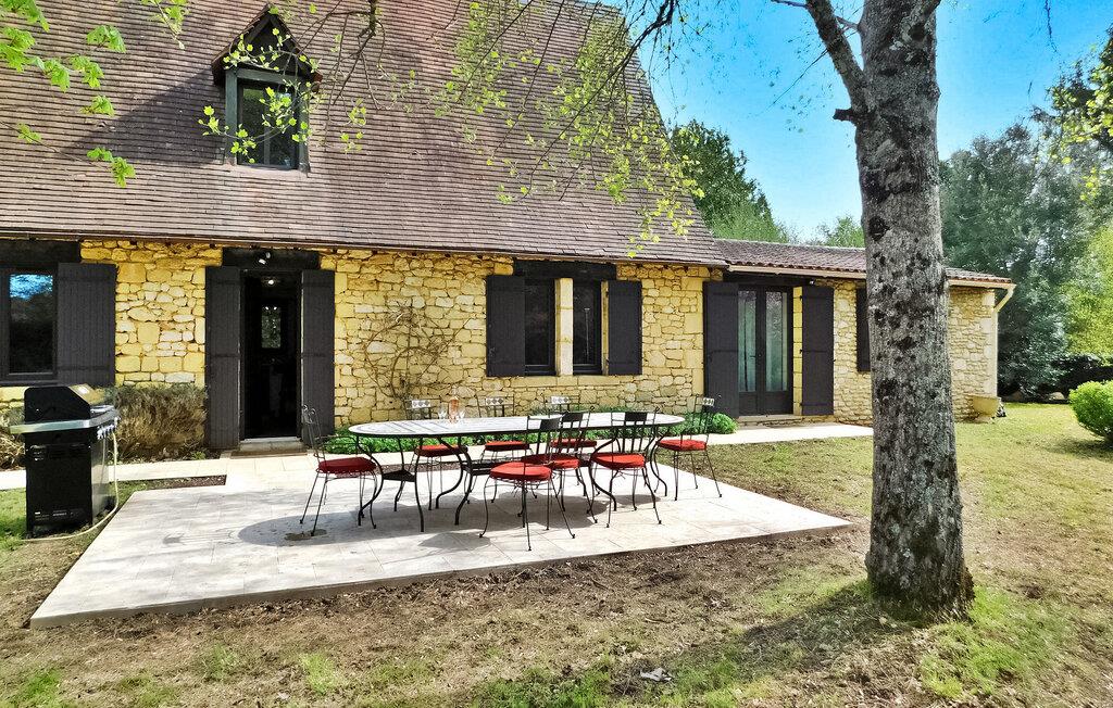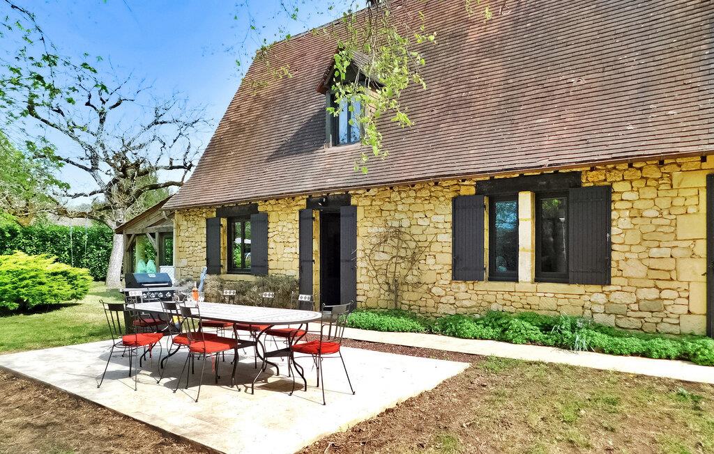 Dette karakteristiske landskab ligger mellem La Roque Gageac og Domme og er et ideelt udgangspunkt for at besøge Dordognes vigtigste turistattraktioner. Stueetagen byder på et veludstyret køkken med en central ø og et behageligt opholdsrum sammen med tre af soveværelserne, inklusive et enkeltværelse egnet til et barn. Ovenpå, tilgængelig via trætrapper, er yderligere to soveværelser, som nyder godt af aircondition, og et badeværelse. Udendørsområdet byder på græsklædte og blomstrede rum foran og bagved, en brolagt terrasse med udendørsmøbler og legeredskaber, herunder en gynge og rutsjebane. En privat opvarmet pool (10m x 5m) er en del af ejendommen, som i øjeblikket er sikret med en alarm, men som snart skal erstattes af et aftageligt låg, der giver både sikkerhed og varme, som kan åbnes helt til svømning, mens nattemperaturen opretholdes. Feriehuset er beliggende på landet, men ikke afsondret, i et fredeligt boligområde ikke langt fra byerne La Roque Gageac, Cenac og Saint-Julien, Domme.