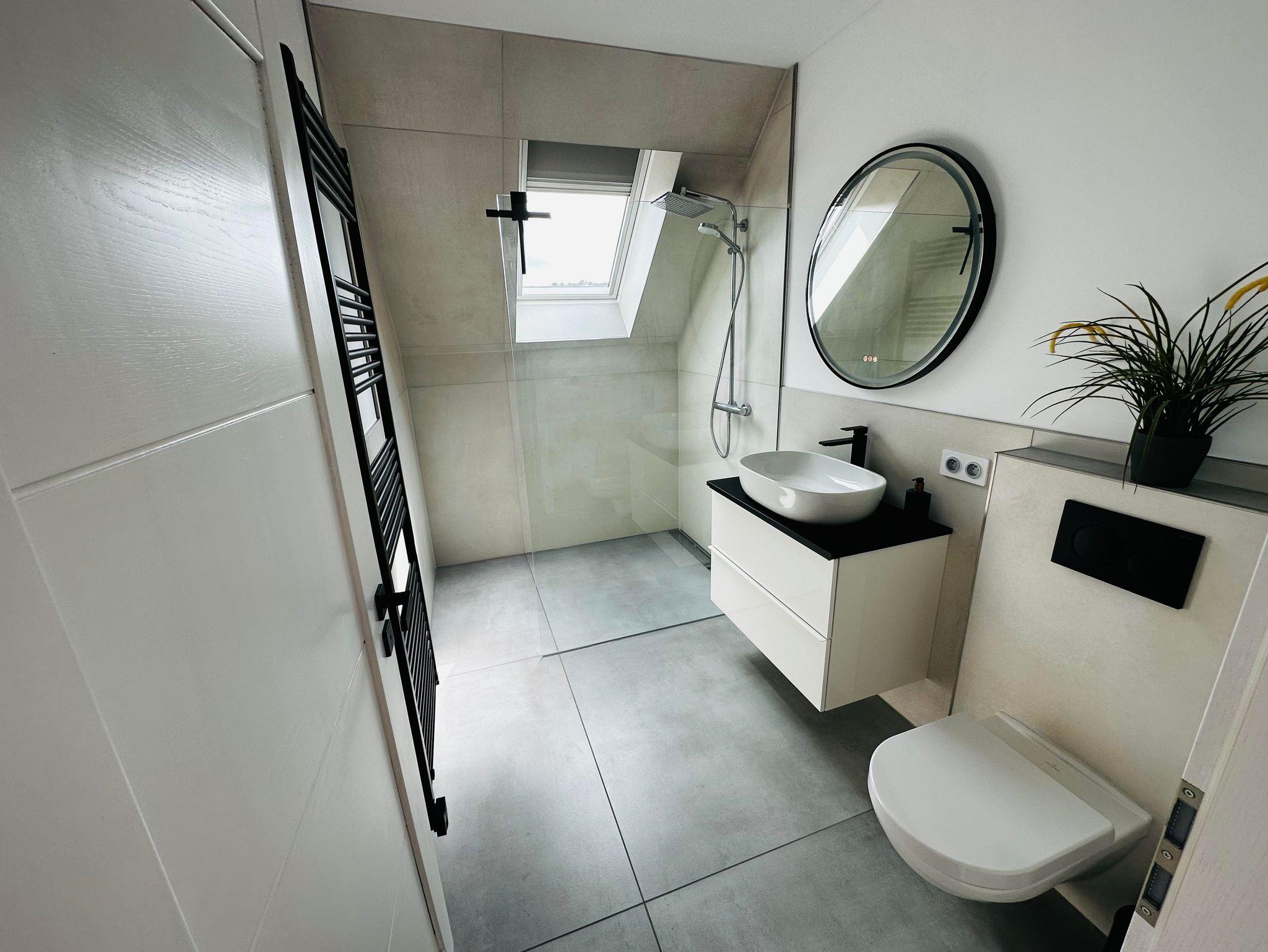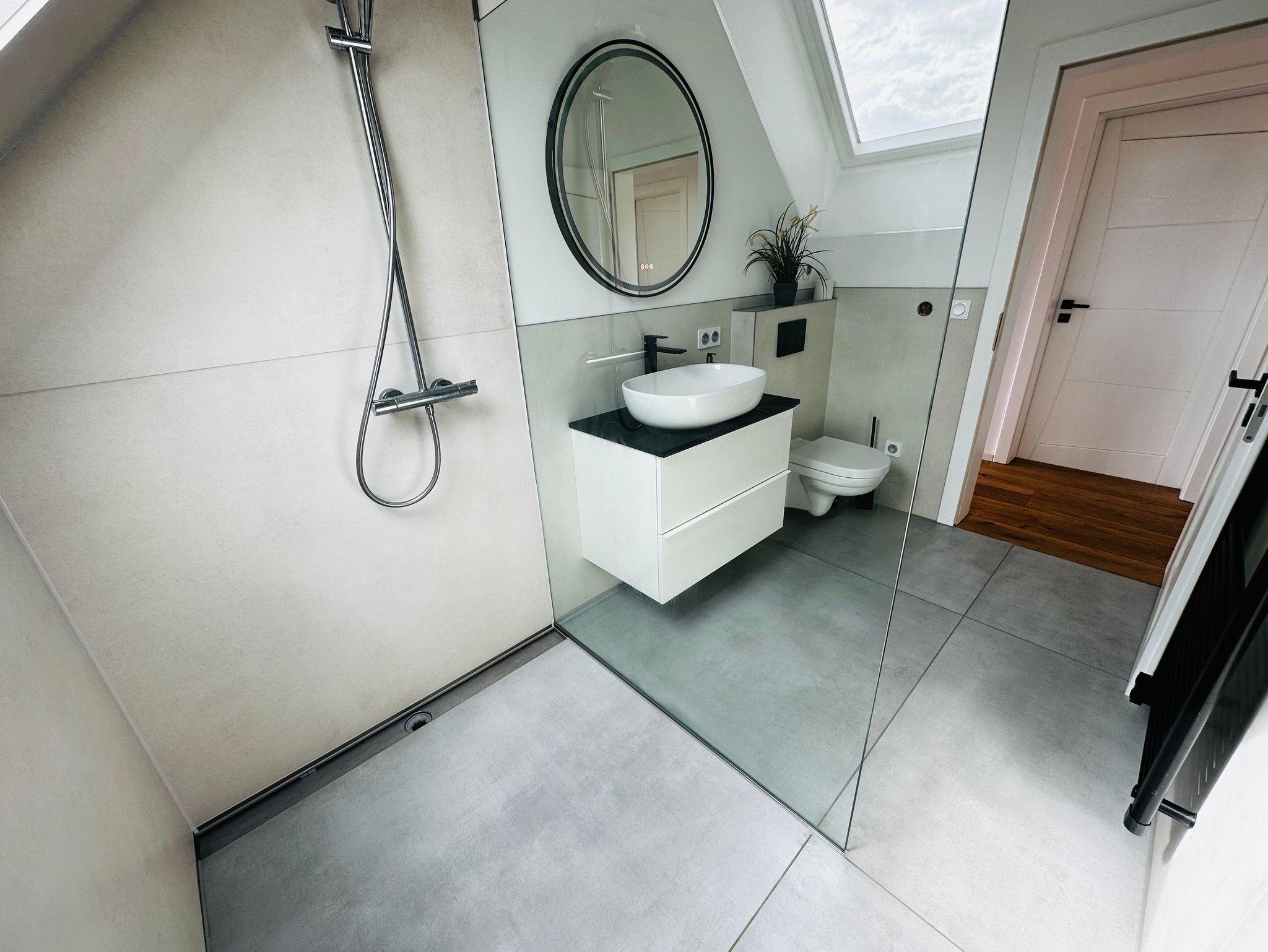 Das moderne, hochwertig ausgestattete, tageslichtdurchflutete Badezimmer verfügt über eine großzügige, ebenerdige Dusche und eine Toilette.