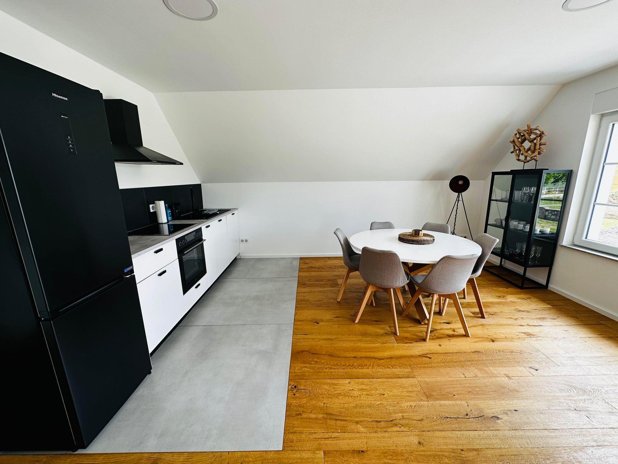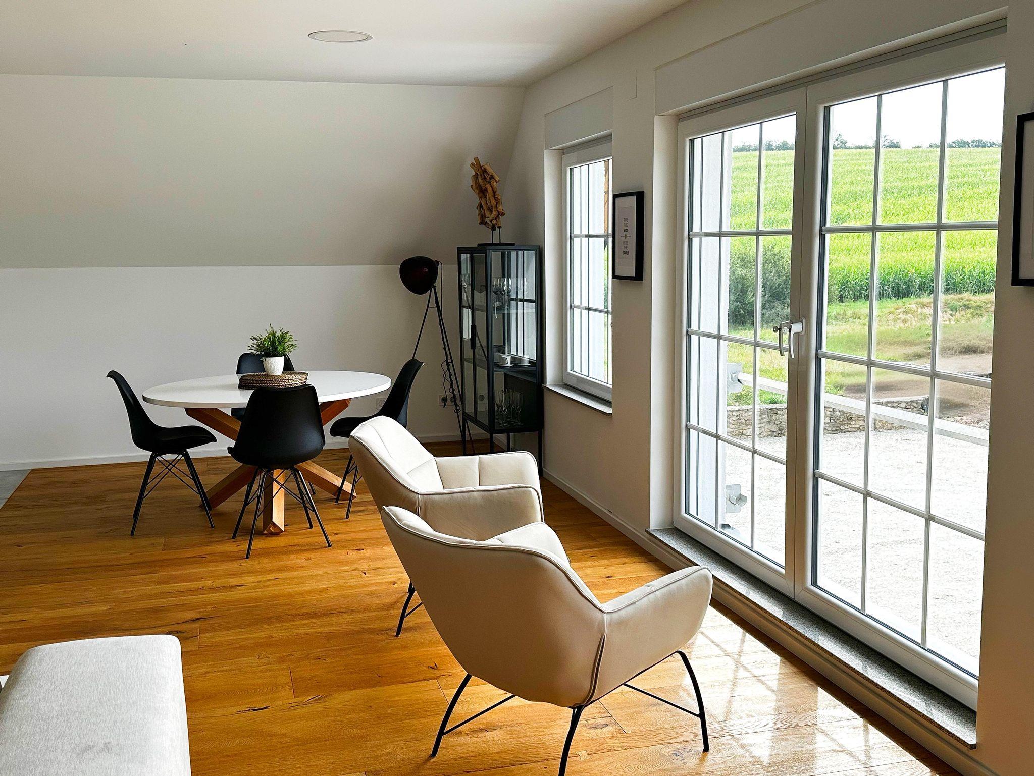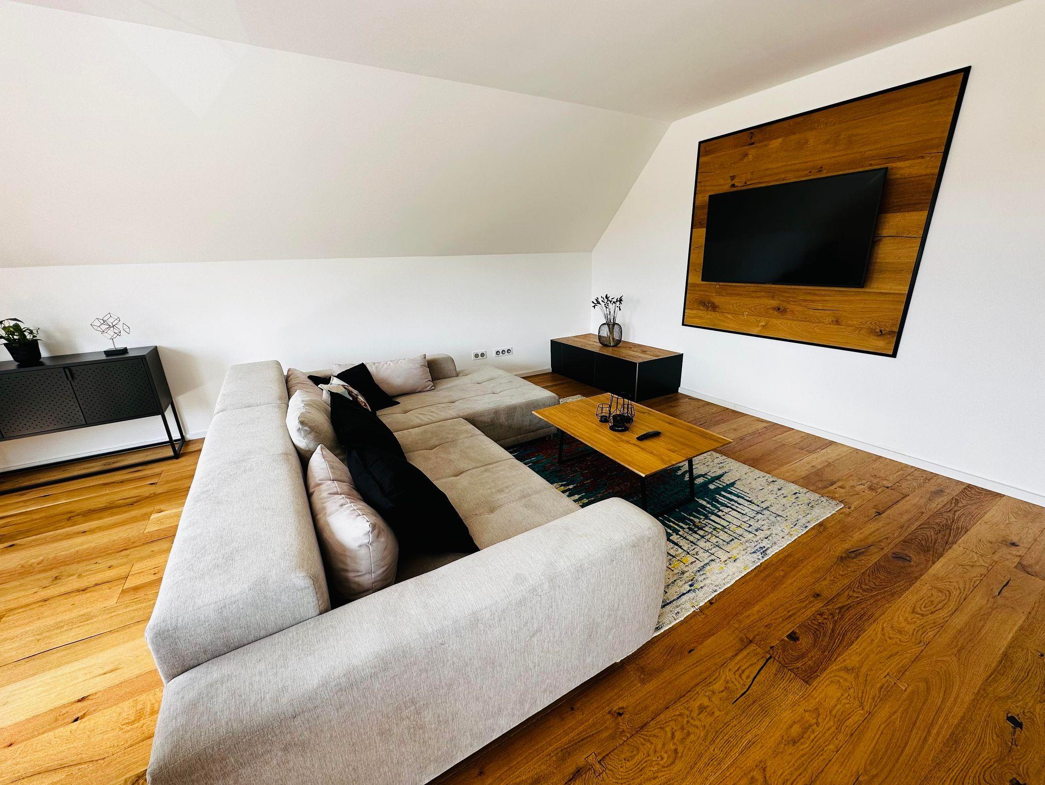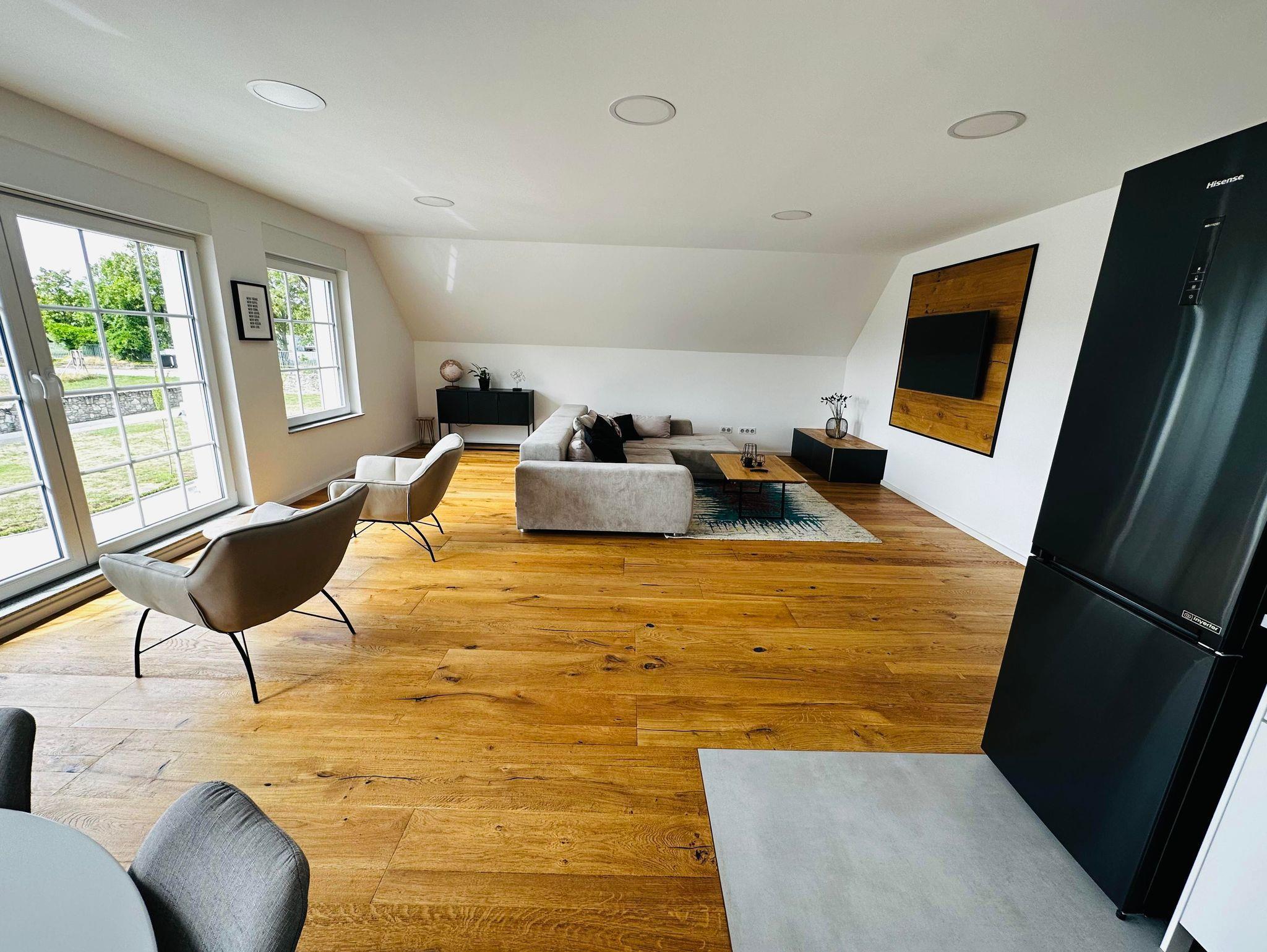 Die Wohnung erstreckt sich auf großzügigen 70qm oberhalb der Garage in einer kompletten Haushälfte und verfügt über einen eigenen Eingang. Aufgrund der massiven Bauweise und der modernen Architektur ist man in der Ferienwohnung komplett ungestört und kann die Ruhe und Natur genießen.