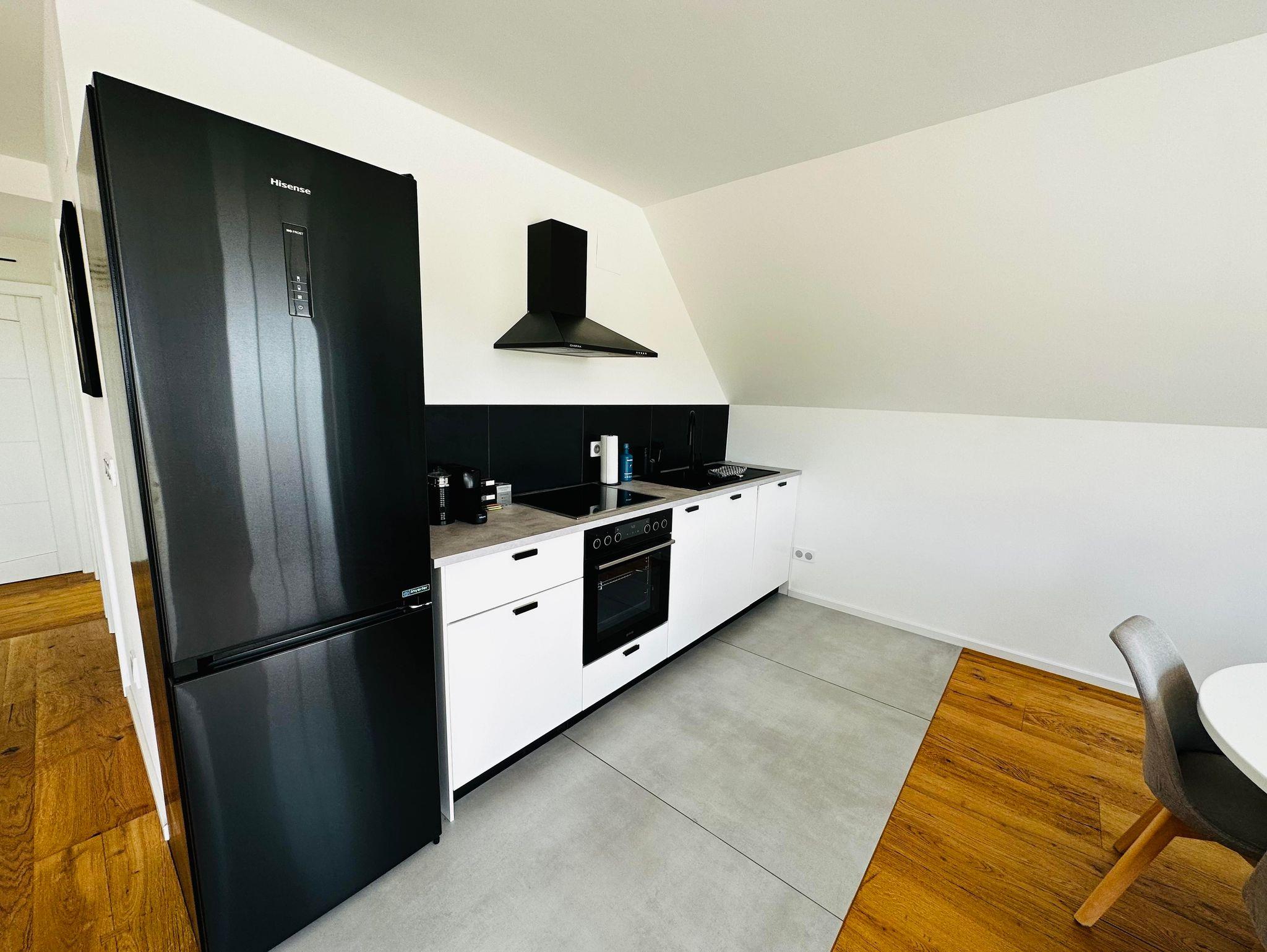 Die offene, voll ausgestattete moderne Küche mit Herd und Backofen lädt zum Kochen ein.Sie verfügt außerdem über einen großen Kühlschrank mit Gefrierbereich, eine Spülmaschine, einen Wasserkocher, einen Toaster, eine Kaffeemaschine mit Milchaufschäumer, Geschirr und Besteck für 6 Personen und hochwertige Kochutensilien. Eine Grundausstattung an Gewürzen ist ebenfalls vorhanden.