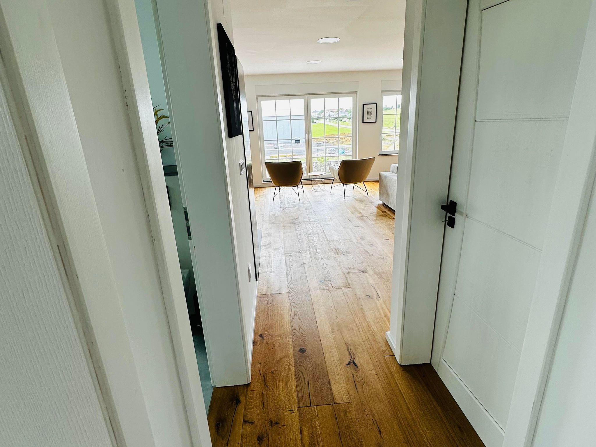Inmitten einer atemberaubenden Landschaft gelegen, bietet unsere Wohnung einen spektakulären Ausblick auf das umliegende Land. Hier können Sie die Ruhe und Abgeschiedenheit unseres freistehenden Hauses mit großer Entfernung zu den Nachbarn genießen.