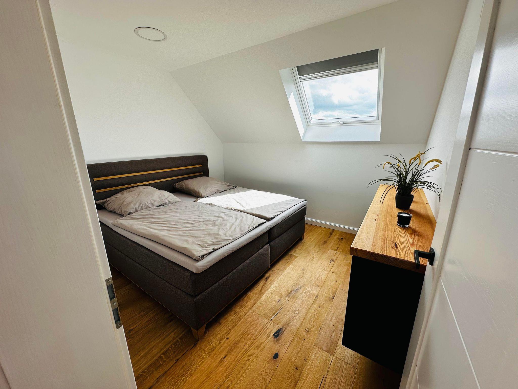 Das separate Schlafzimmer ist mit einem großzügigen Boxspringbett (200x200cm) ausgestattet und bietet Ihnen erholsame Nächte. Das Dachfenster bietet Abends einen wunderschönen Blick in den Sternenhimmel. Eine kleine Abstellkammer bietet zusätzlichen Stauraum.